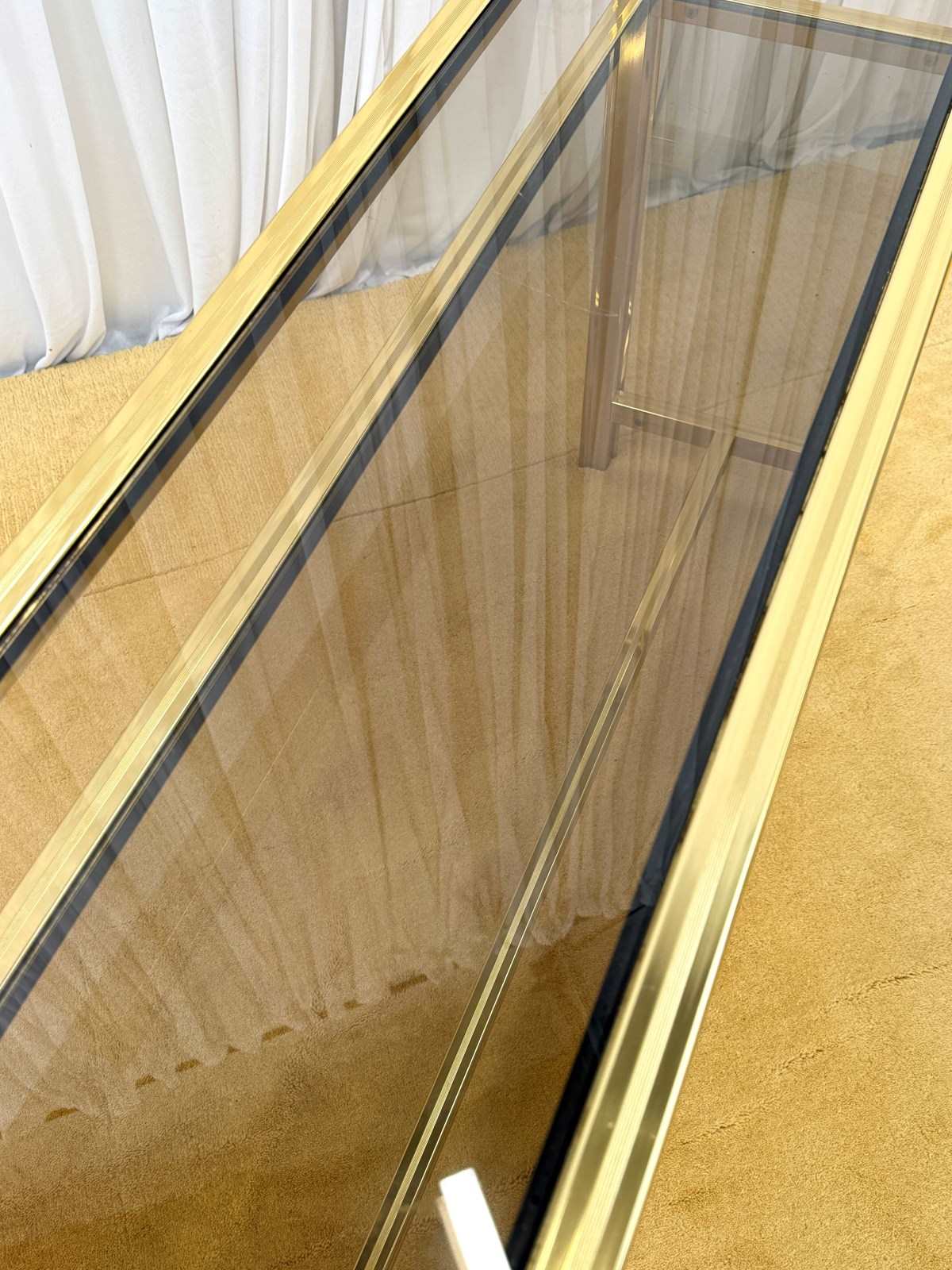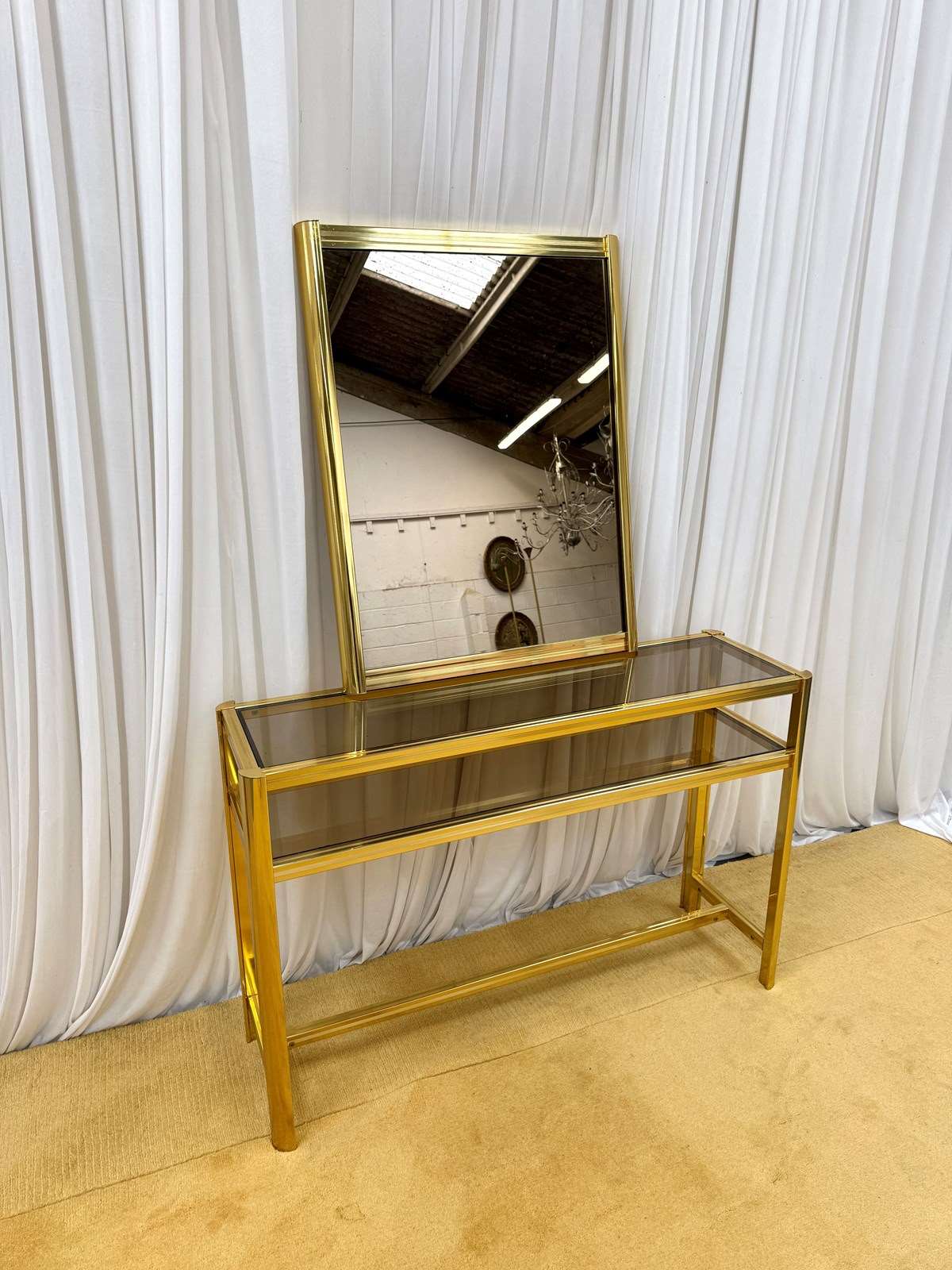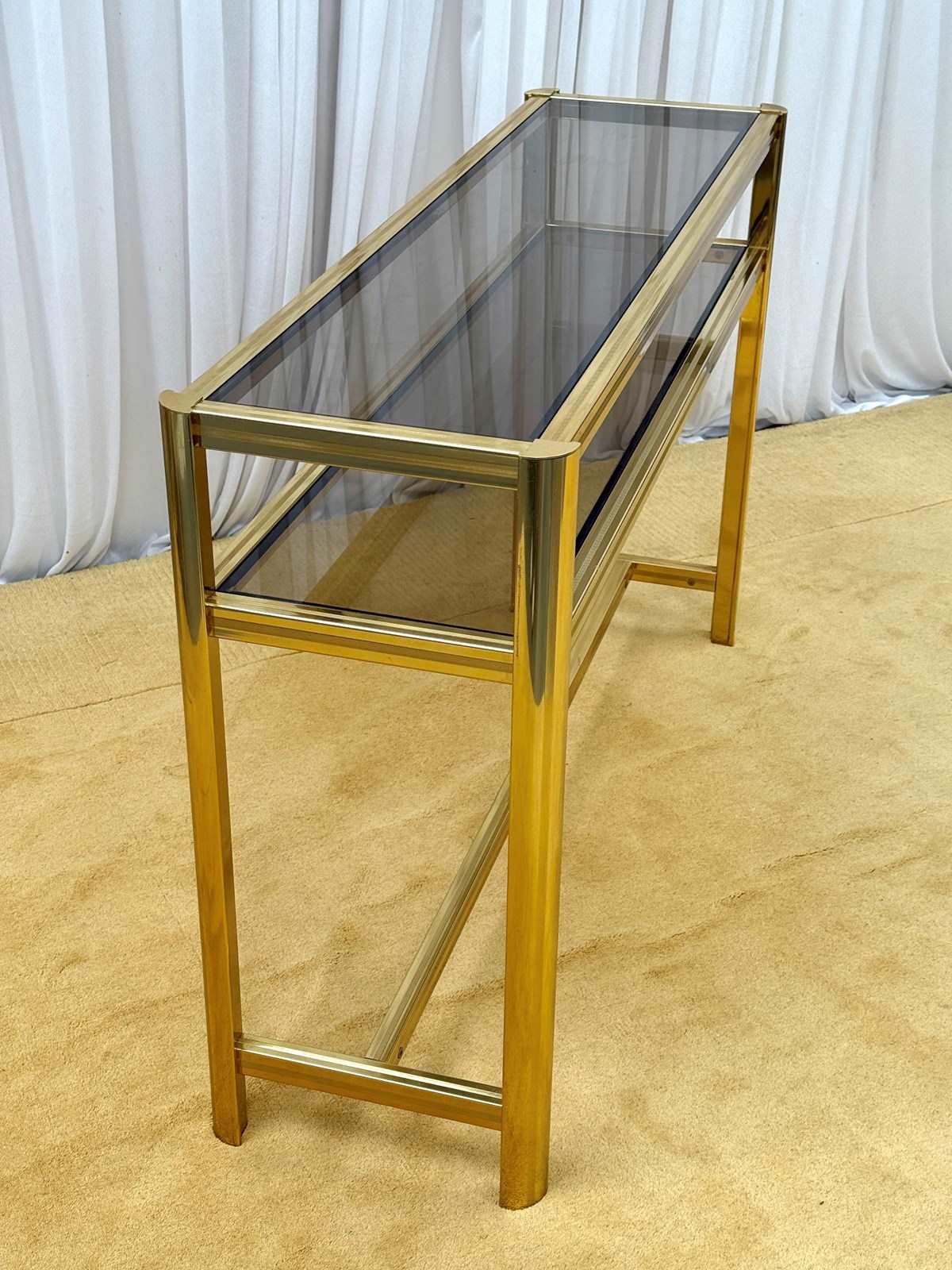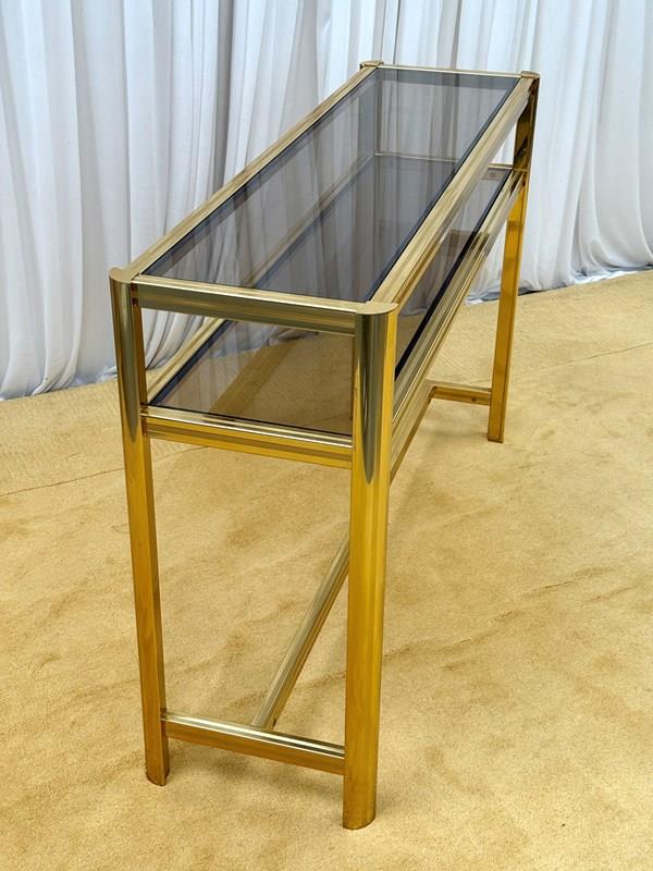 A striking and highly collectible 1970s console table and matching wall mirror set by renowned French designer Pierre Vandel. Known for his sleek, modernist aesthetic, this set perfectly captures the refined glamour of the era.The console features a clean-lined metal frame with a rich gold-tone powder-coated finish, paired with a sophisticated smoked glass top and lower shelf. The tinted glass adds depth and contrast, enhancing the overall elegance of the piece.