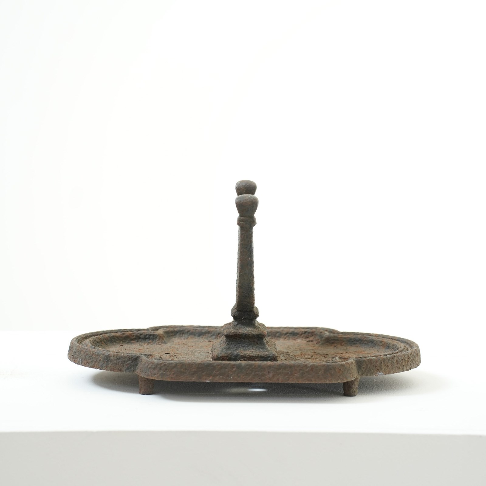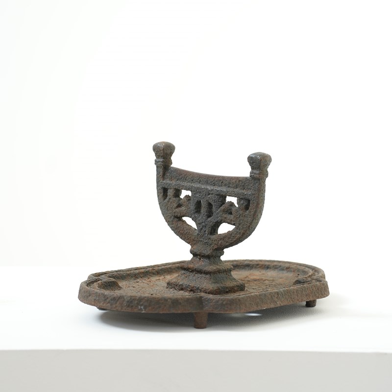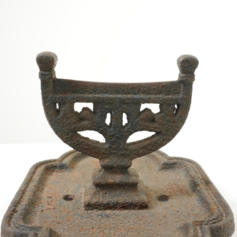 Victorian cast iron boot scraper featuring elegant uprights and a deep, cartouche tray base with a decorative scalloped rim.