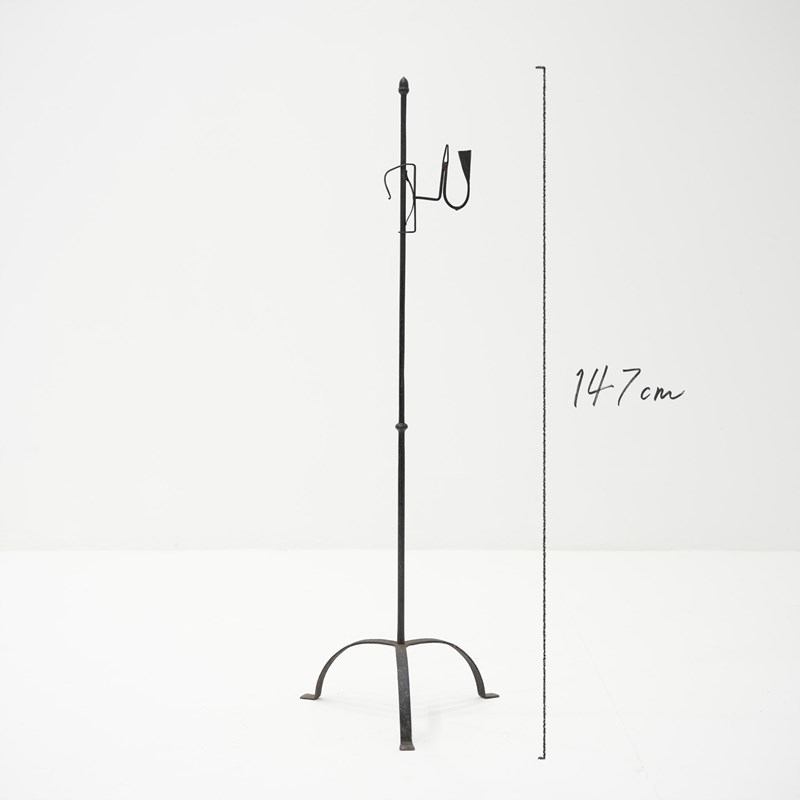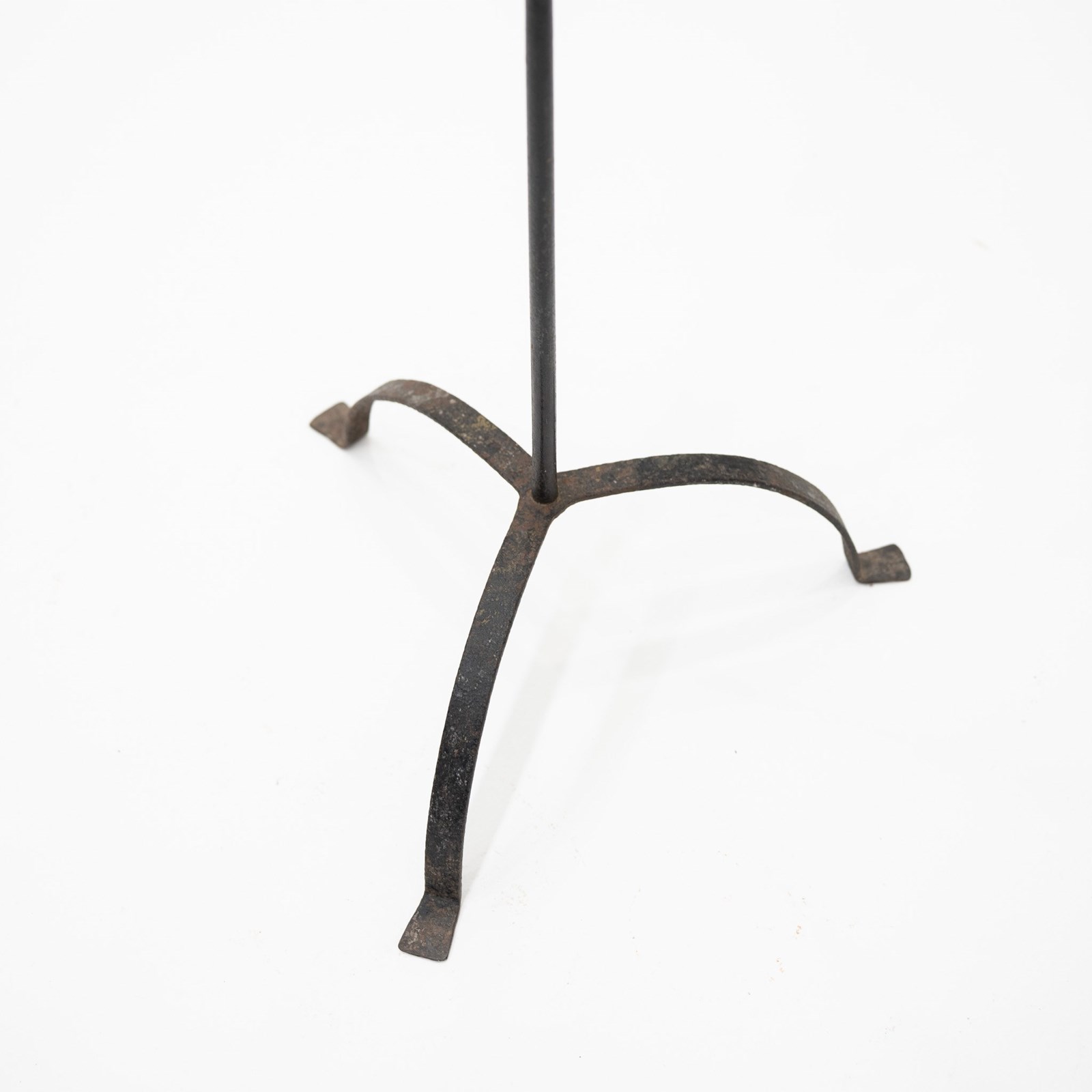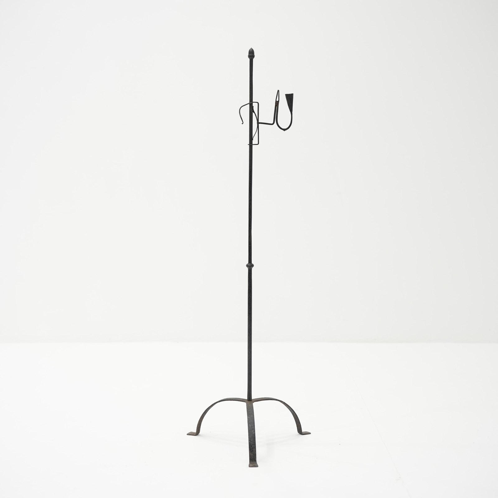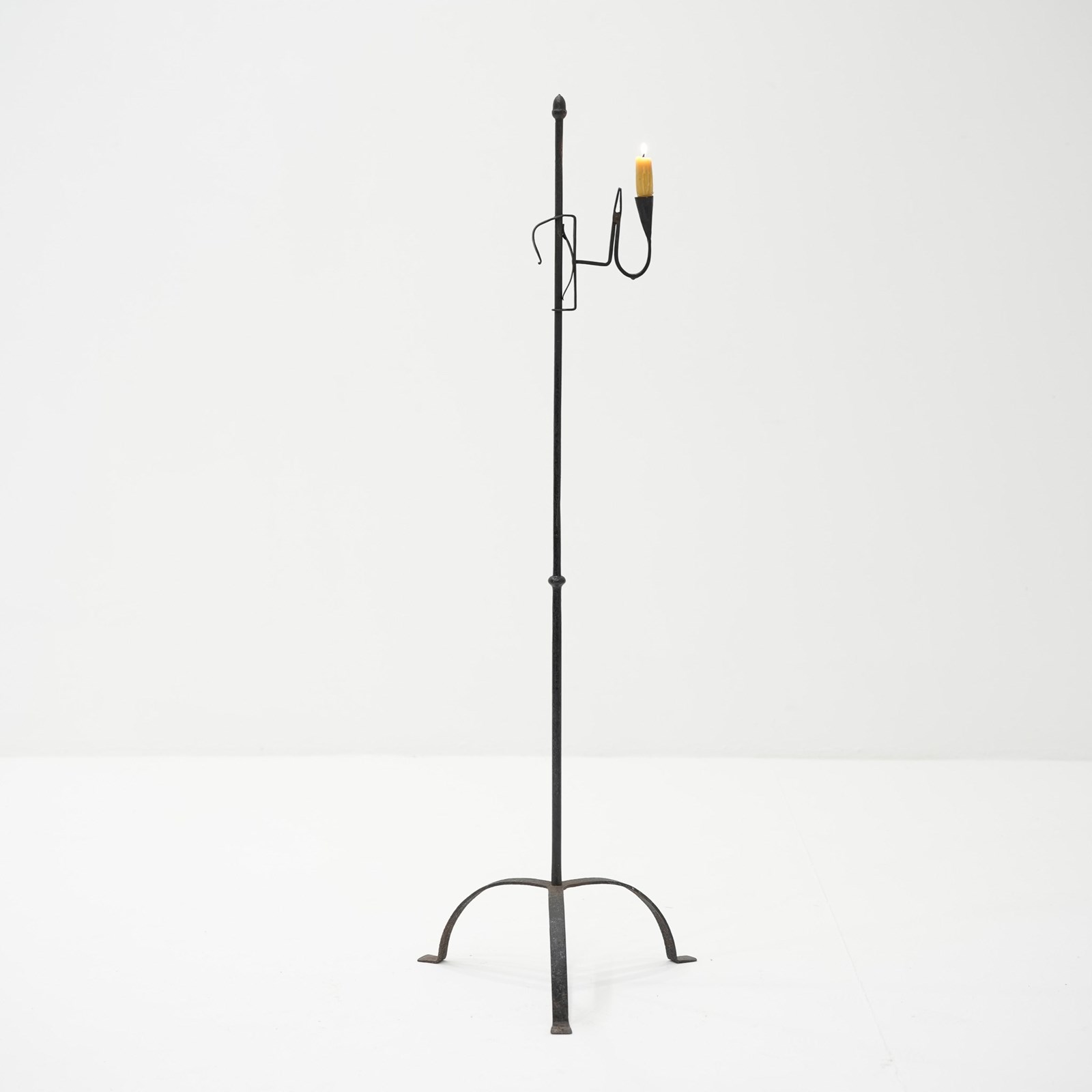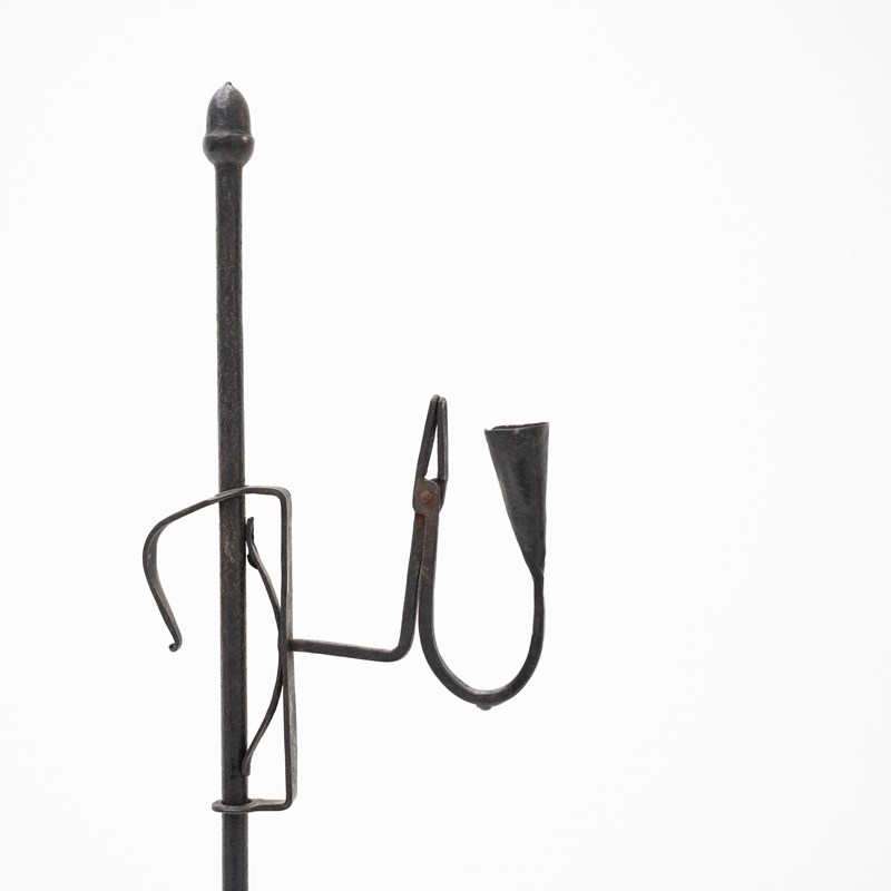18th Century floor standing wrought iron rush light, with candle holder and decorative acorn finial. Easily adjustable in height. A lovely early piece of primitive lighting.