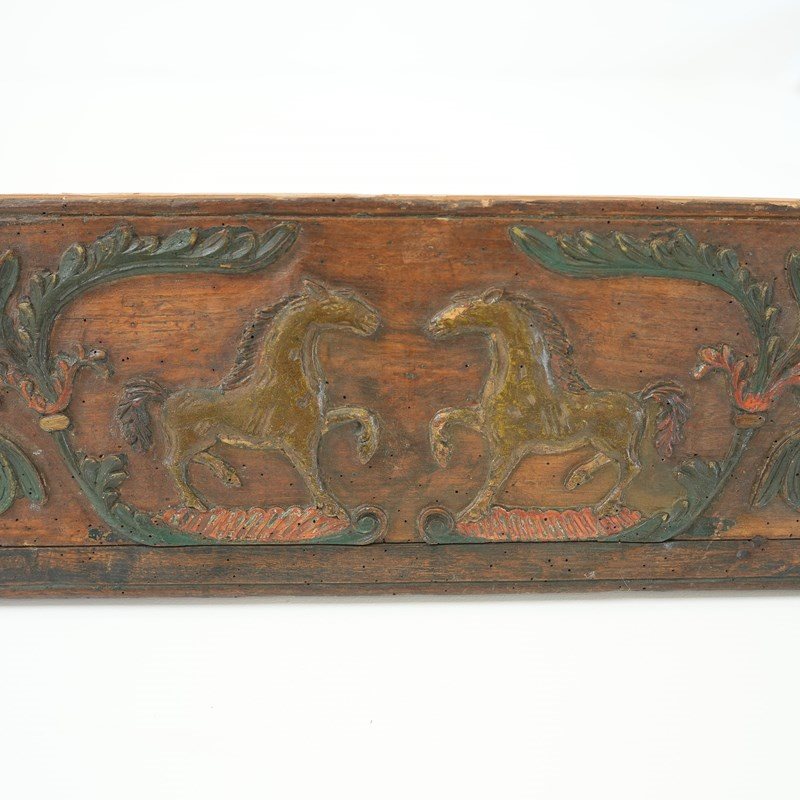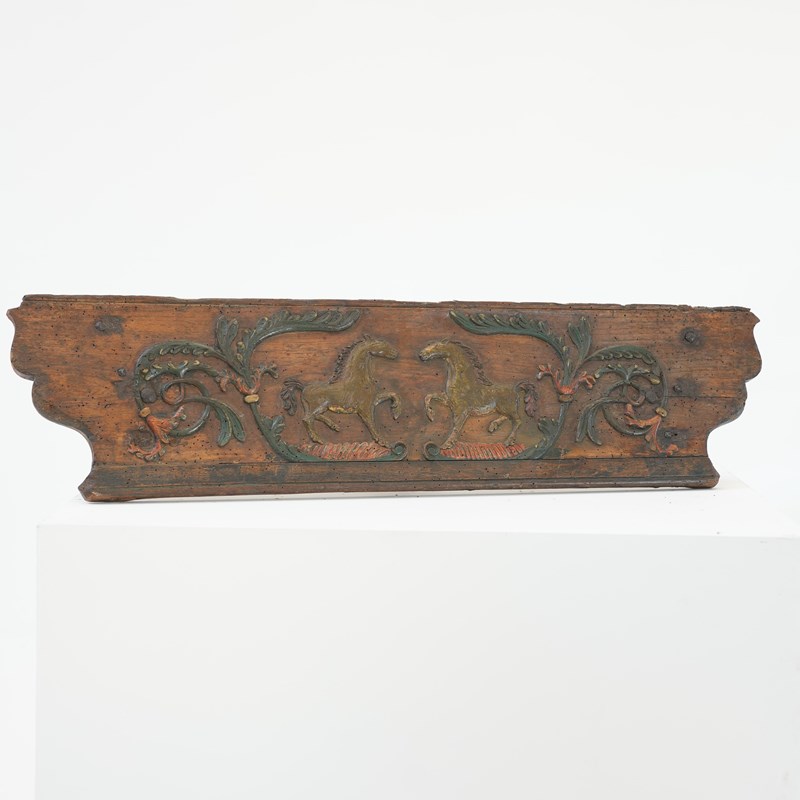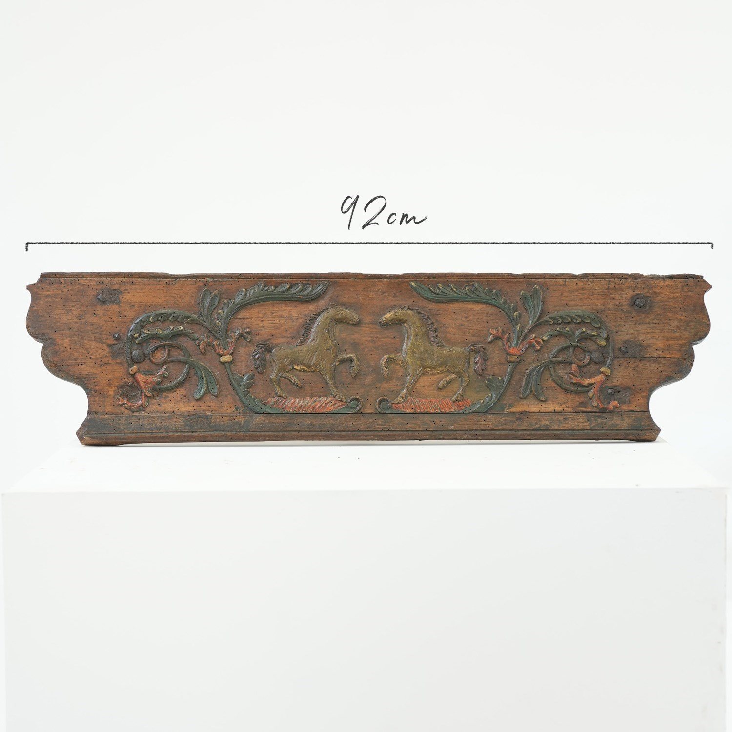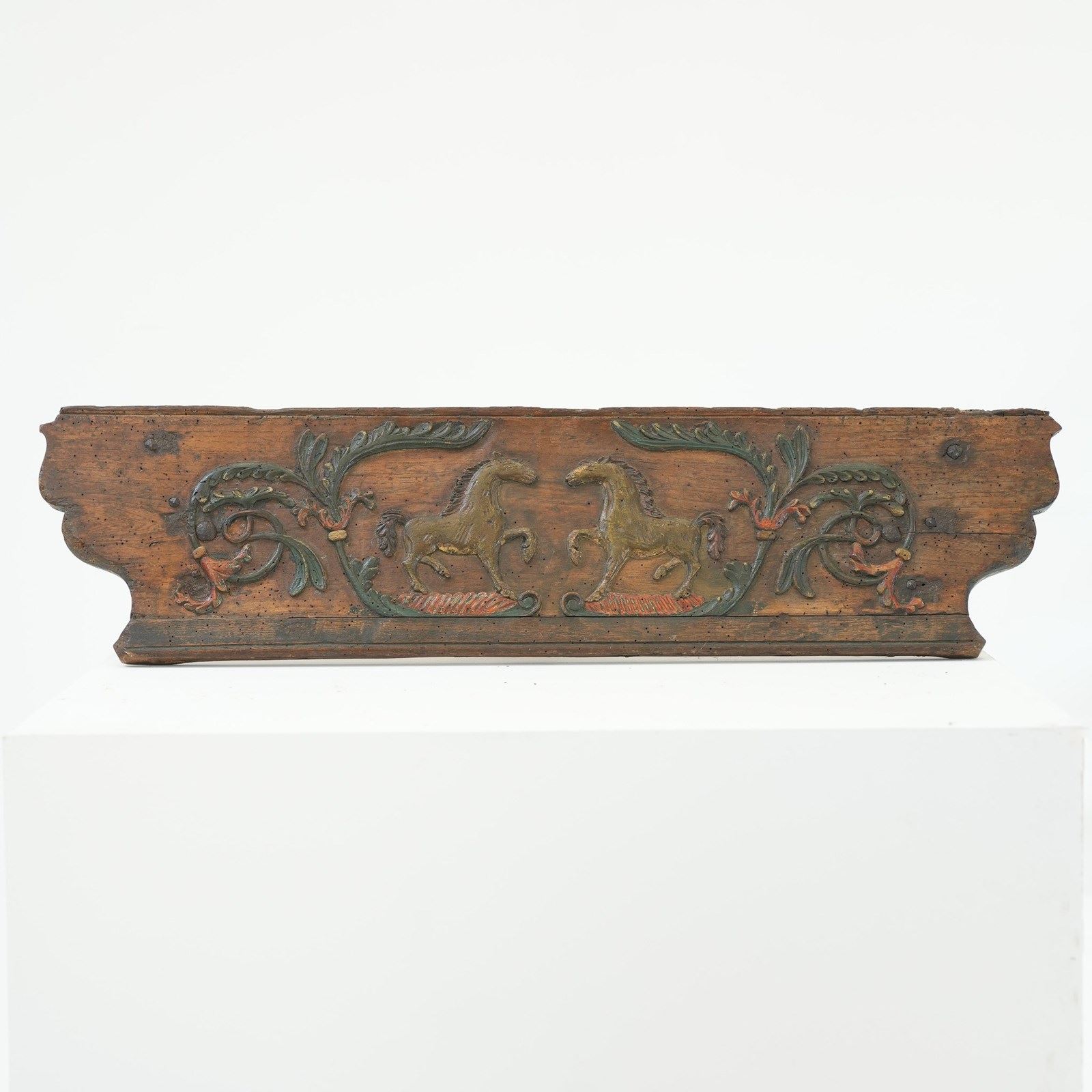 At the centre, two prancing horses appear in low relief, framed by scrolling foliate motifs highlighted with traces of their original green and red pigments. Horses were a favoured symbol in Dutch folk art—representing vitality and prosperity—making them a fitting motif for agricultural wagon decoration.