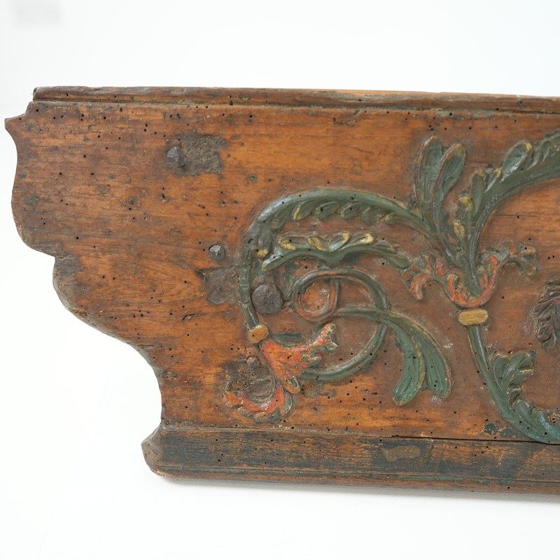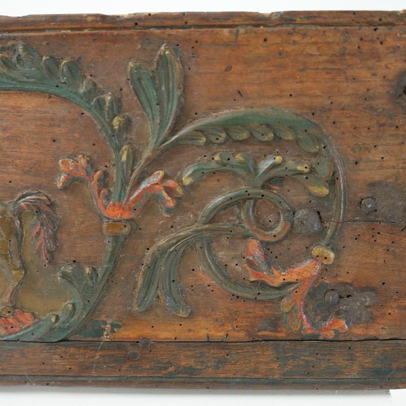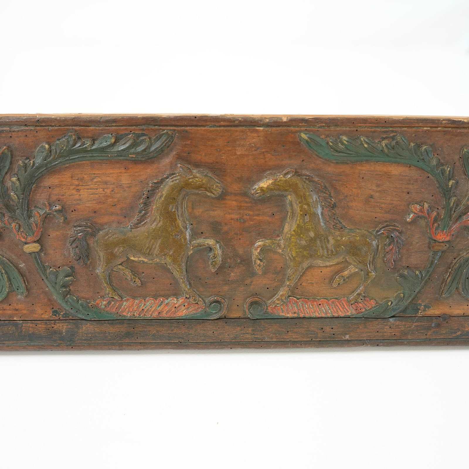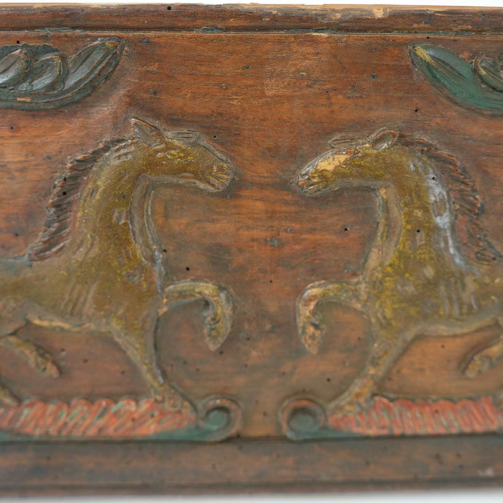 At the centre, two prancing horses appear in low relief, framed by scrolling foliate motifs highlighted with traces of their original green and red pigments. Horses were a favoured symbol in Dutch folk art—representing vitality and prosperity—making them a fitting motif for agricultural wagon decoration.
