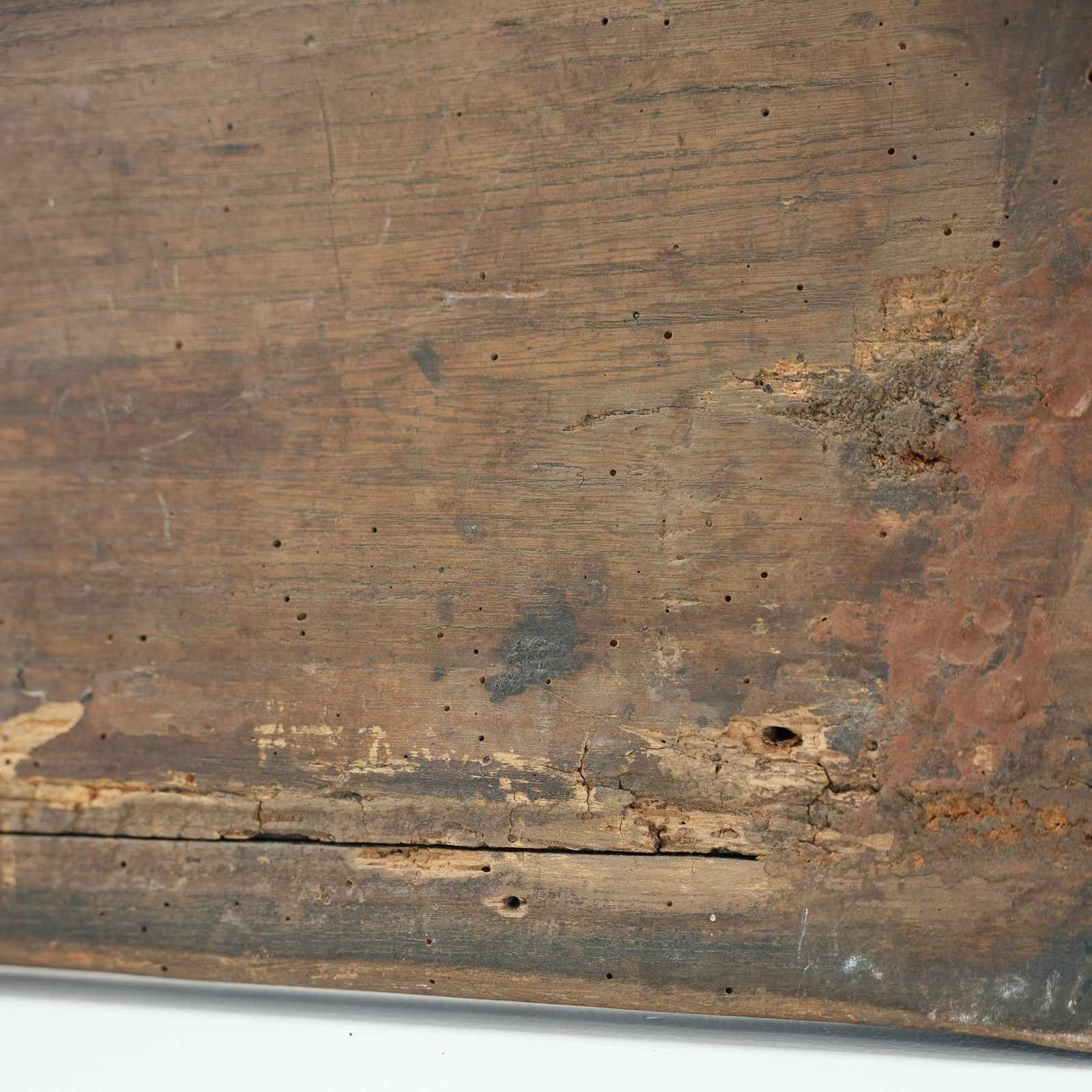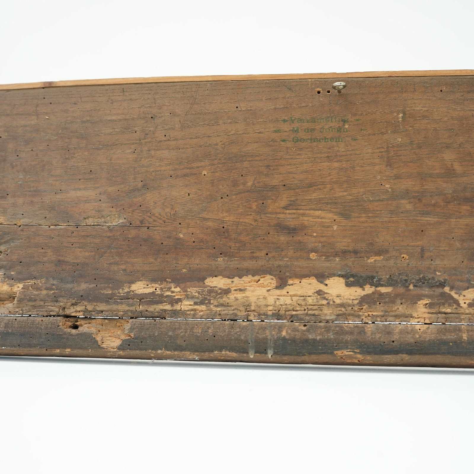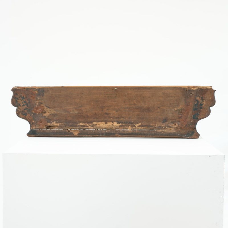 A carved 19th century wooden panel, very likely a surviving fragment from a traditional Dutch farm cart. The elongated shape, rustic hand-carving, and remnants of paint align with the decorative sideboards and valances once used on carts throughout the Netherlands and the Low Countries.