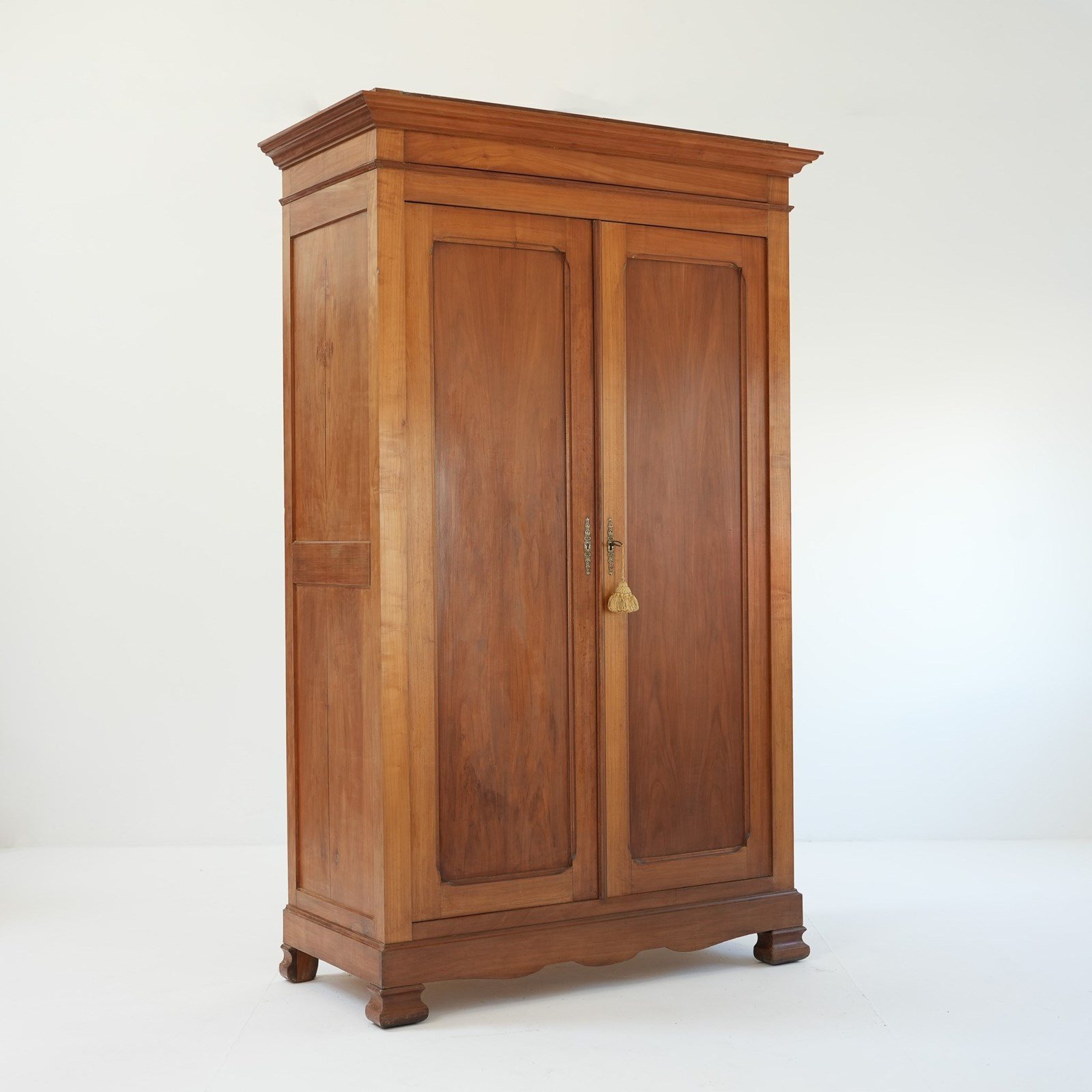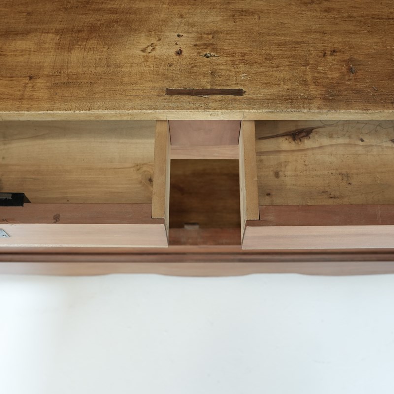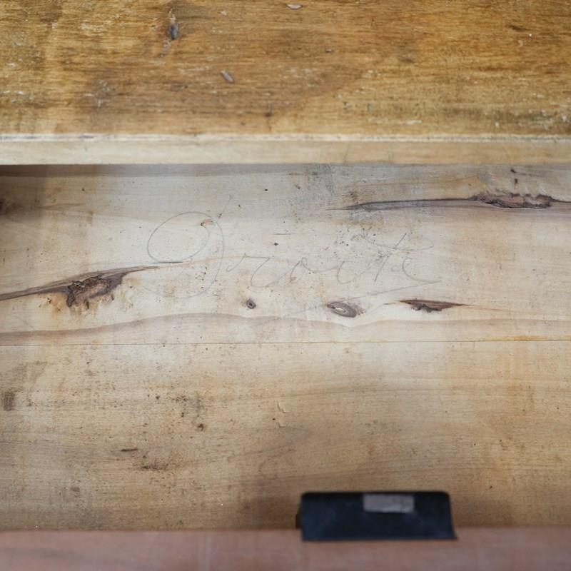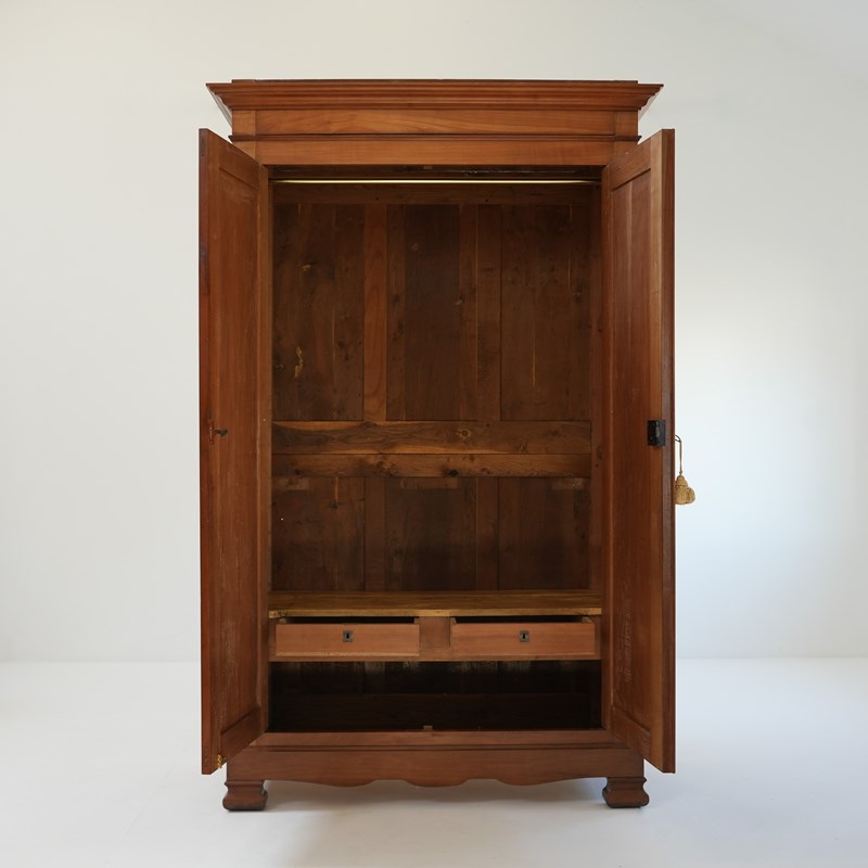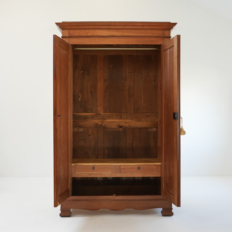 The front of the drawers are original, and while the casing and shelf are modern additions they are in-keeping with the piece. Other later alterations include; the base and the top of the armoire. The cornice is removable for ease of transport or lower ceiling heights.