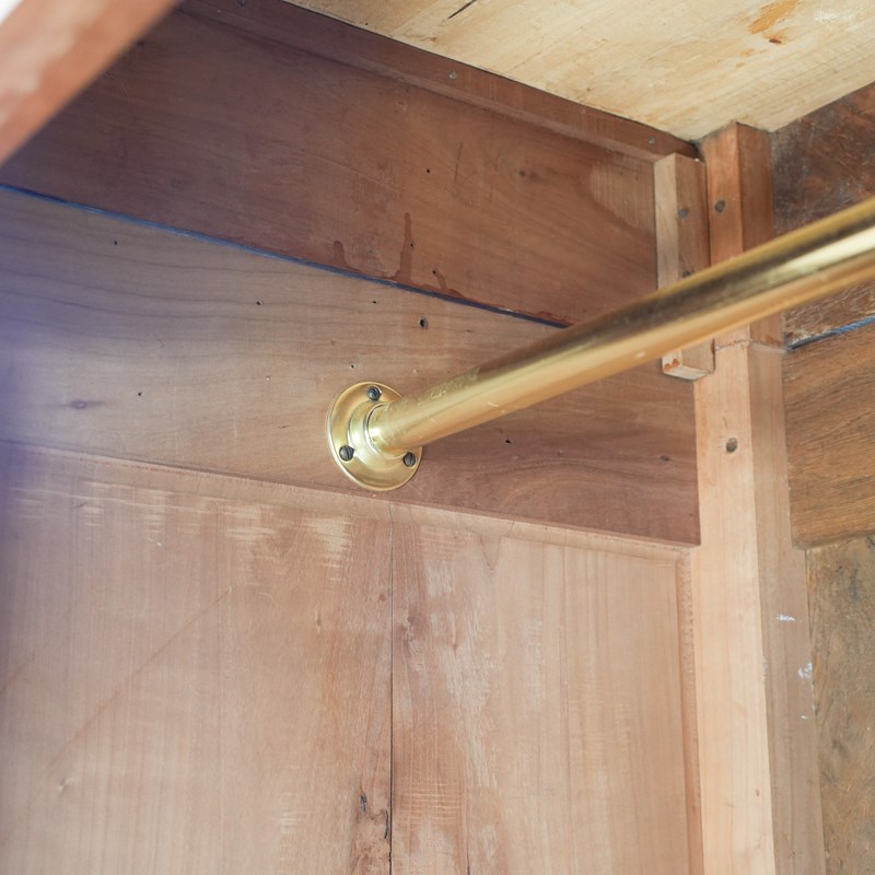 The piece would have originally been shelved, however these have been removed and replaced with a hanging rail to make this a practical wardrobe. The shelf brackets remain, and shelves could be easily reinstated. There is currently a functional set of drawers fitted to a moveable shelf sitting on the existing shelf brackets.