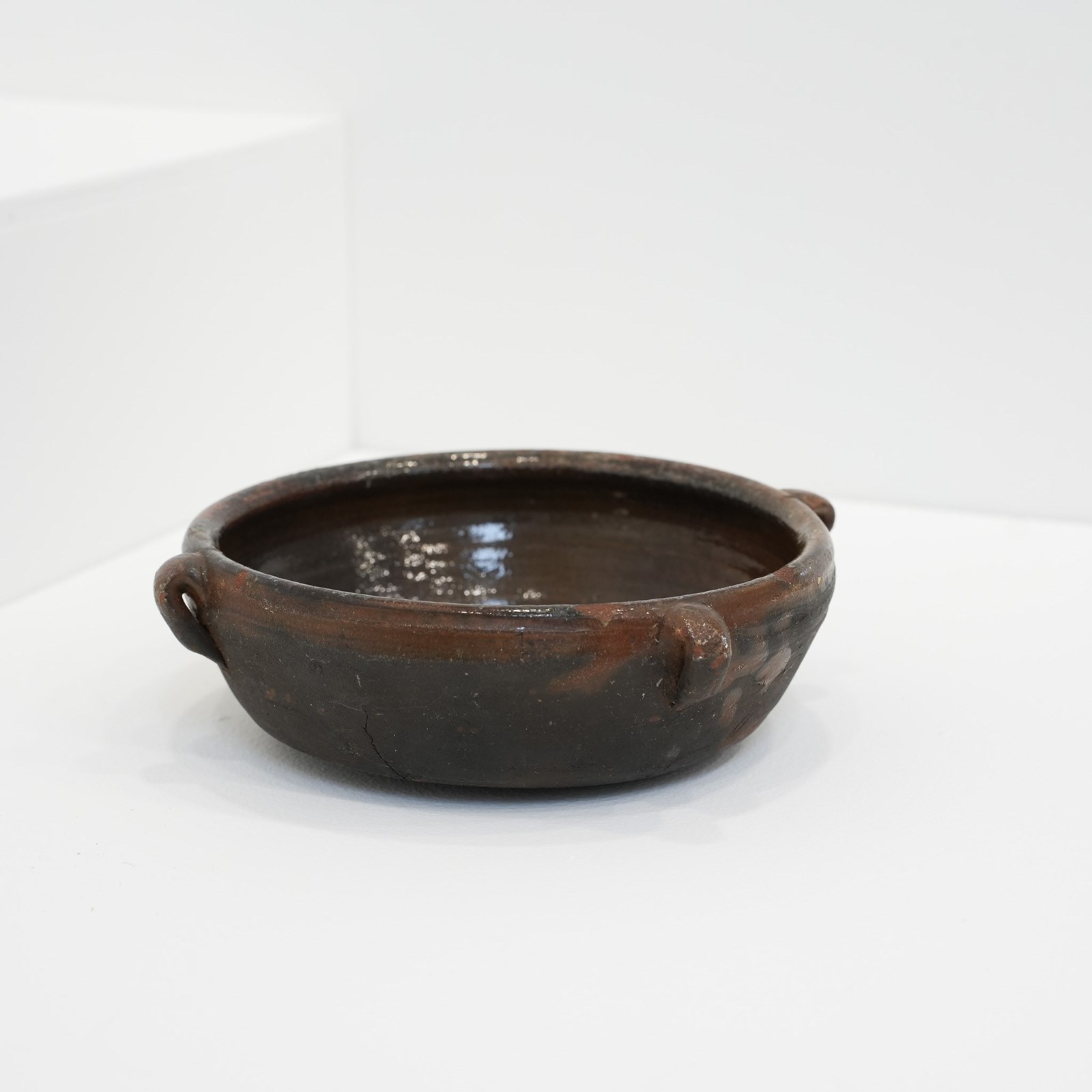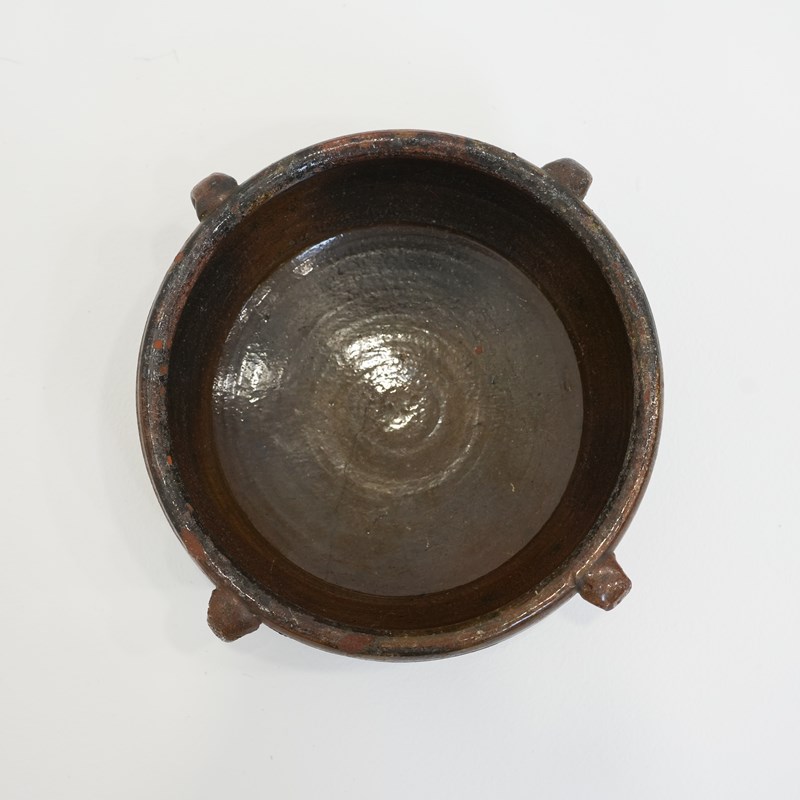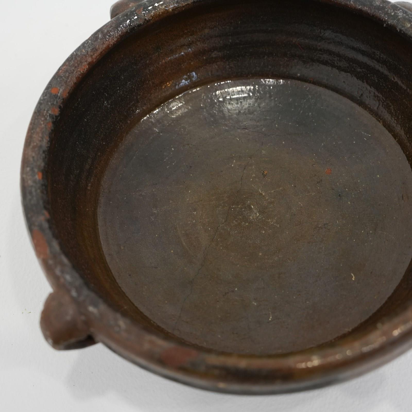 Small provincial 20th Century earthenware glazed bowl with four handles, originally used as a cooking bowl, now a lovely decorative piece.