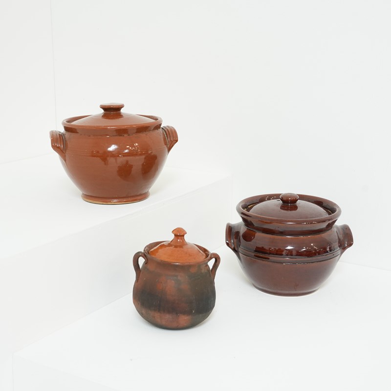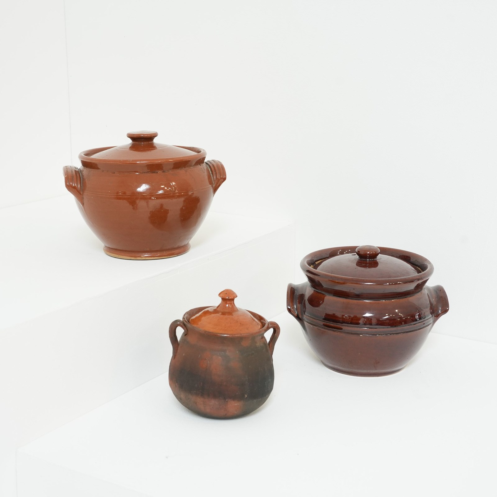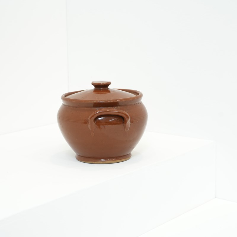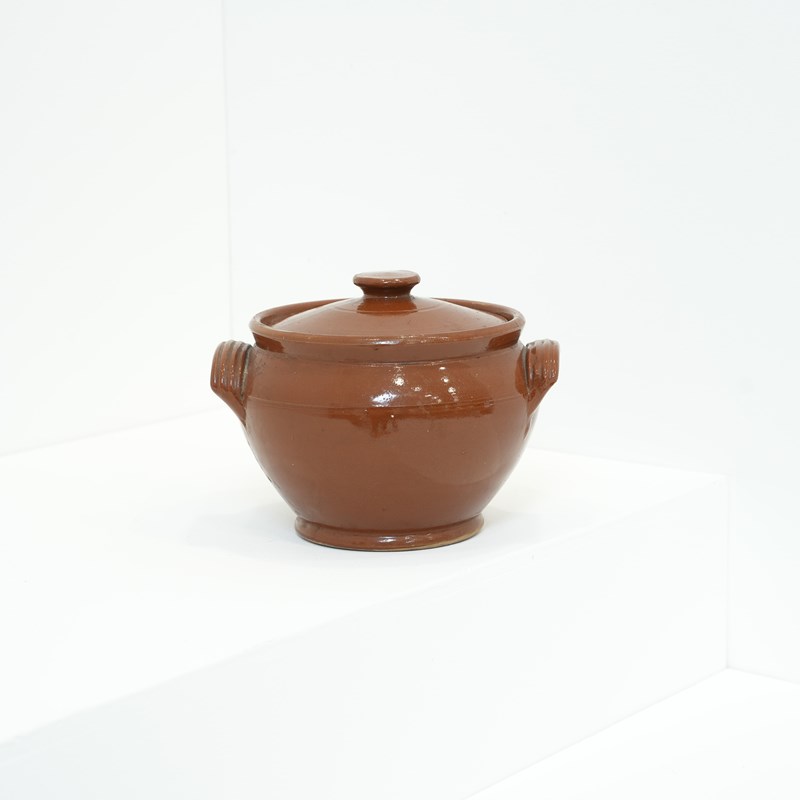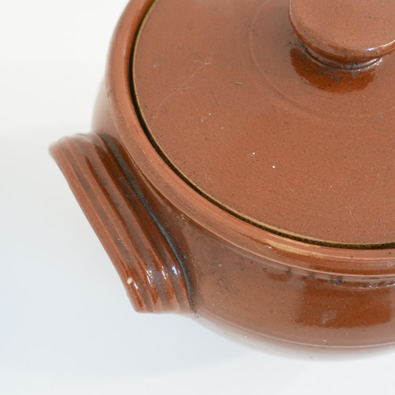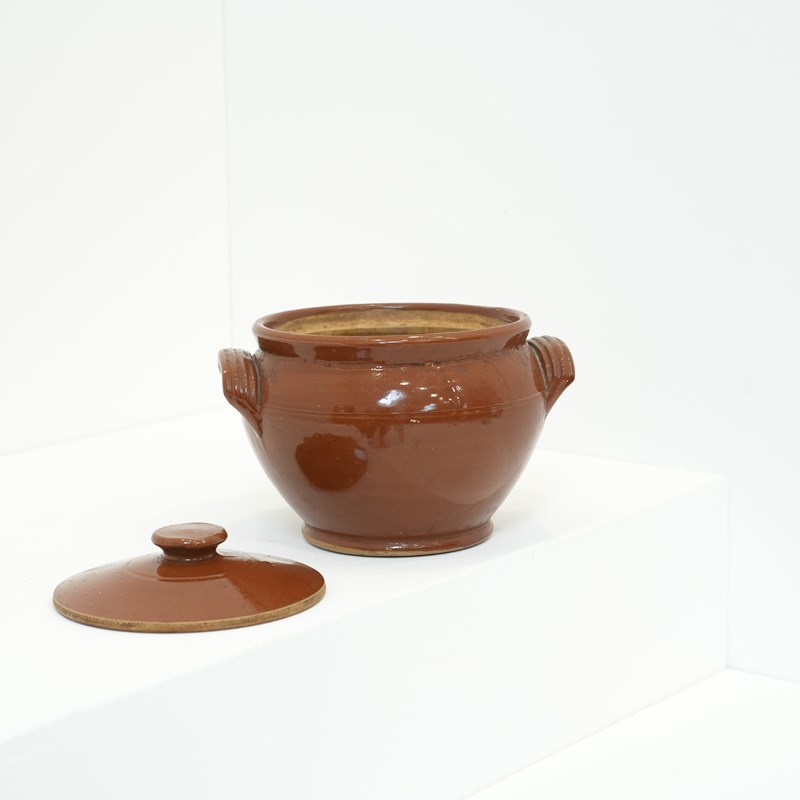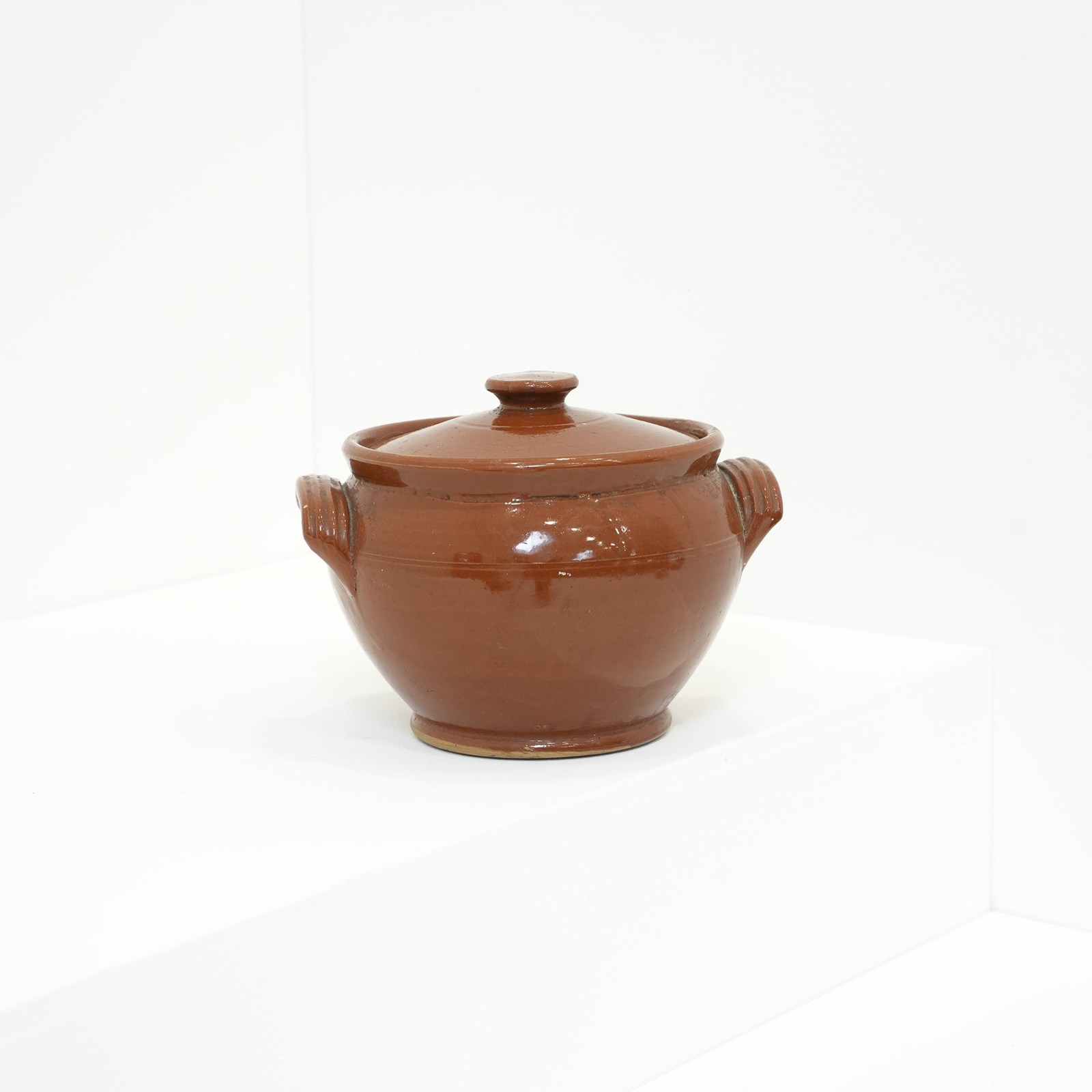 20th Century Spanish glazed earthenware pot with lid and two handles.