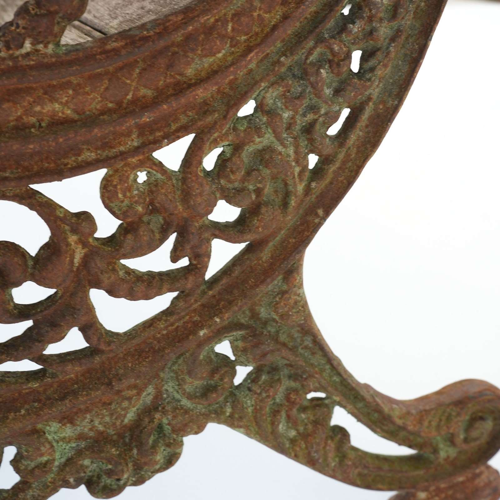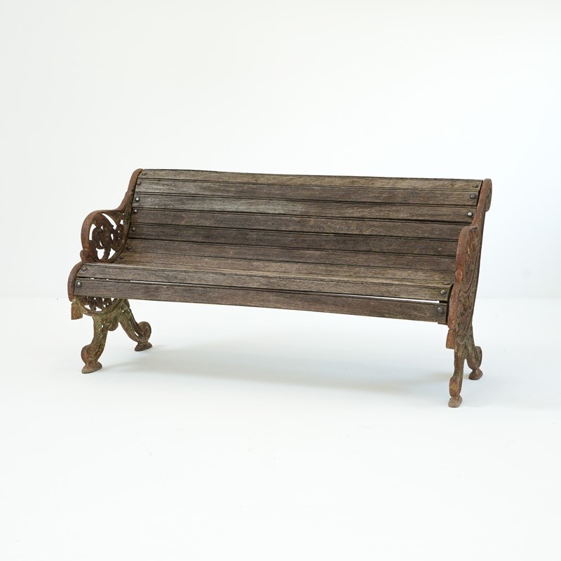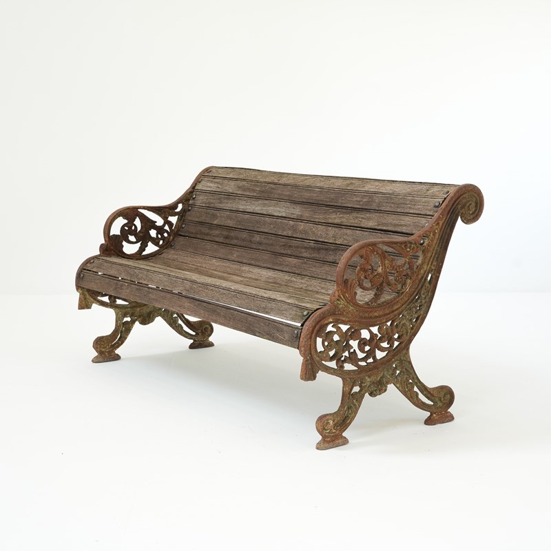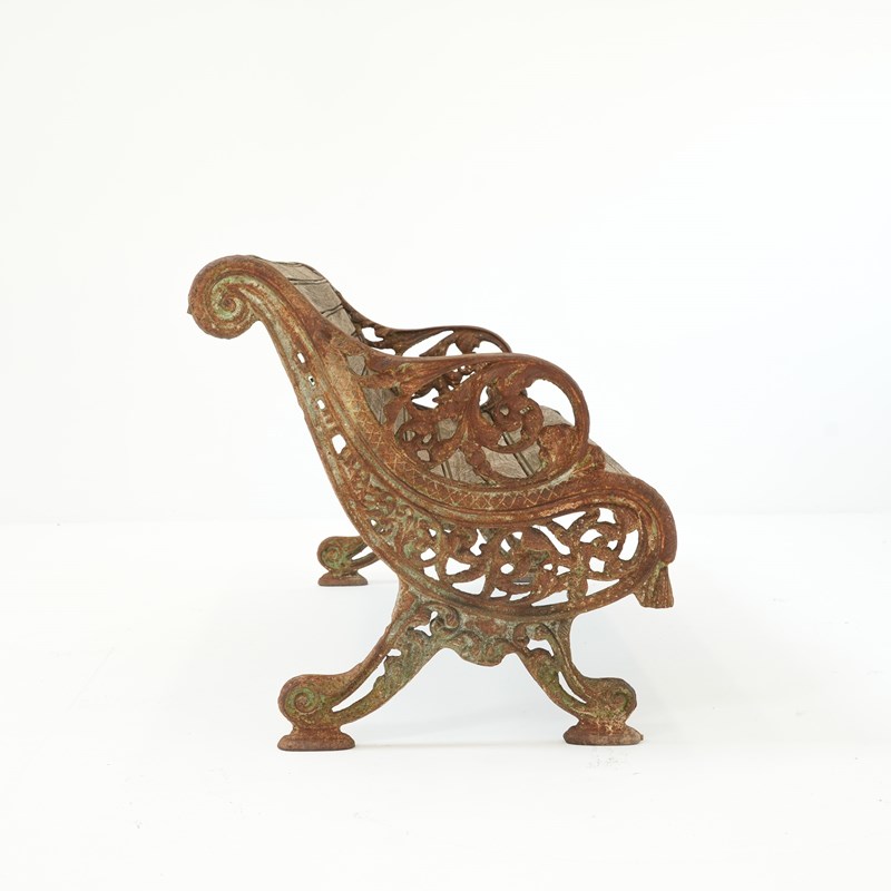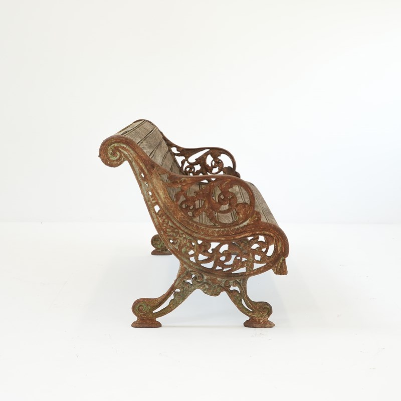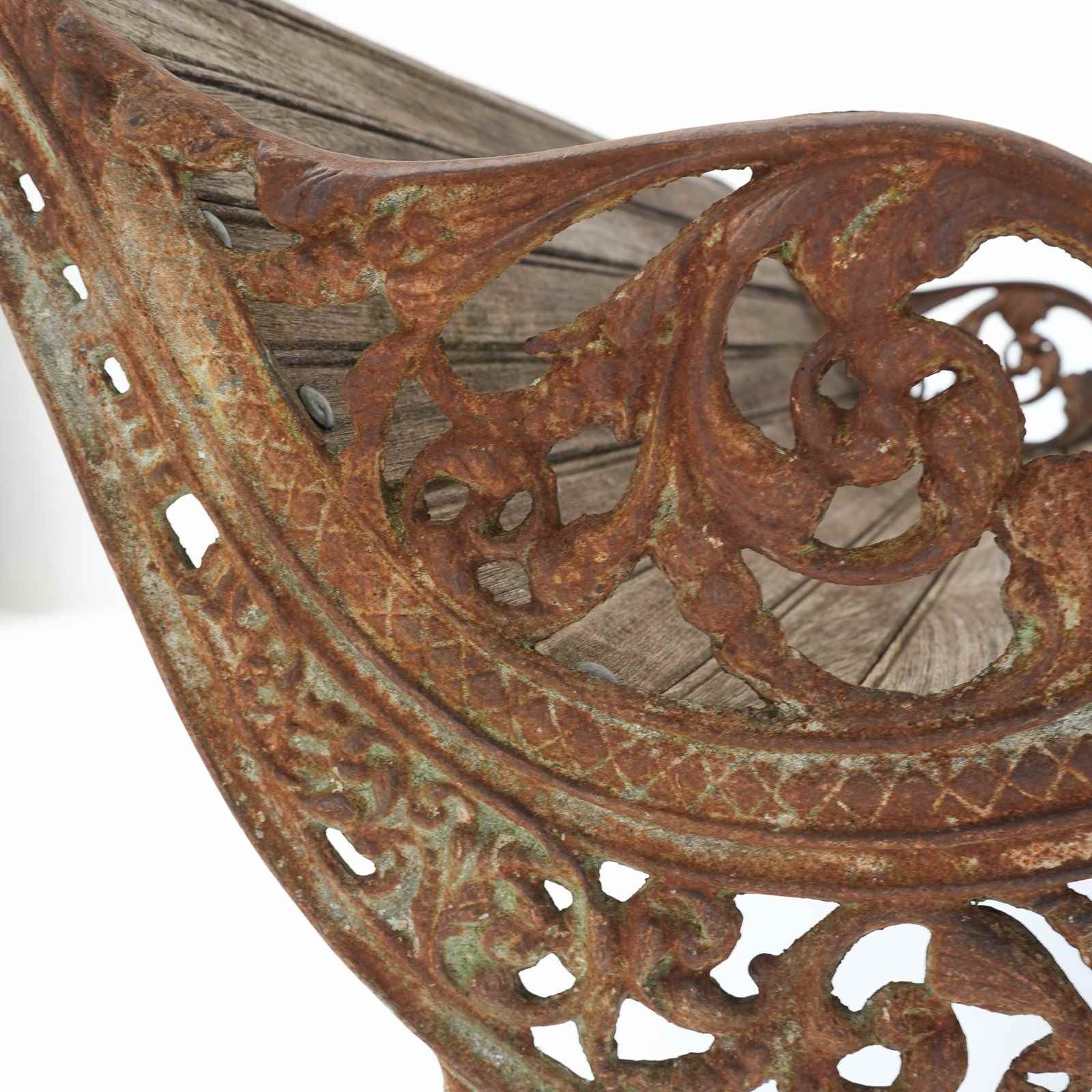 The seat is formed from curved wooden slats secured with dome rivets. The cast iron supports feature foliate detailing. The piece is substantial and very heavy, most likely by the Falkirk iron works and once used as a park bench. Examples can be found in London's Kensington Gardens.