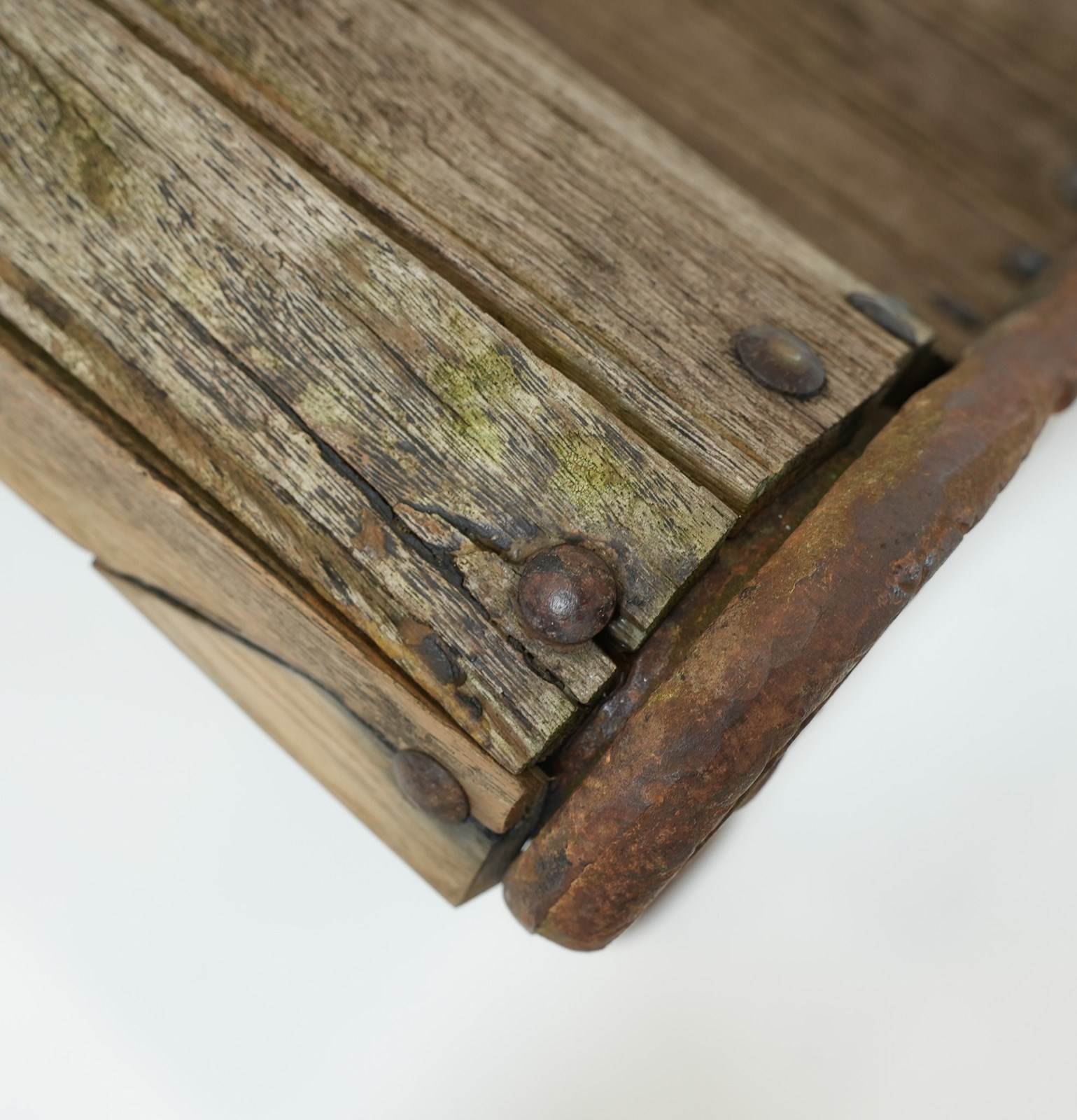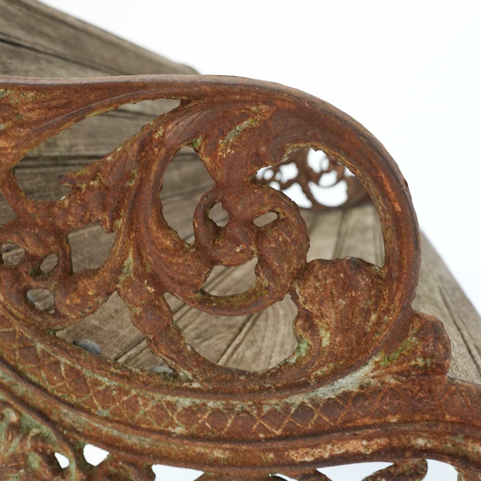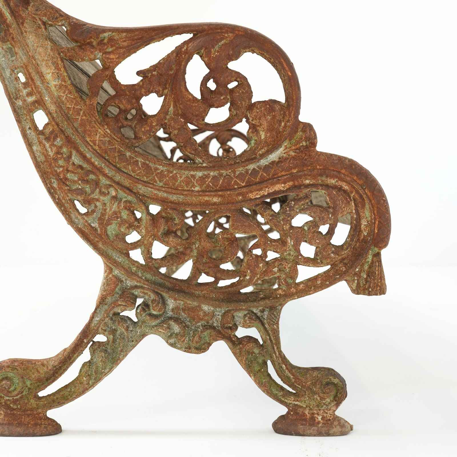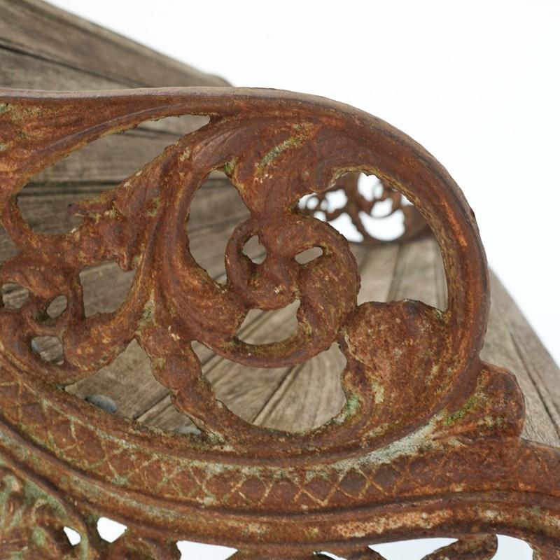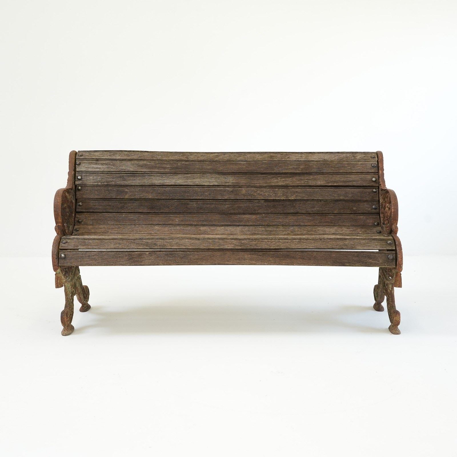 The seat is formed from curved wooden slats secured with dome rivets. The cast iron supports feature foliate detailing. The piece is substantial and very heavy, most likely by the Falkirk iron works and once used as a park bench. Examples can be found in London's Kensington Gardens.