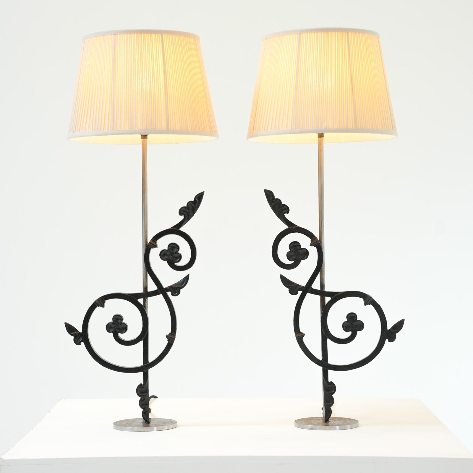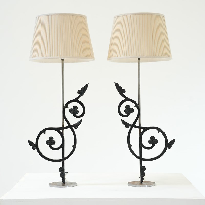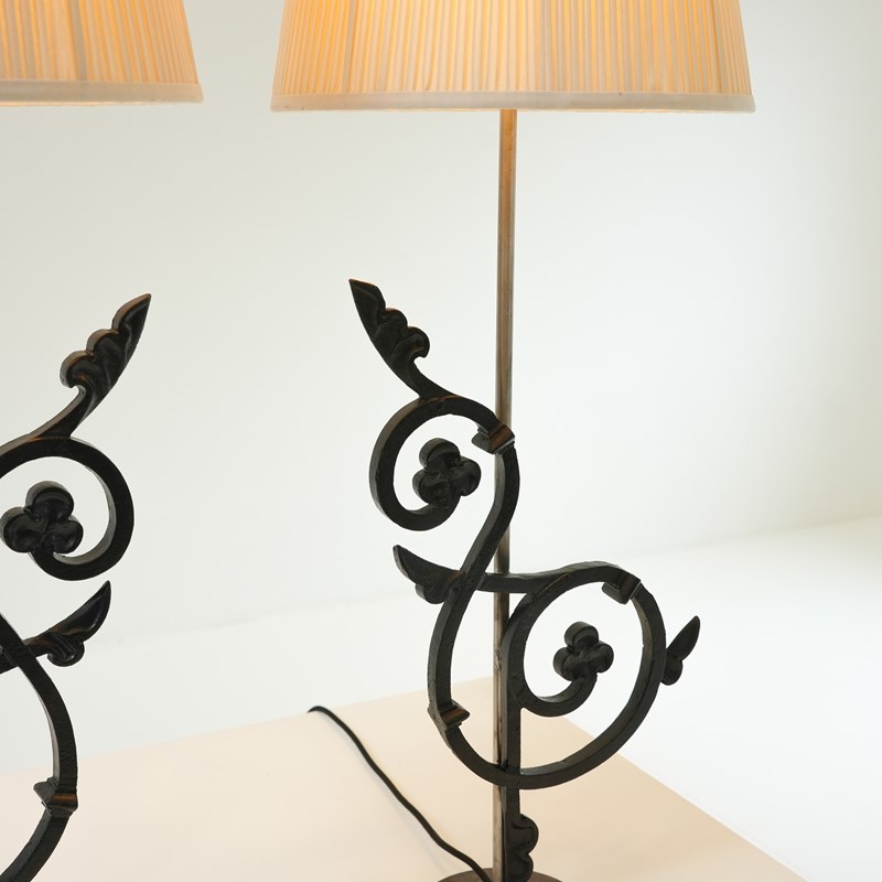 Decorative contemporary table lamps made from an early 20th Century ironwork fragment.