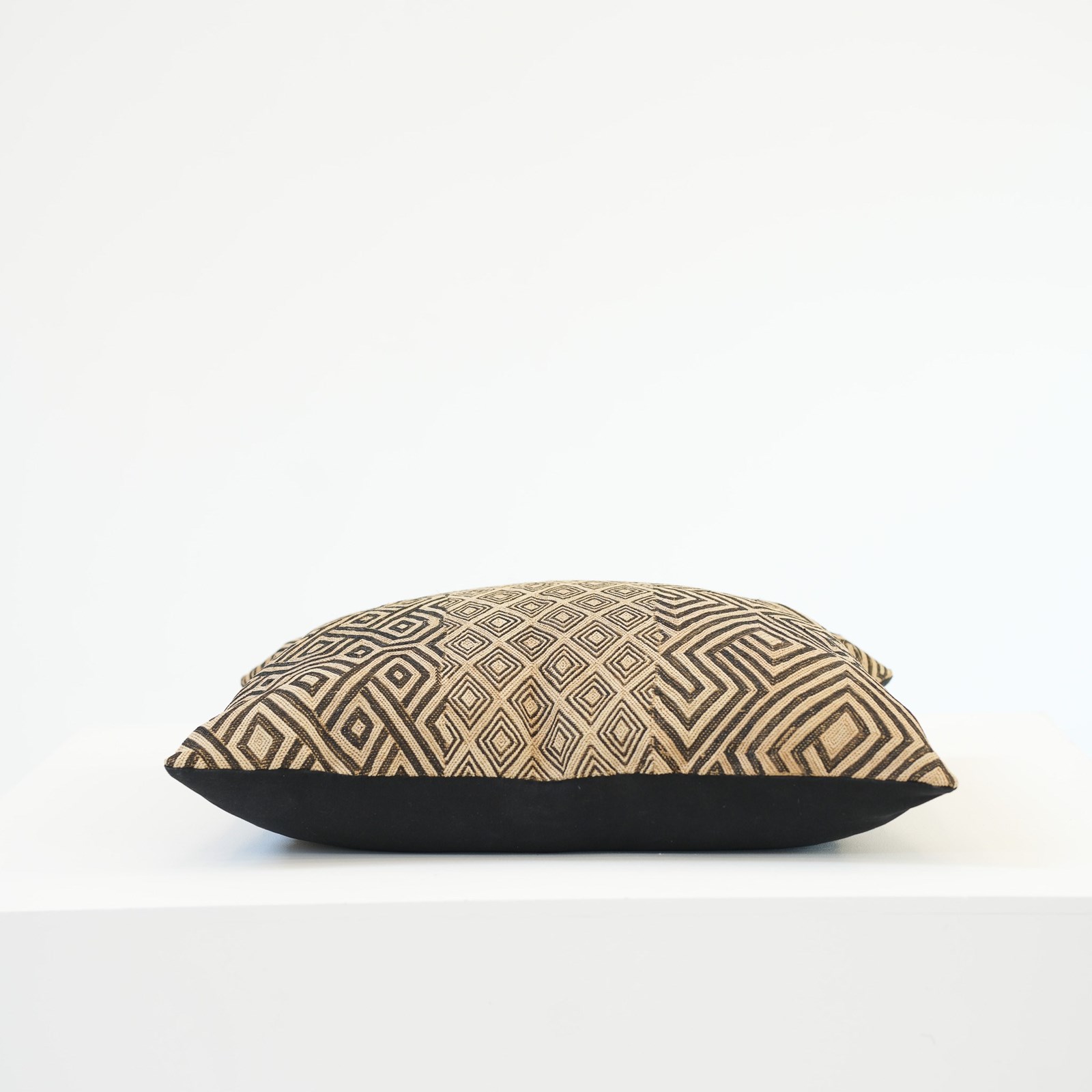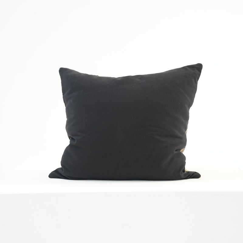 Large Kuba cloth cushion with geometric print to front and black fabric reverse, with feather interior.