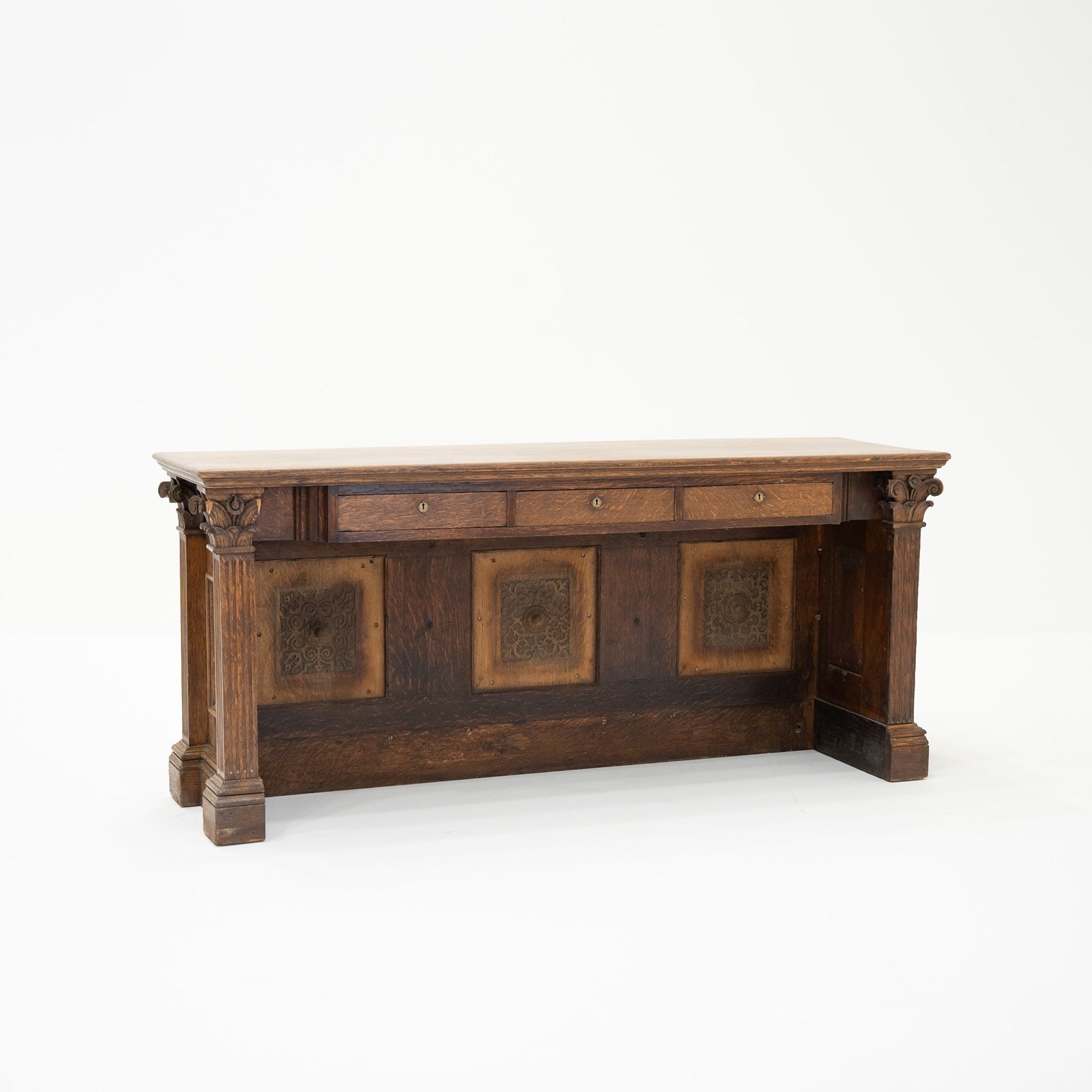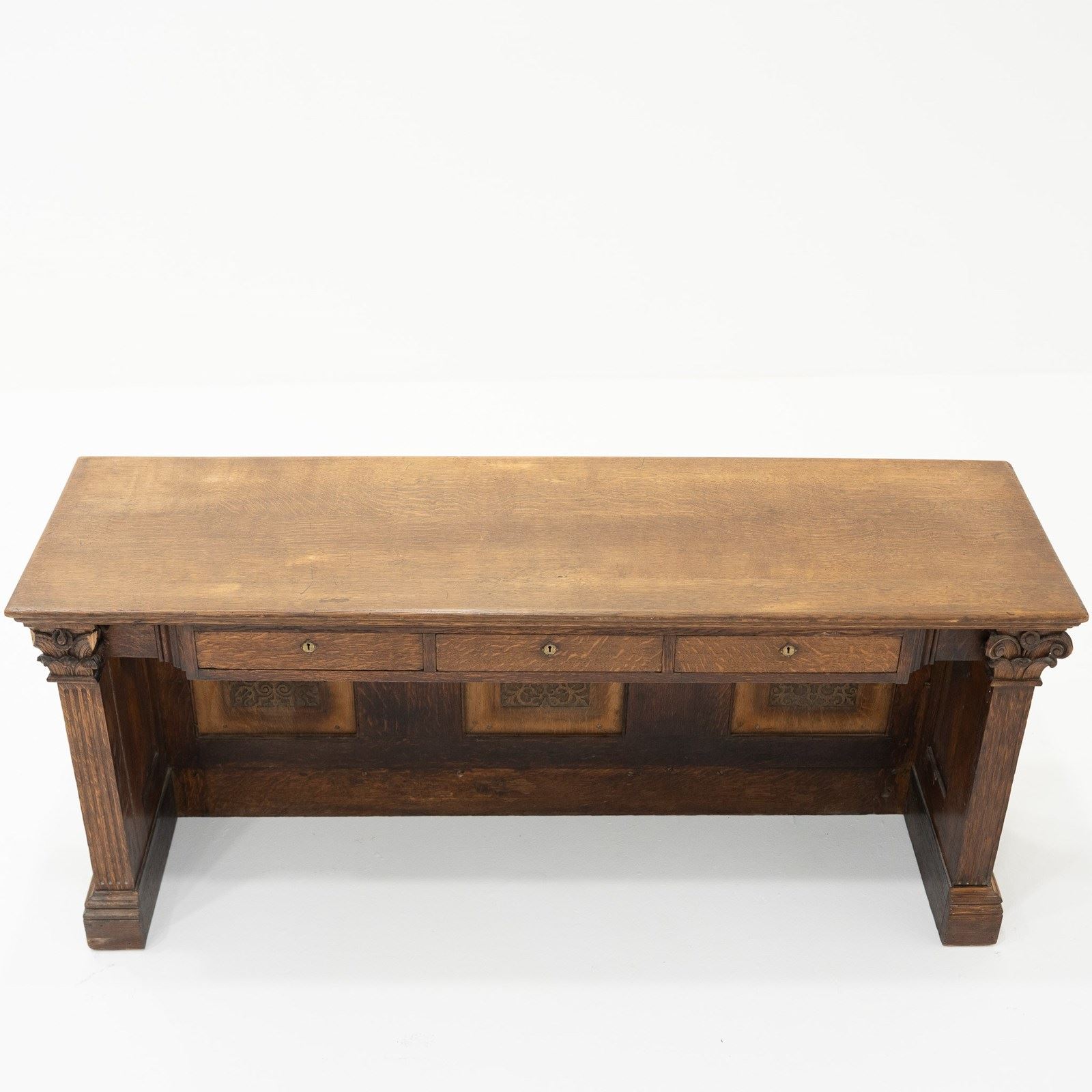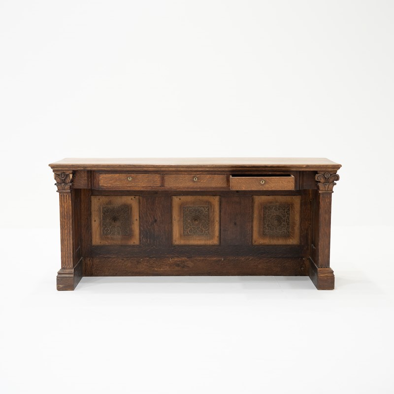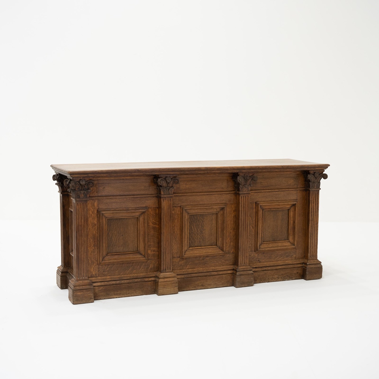 A handsome Late Victorian low oak counter, featuring a beautifully moulded panel front flanked by fluted Corinthian columns. The reverse side is fitted with three drawers over a recessed kneehole, making it ideal for use as a desk, writing table or even returned to its original purpose — a seated commercial counter.