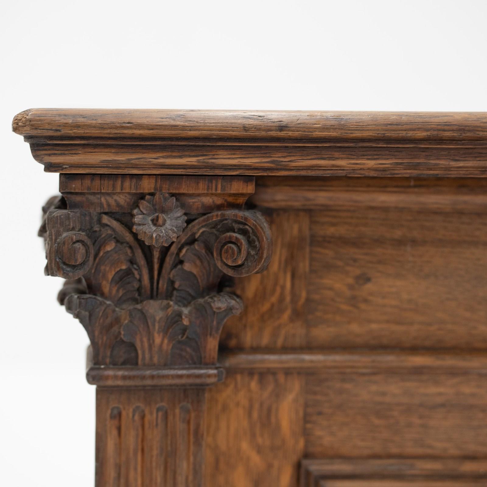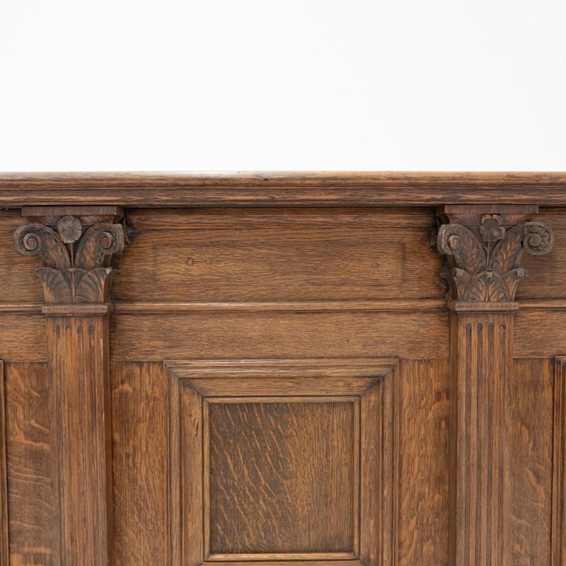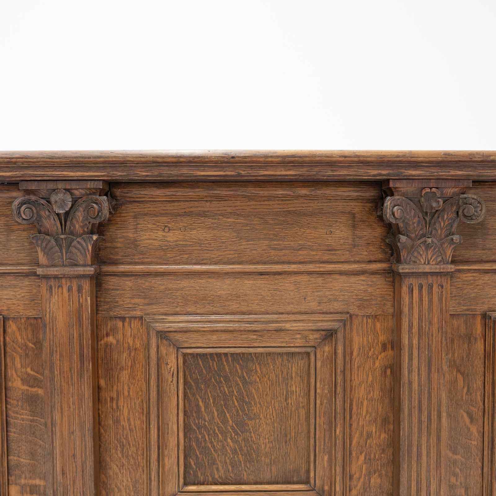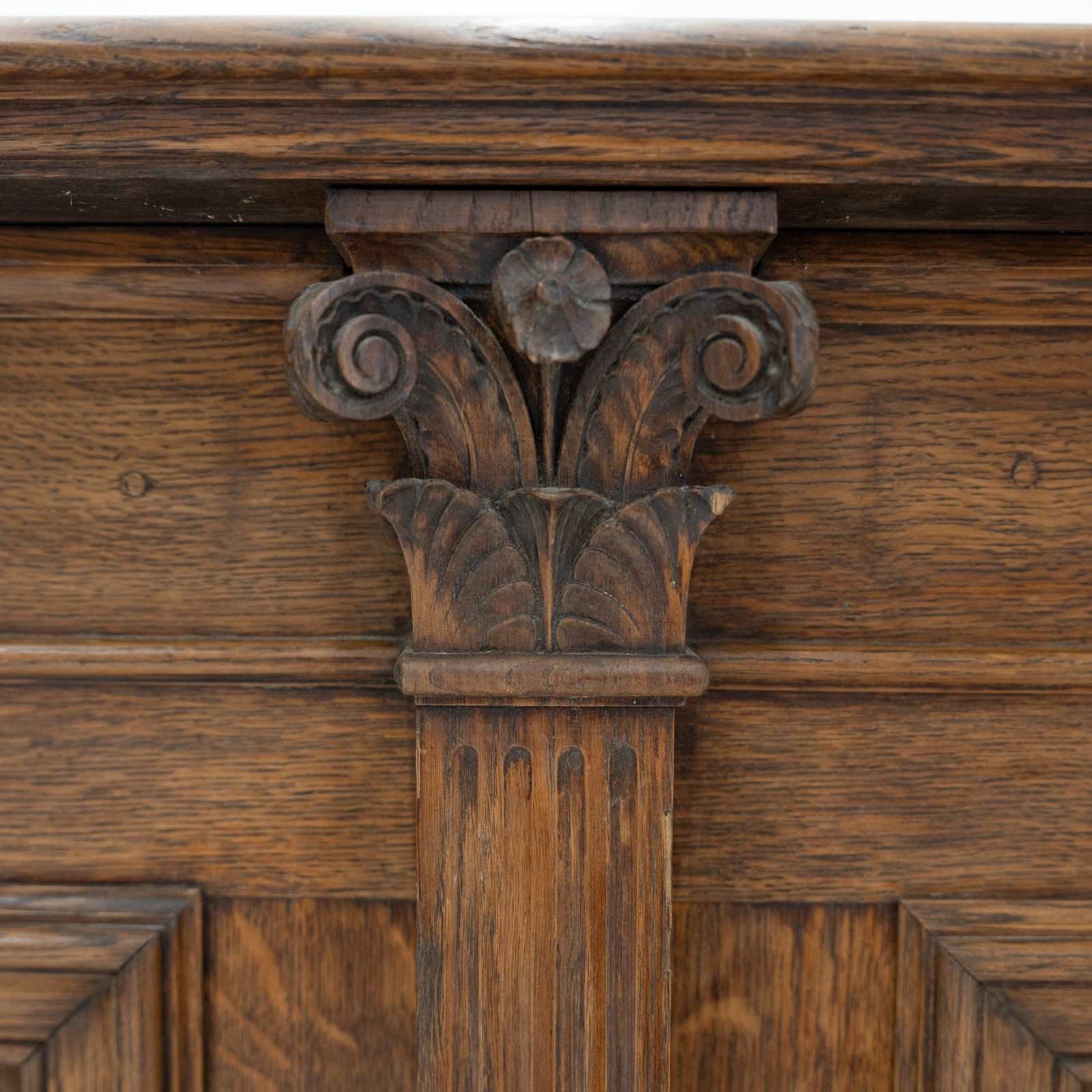 A handsome Late Victorian low oak counter, featuring a beautifully moulded panel front flanked by fluted Corinthian columns. The reverse side is fitted with three drawers over a recessed kneehole, making it ideal for use as a desk, writing table or even returned to its original purpose — a seated commercial counter.