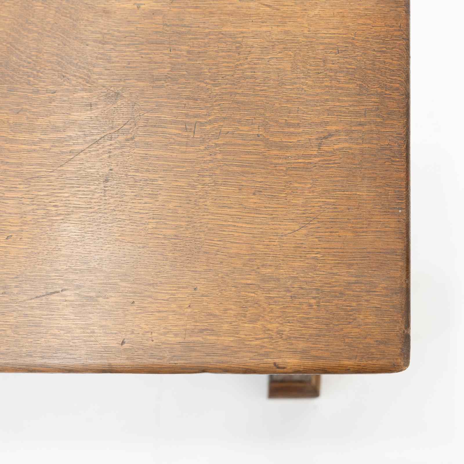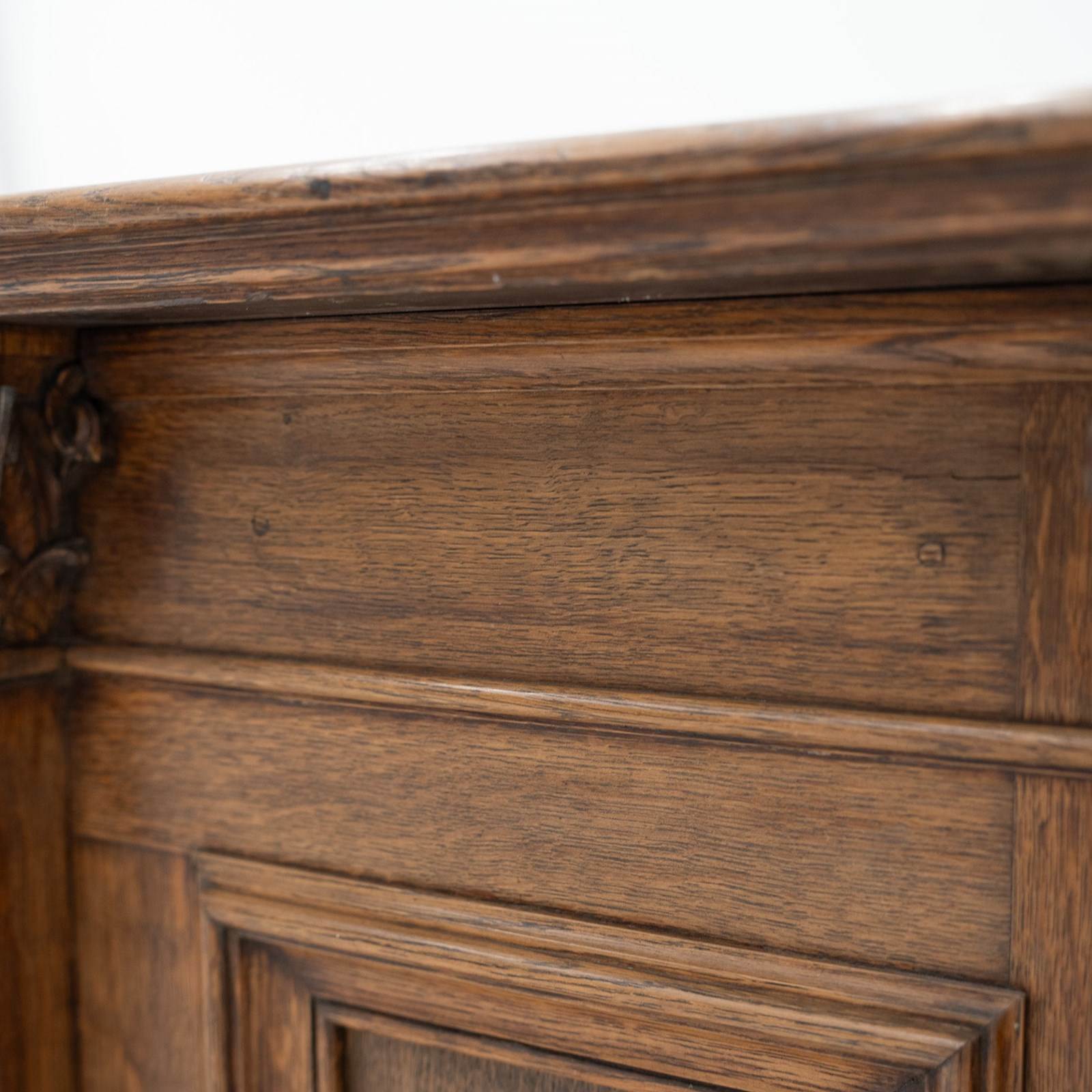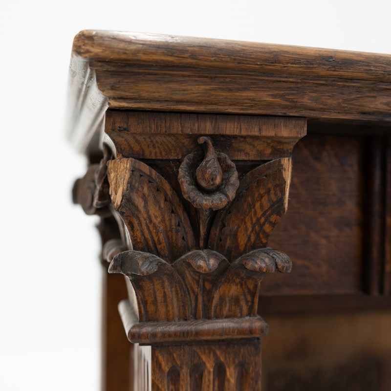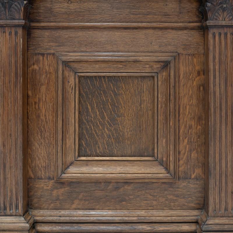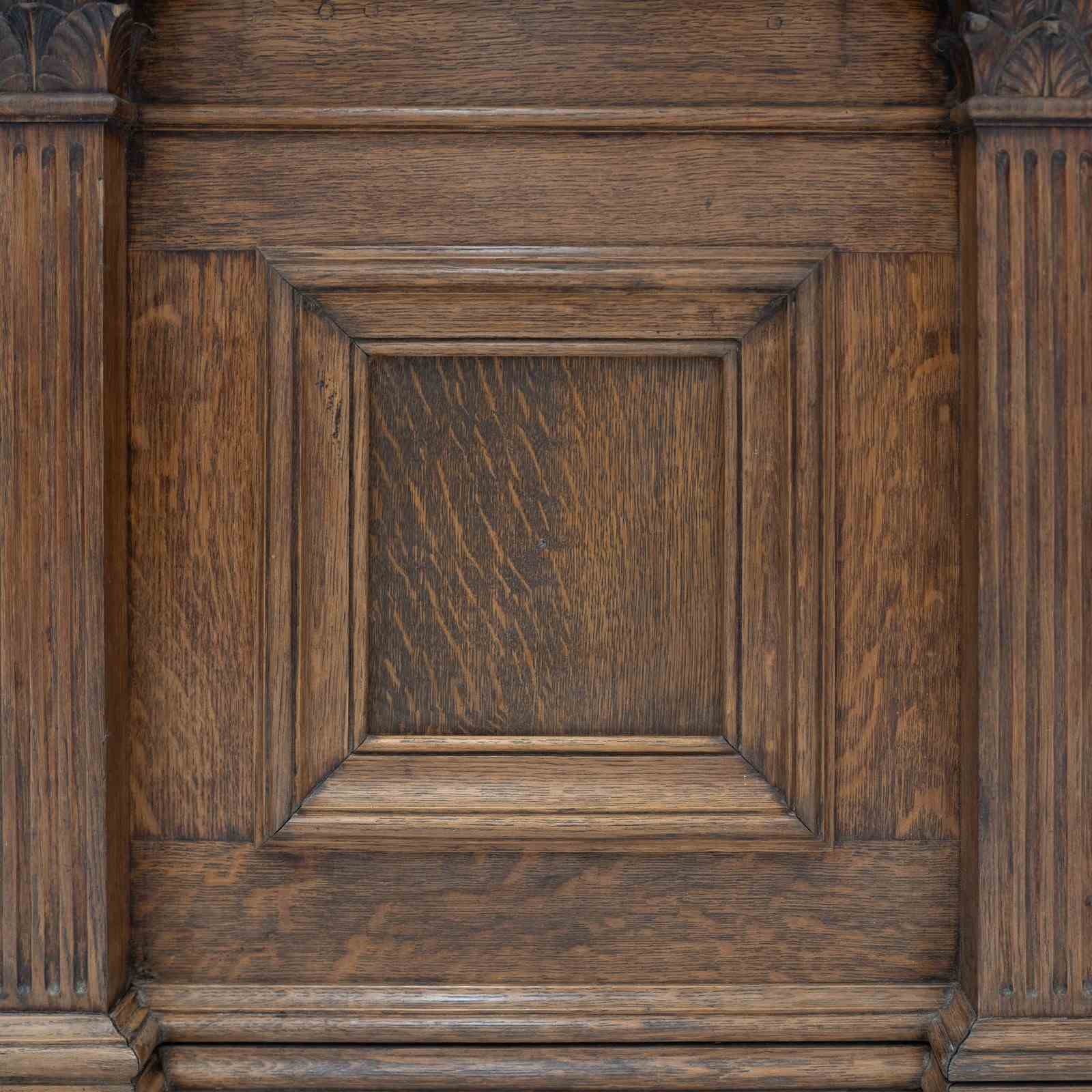 A handsome Late Victorian low oak counter, featuring a beautifully moulded panel front flanked by fluted Corinthian columns. The reverse side is fitted with three drawers over a recessed kneehole, making it ideal for use as a desk, writing table or even returned to its original purpose — a seated commercial counter.