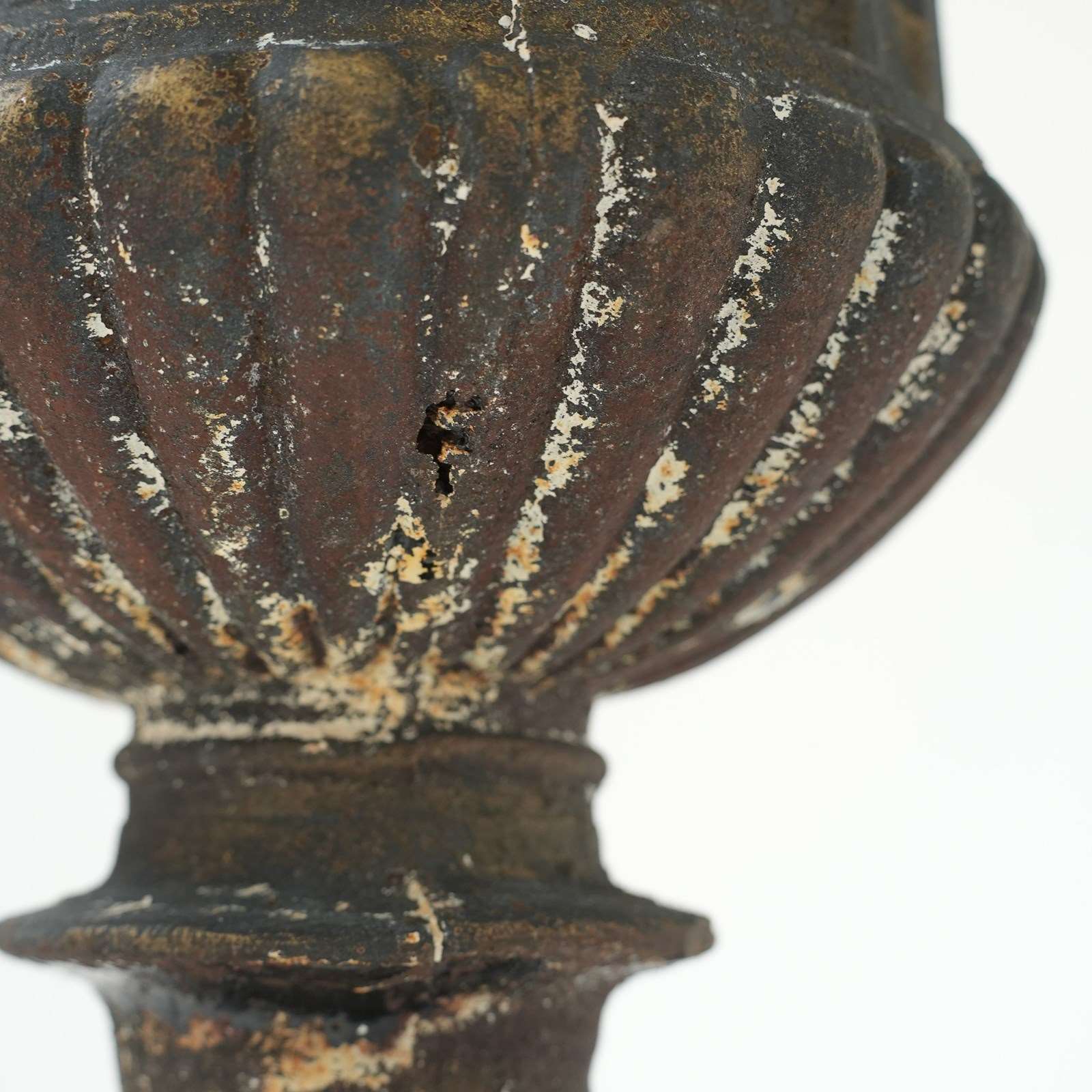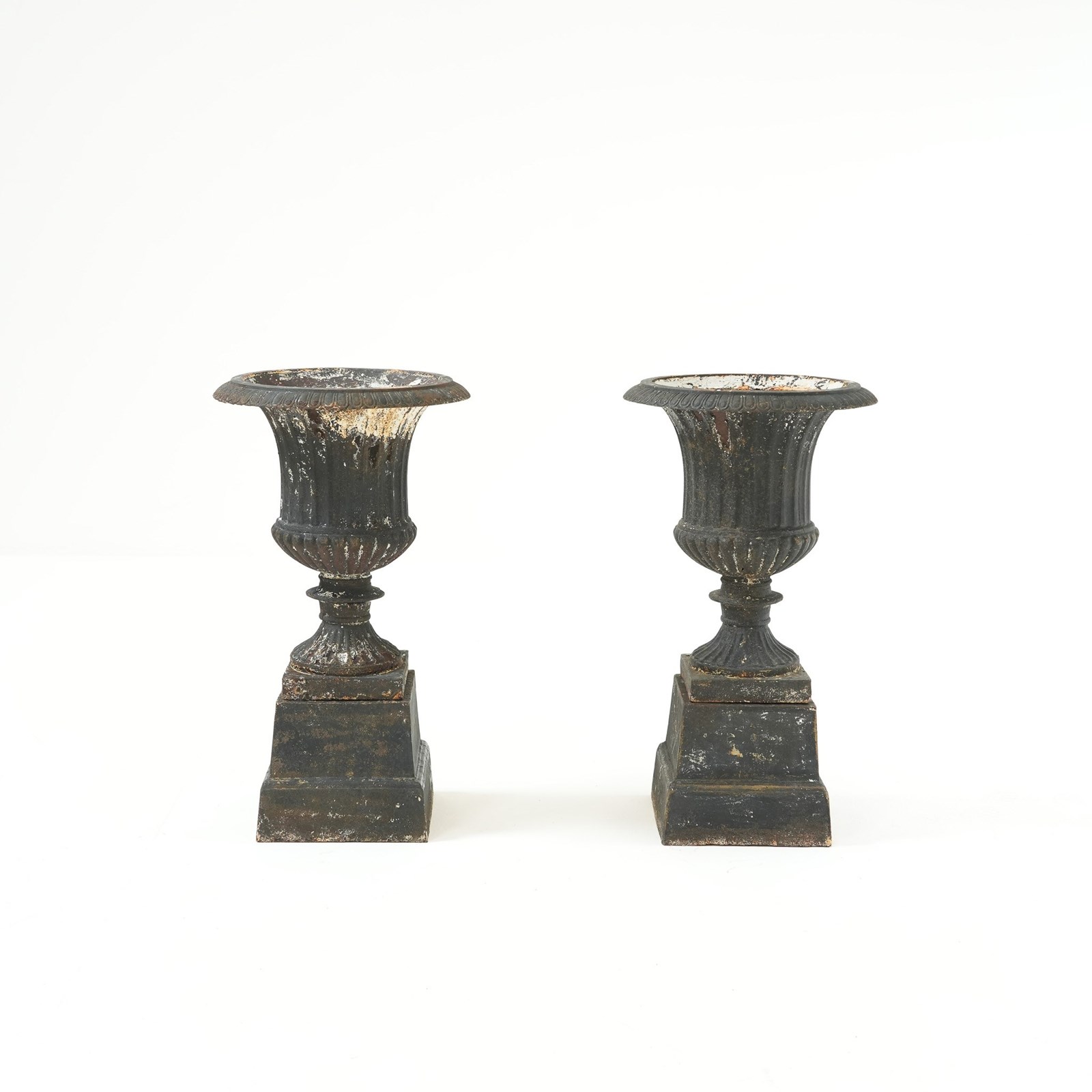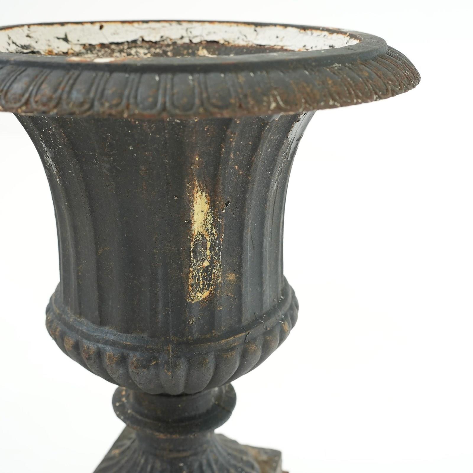 A pair of late Victorian cast iron urns, presenting a classic Campana silhouette with a weathered character.