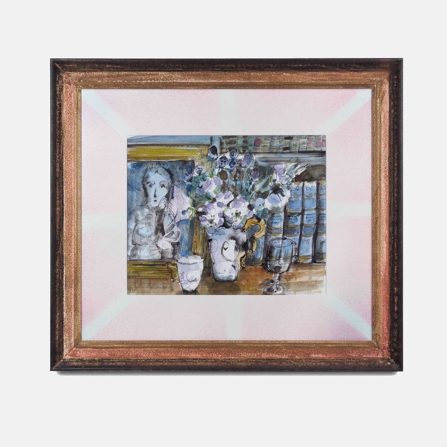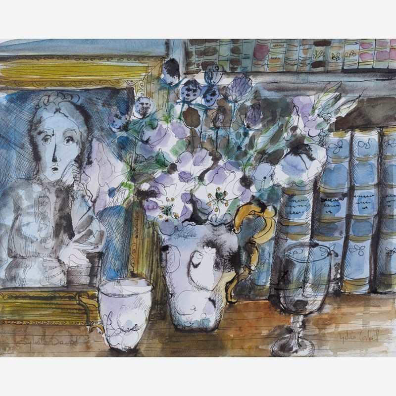 Ink drawing with watercolour wash on paper. Still life depicting a jug of scabiosa flowers with a portrait painting and books behind, a mug and glass goblet to the fore. Signed Lydia Corbett lower right.