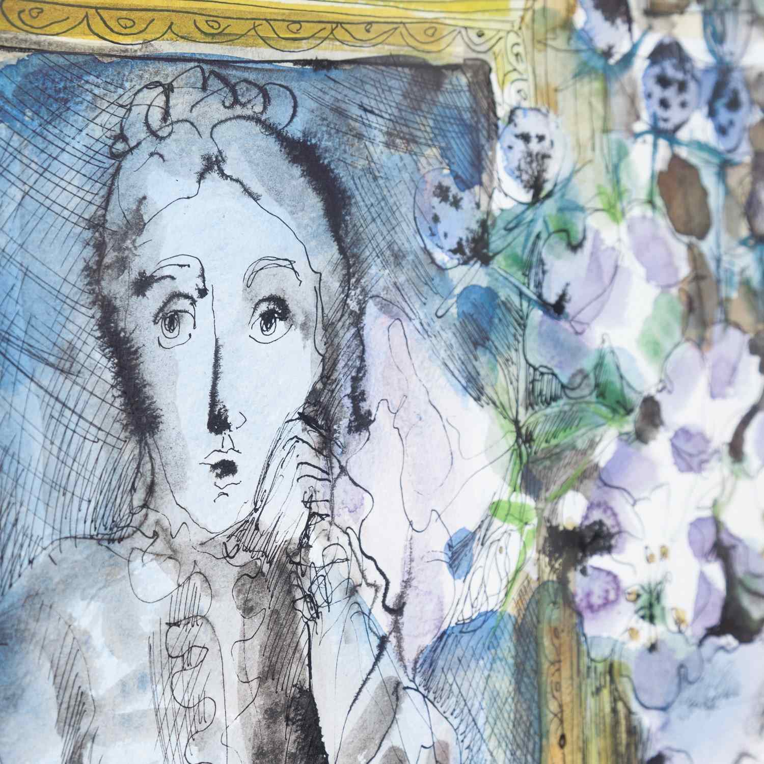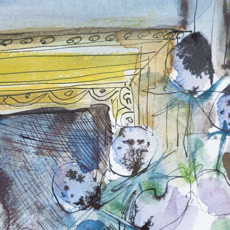 Her art has a distinctively free and ‘childlike’ in style, she utilises multiple mediums including inks, watercolours, acrylics and oils, and also produces beautiful ceramics influenced by her time with Picasso. Her colourful paintings are predominantly still-life works, taking inspiration from the natural world. They are often filled with an abundance of beautiful flowers, and frequently feature human figures that sit somewhere on the border between fantasy and reality. The paintings have been noted for this characteristically dreamlike quality, and Corbett’s gently playful use of figures in particular has been compared to the work of Marc Chagall, while her free, confident lines are said to recall Jean Cocteau. Corbett has described how her liberal upbringing in particular enabled the spontaneous and emotionally honest nature of her artworks – her ‘stories in paint’.