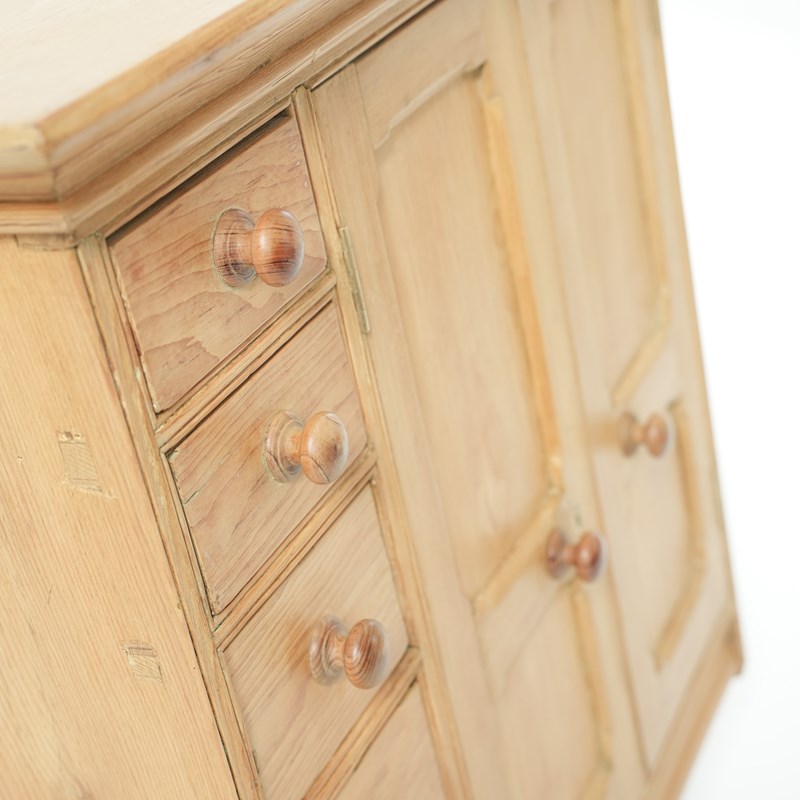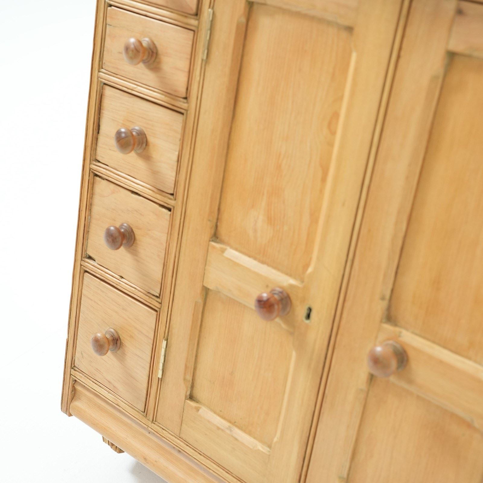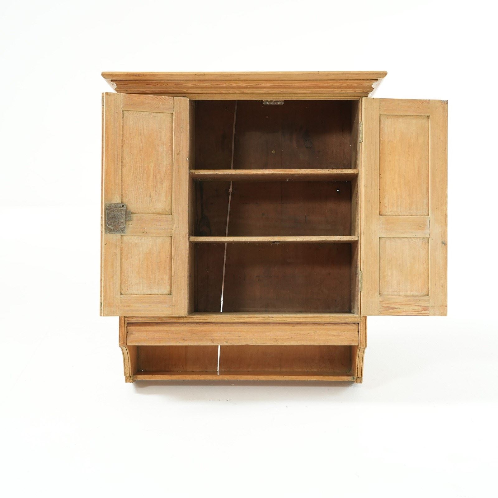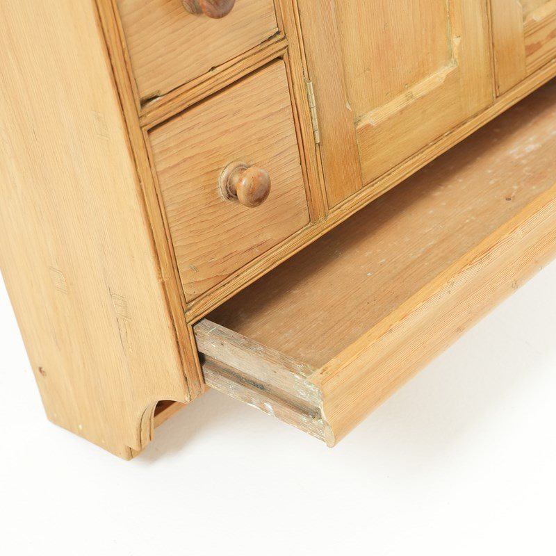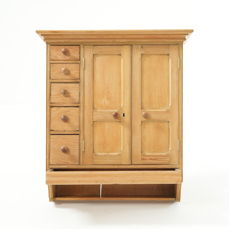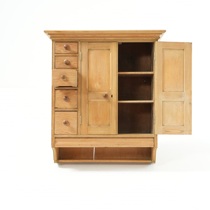 A charming and practical Victorian pine hanging cupboard. Its configuration suggests it was designed for a high-traffic area of a household, such as a kitchen or scullery. It features five drawers to one side along with a discrete, hidden drawer that runs along the bottom. The cupboard has two shelves inside.