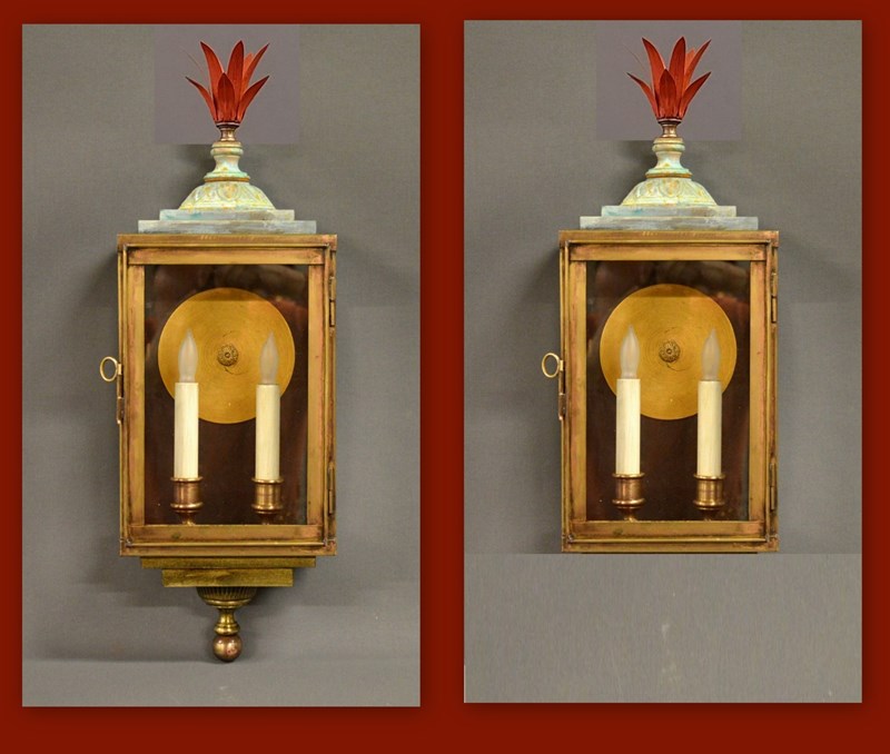 Our own design, bespoke made in our own workroom. Made to your spec. Example shown is finished in aged brass with verdigris top. Two candles. Clear glass panes. ( we also offer 'antique' glass types). Also available in single candle.