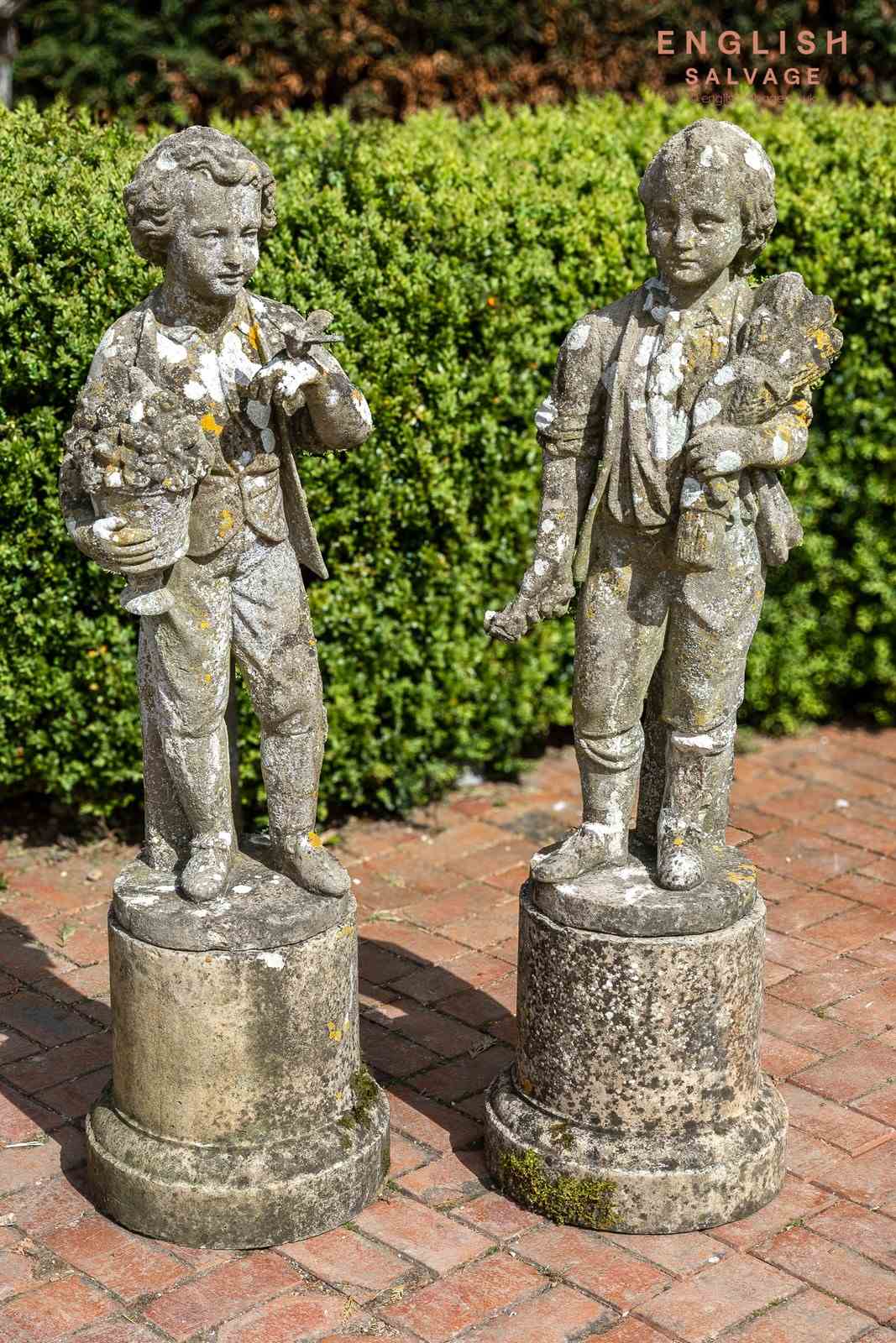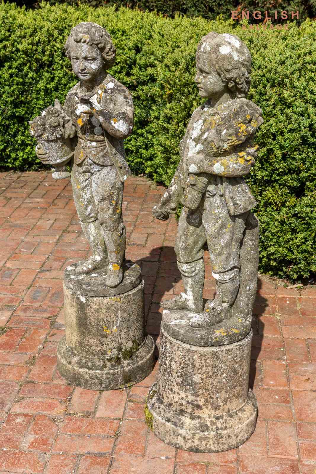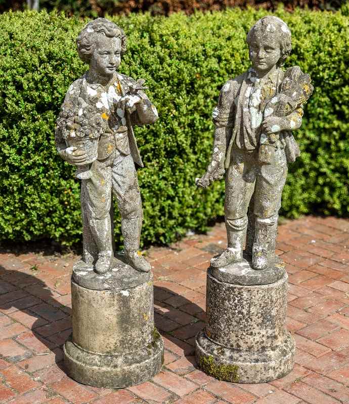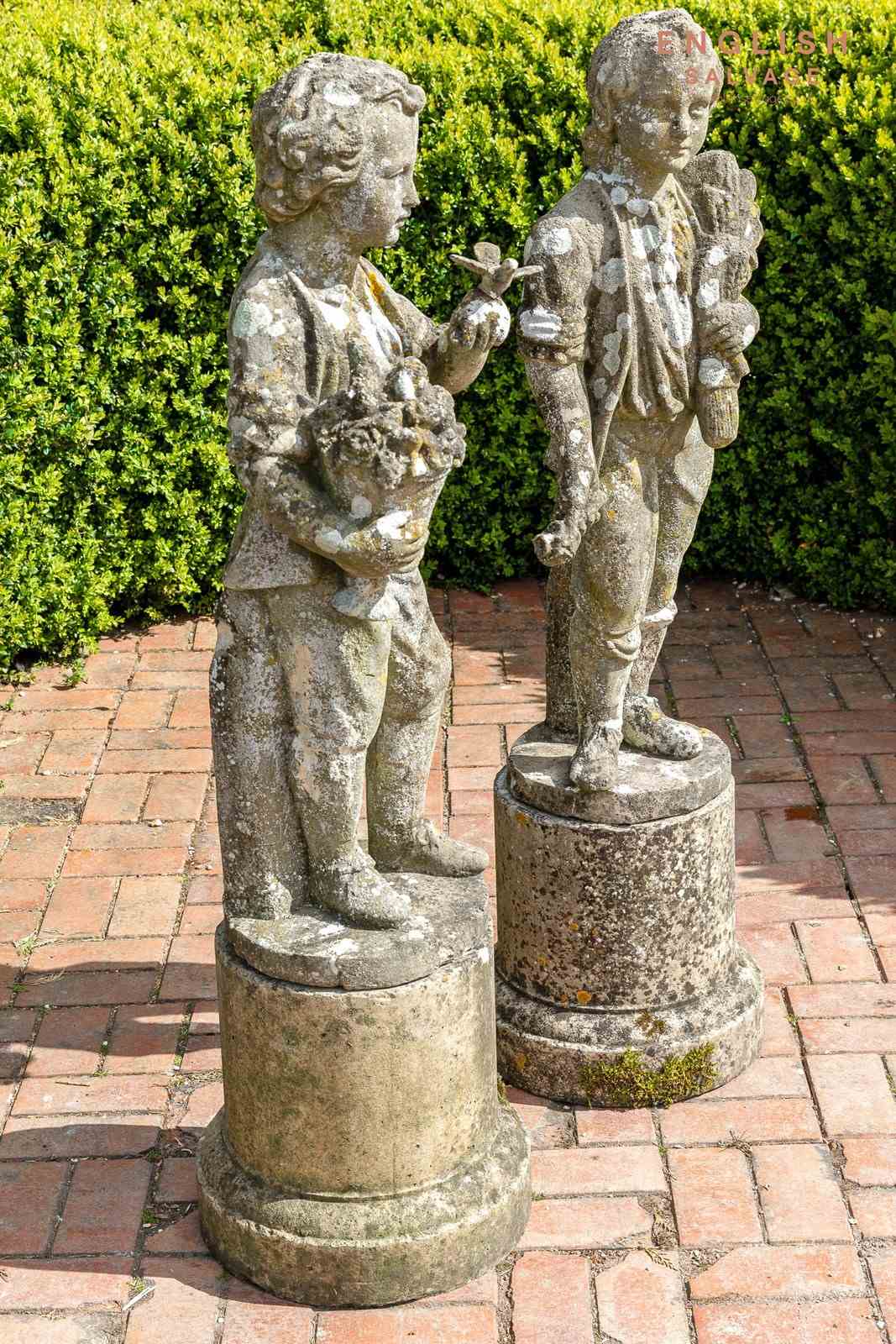 A pair of statues of boys circa 1900. The statues are really nicely weathered with a good layer of lichen. There are some old repairs but the statues are structurally good. The overall height measures: 37cm. The base of each measures: 39cm (h) and the base top measures 32cm (dia).