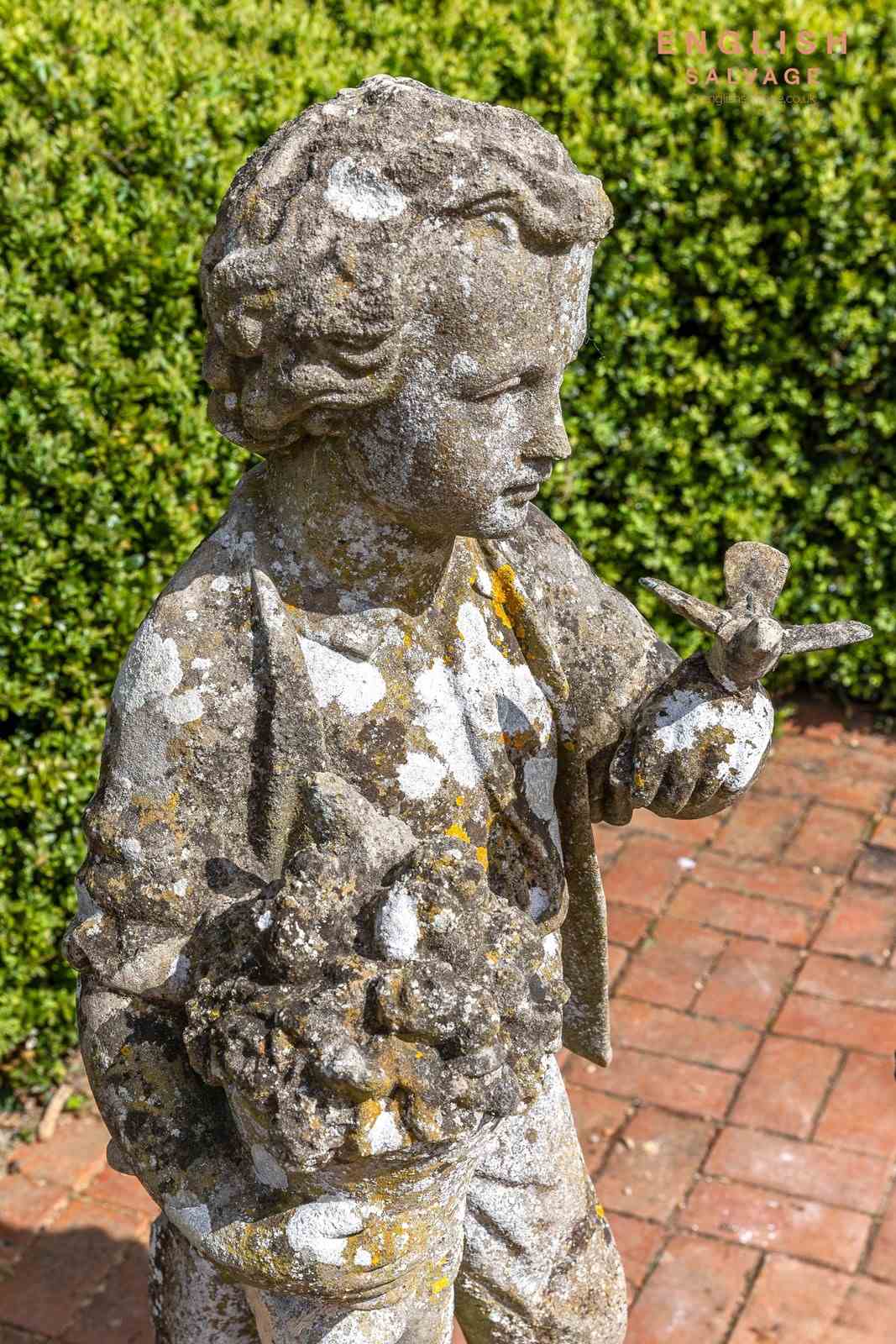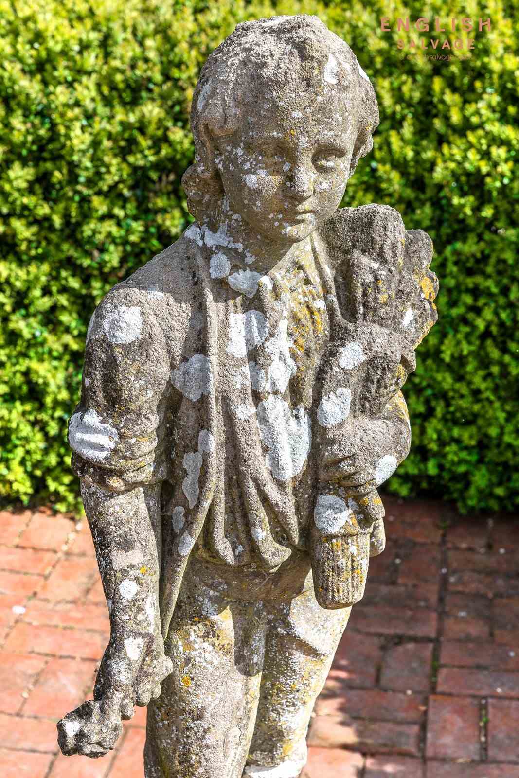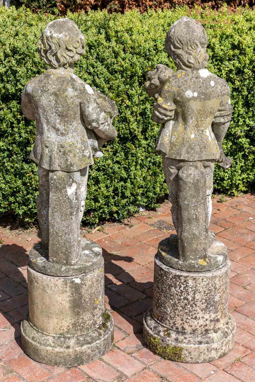 A pair of statues of boys circa 1900. The statues are really nicely weathered with a good layer of lichen. There are some old repairs but the statues are structurally good. The overall height measures: 37cm. The base of each measures: 39cm (h) and the base top measures 32cm (dia).