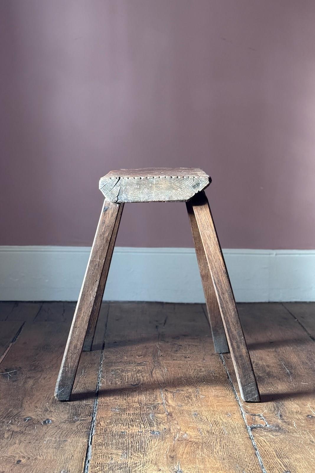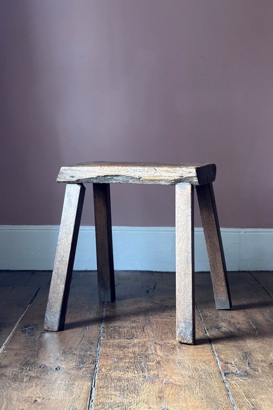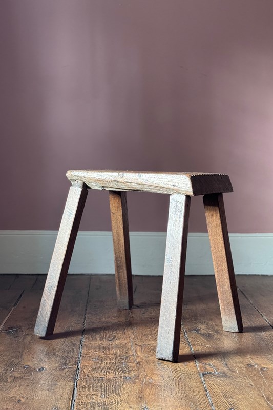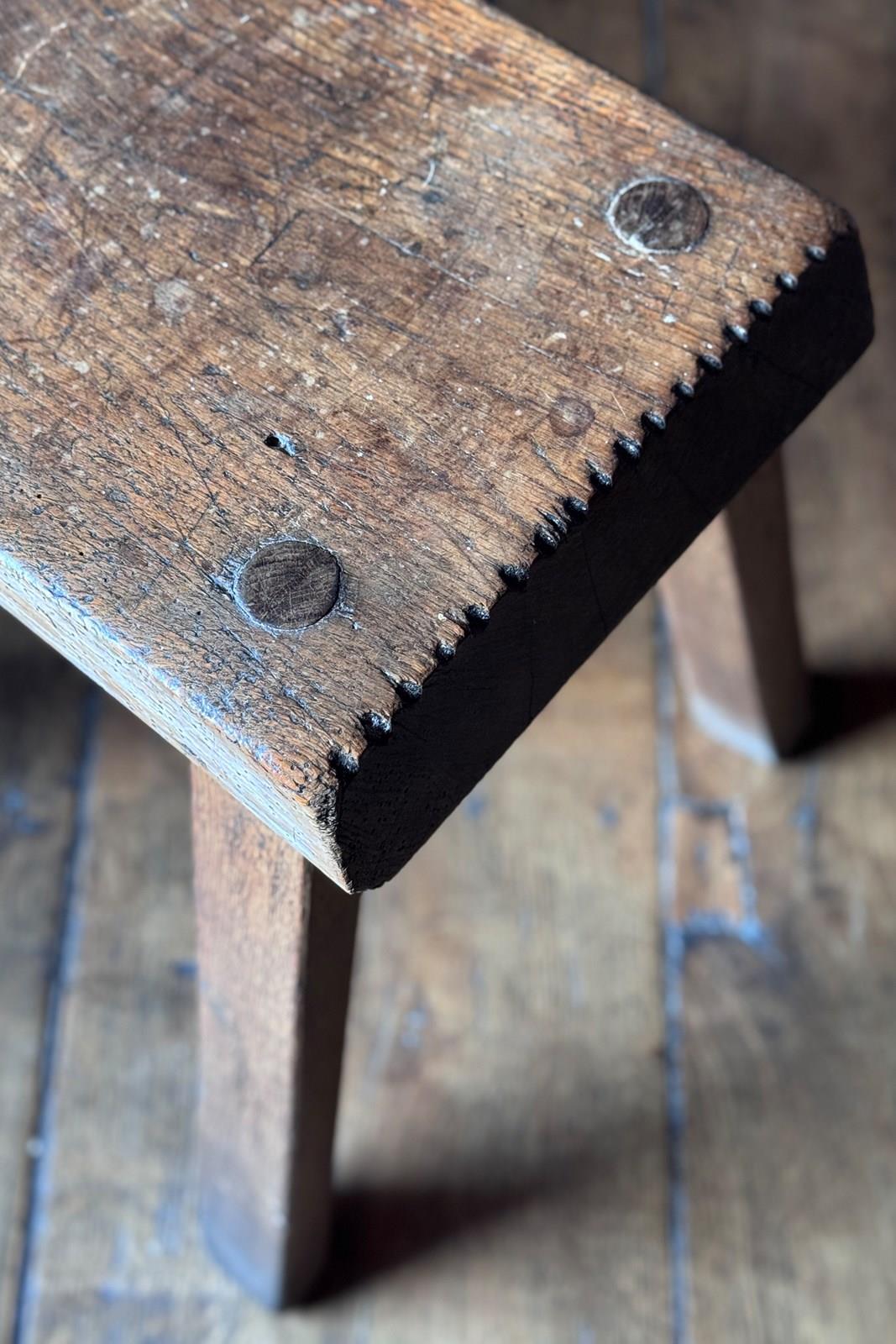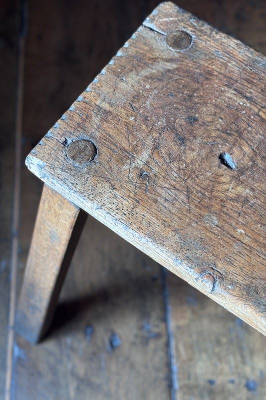 A lovely primitive 18th Century table, or stand. Oak legs under a thick slab Elm top with decorative notches cut into the ends - a regional feature common to the West Country. A really solid and useful piece of primitive country furniture.