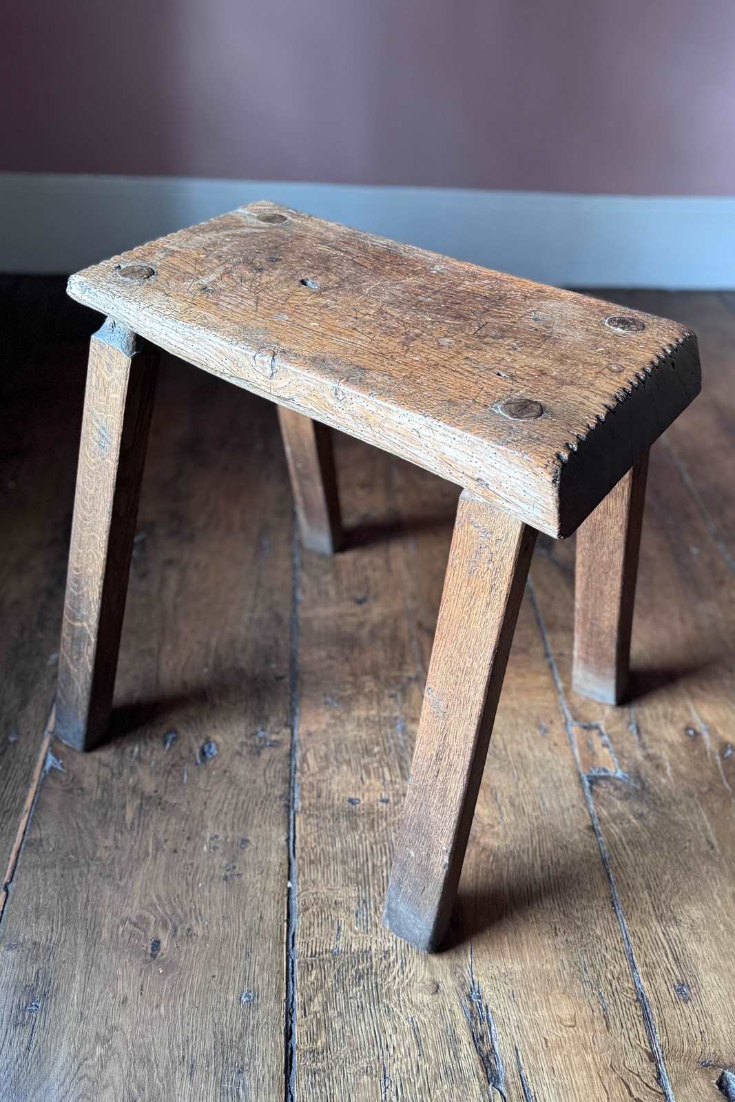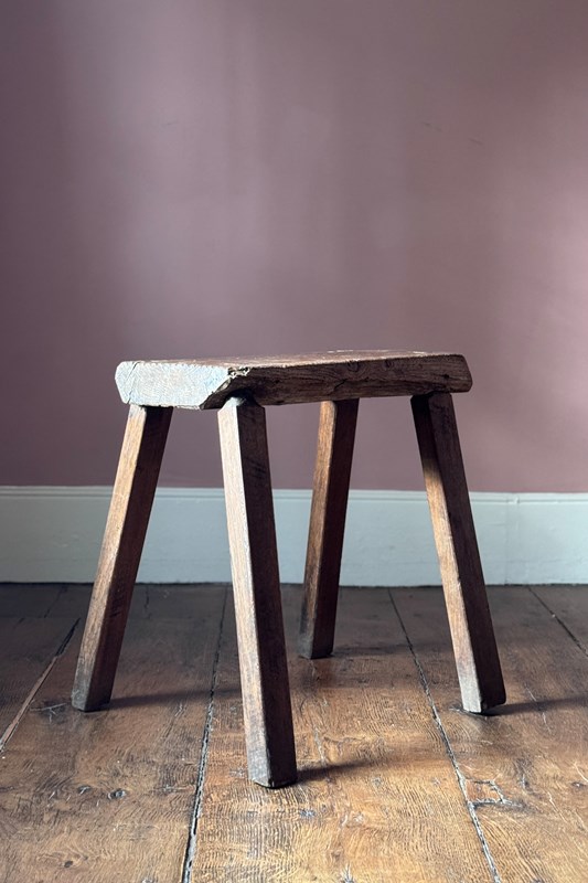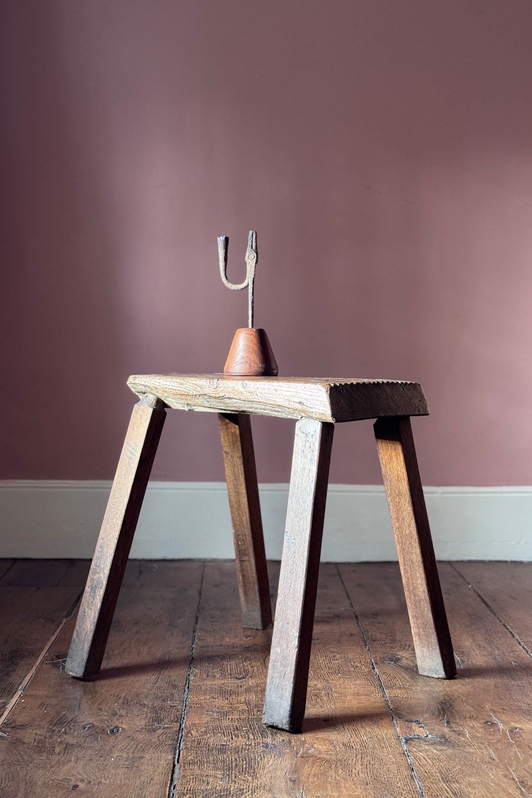 A lovely primitive 18th Century table, or stand. Oak legs under a thick slab Elm top with decorative notches cut into the ends - a regional feature common to the West Country. A really solid and useful piece of primitive country furniture.
