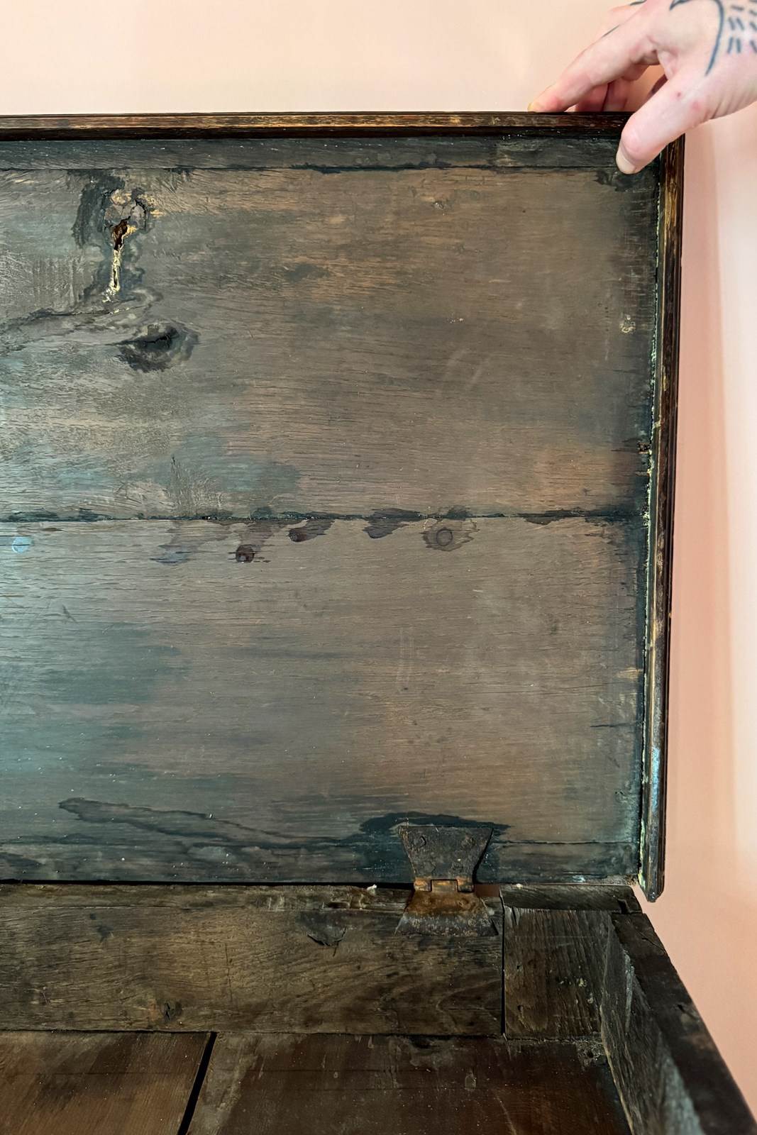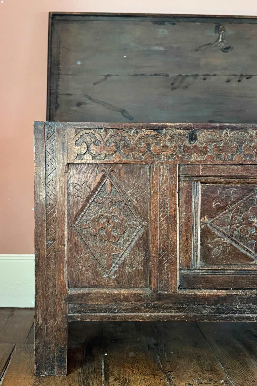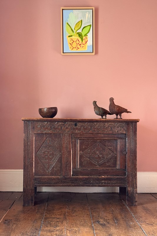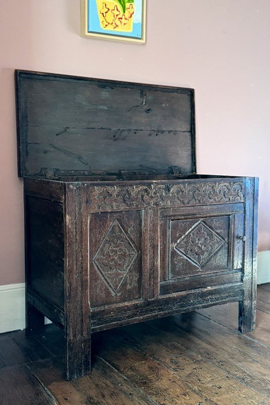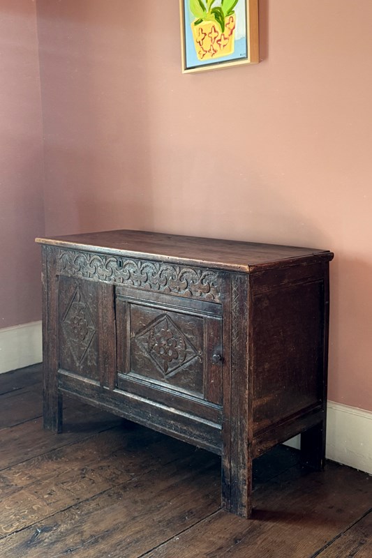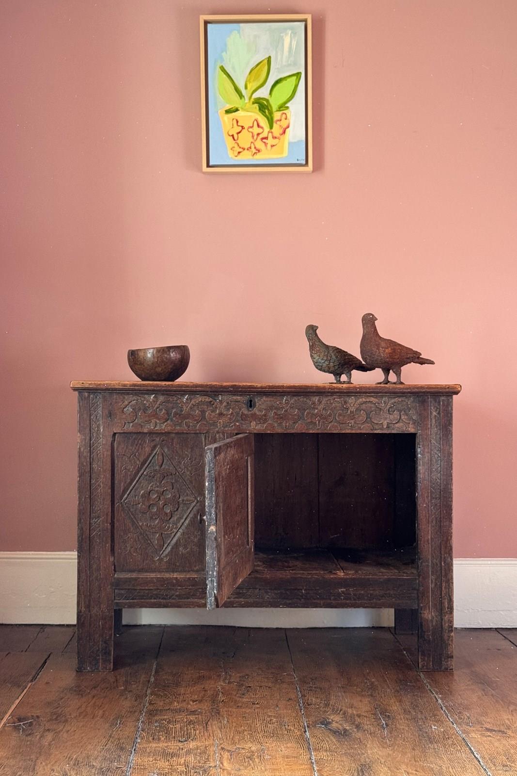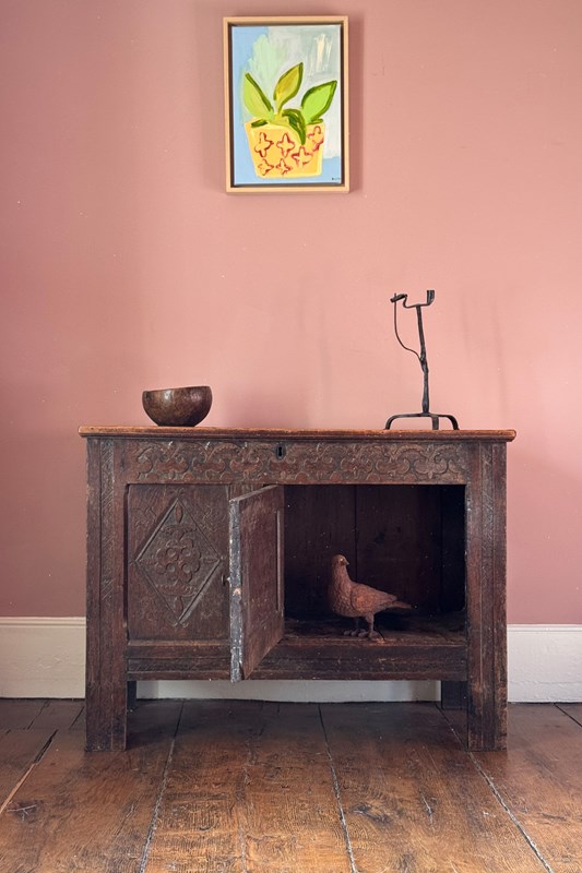 A chunky 18th century Welsh cupboard with a carved front, single door and lidded top. Really useful piece of primitive furniture that would work in any room. Sourced in Anglesey.
