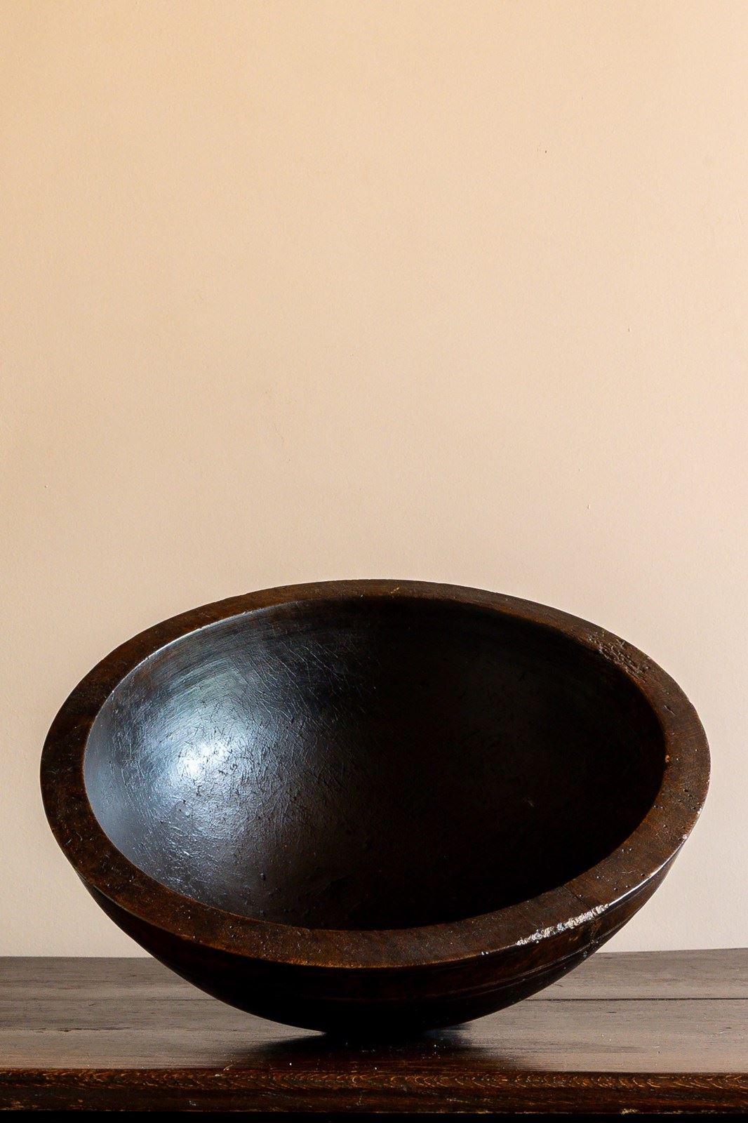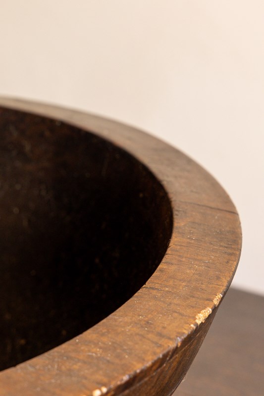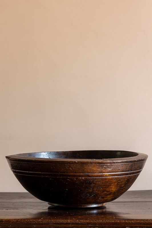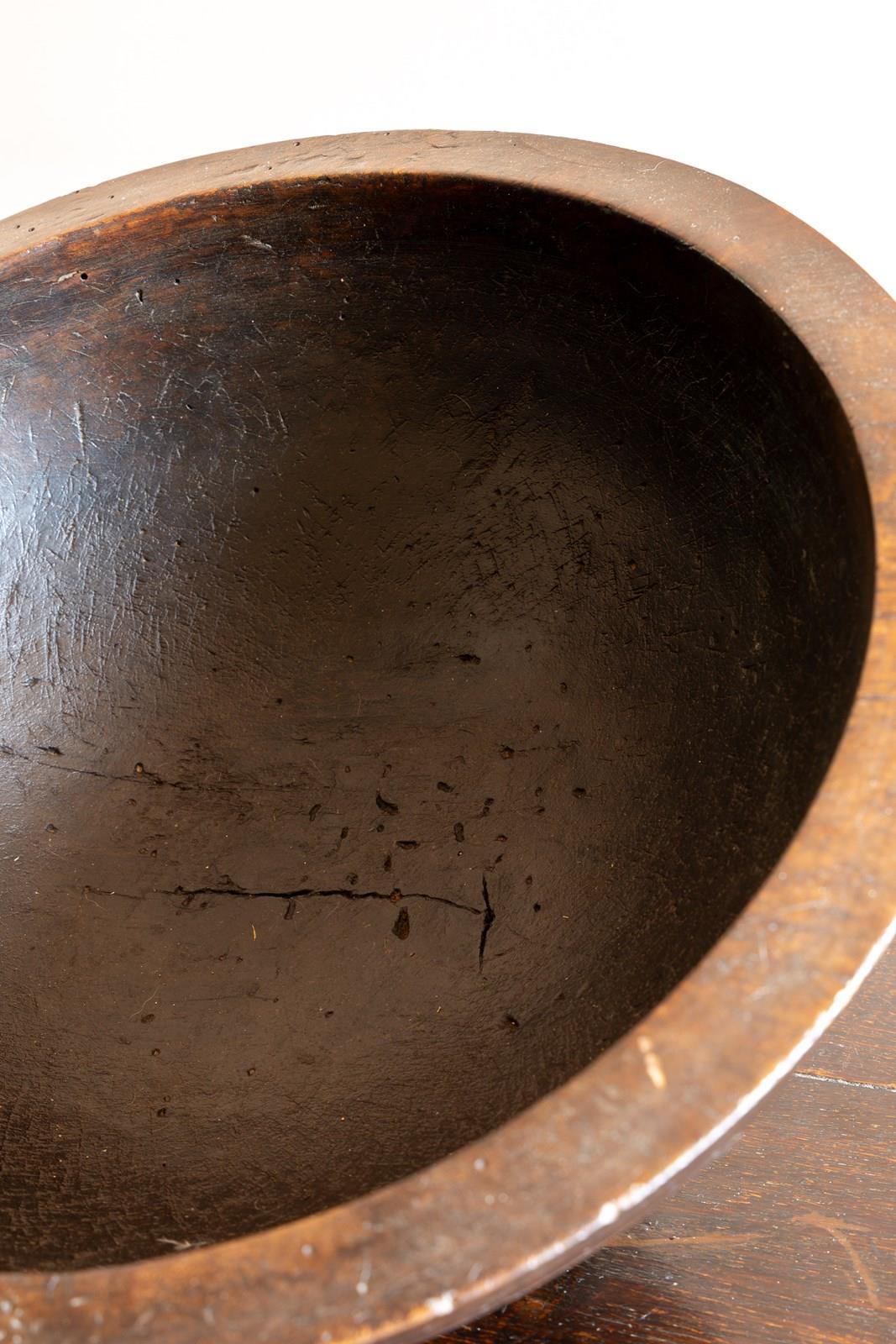 A large early 19th Century turned sycamore dairy bowl, in a beautiful dark colour with line decoration and lots of character.