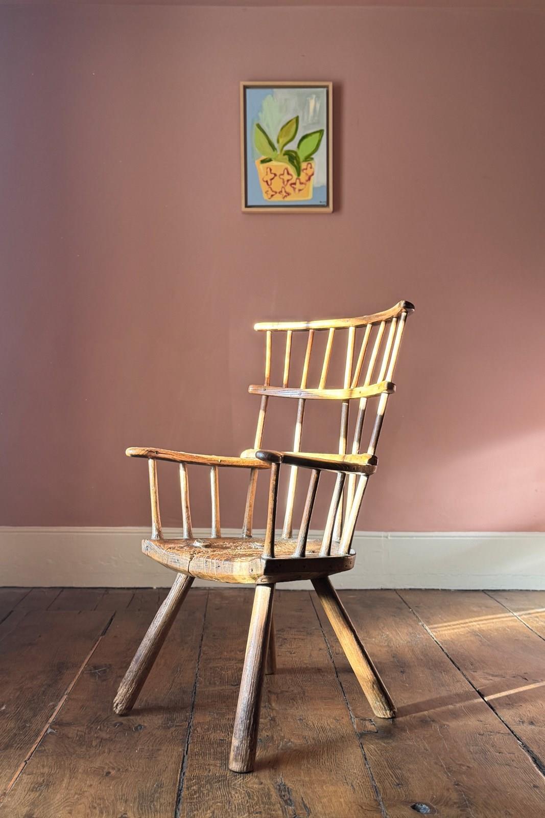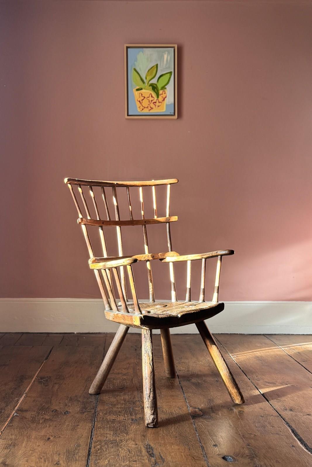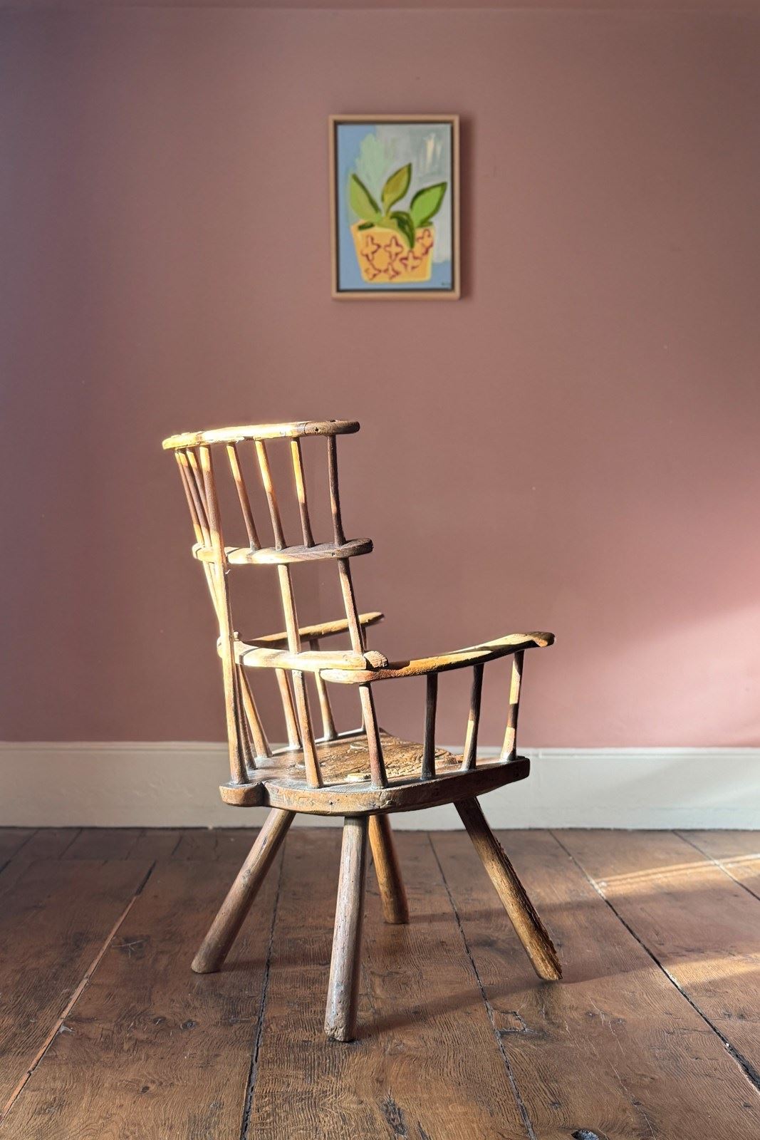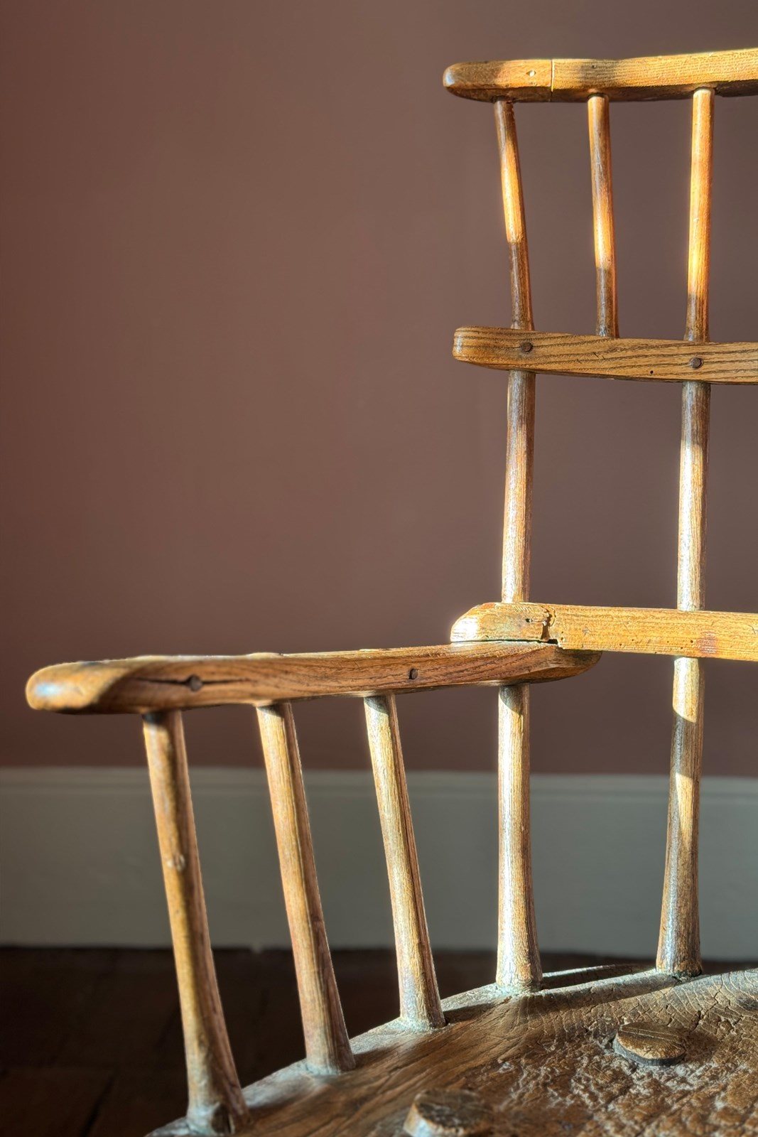 An extremely rare primitive late 18th or early 19th century Windsor chair. This extraordinary triple back chair likely came from the West Country although it’s difficult to be certain due to its rarity. It’s stunning shape and unusual triple back construction make it truly unique. We can find only one reference to a similar one in Michael Harding-Hills book Windsor Chairs where he states ‘I have only ever seen one English Windsor with an extension to the back row’, but sadly he doesn’t include an image. Constructed in Elm and Ash with some historic repairs that add more character and charm to a chair that is already full of personality this one is very special indeed. Our theory is that it was a one off commission or that it was a chair-maker enjoying a challenge by making a unique chair for their own use and pleasure.
