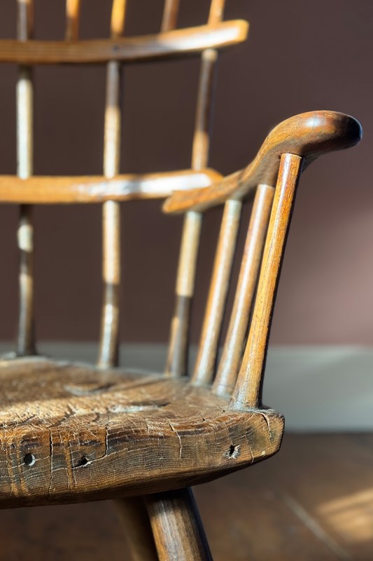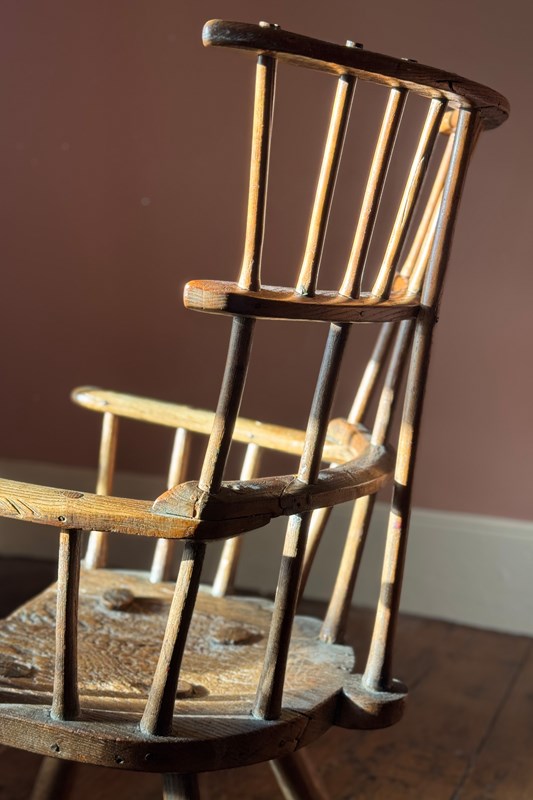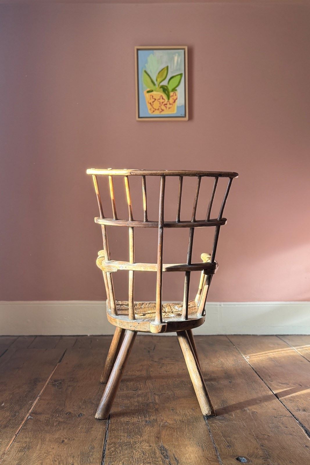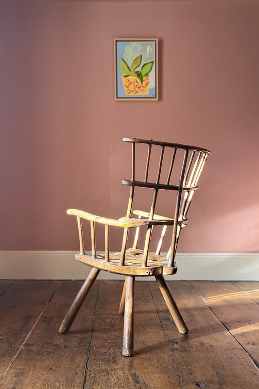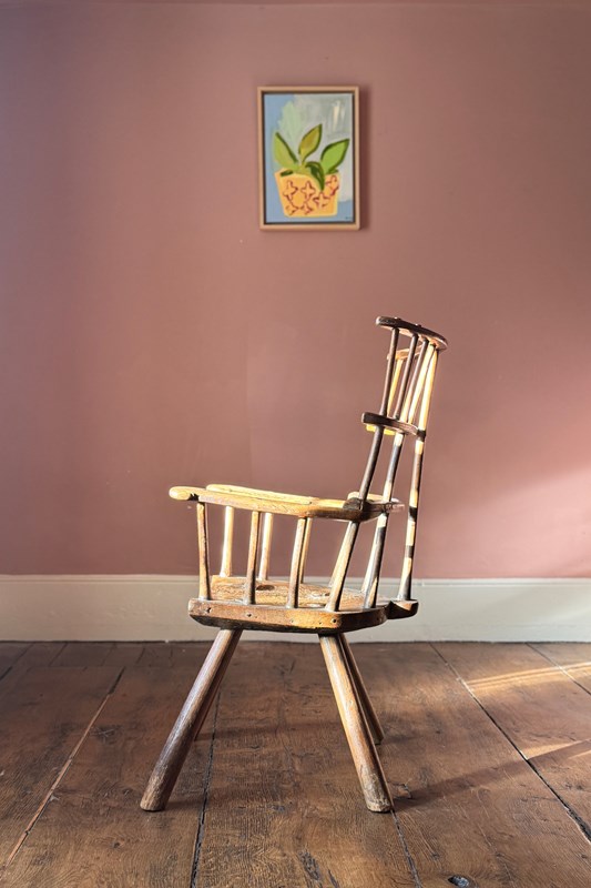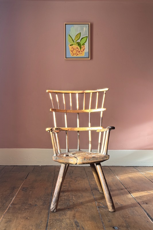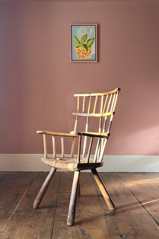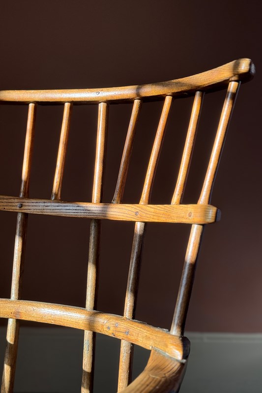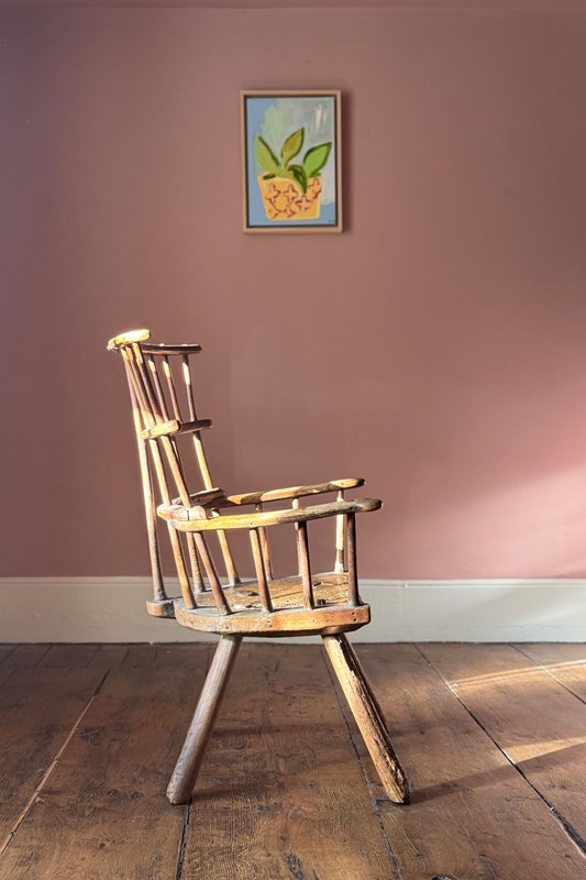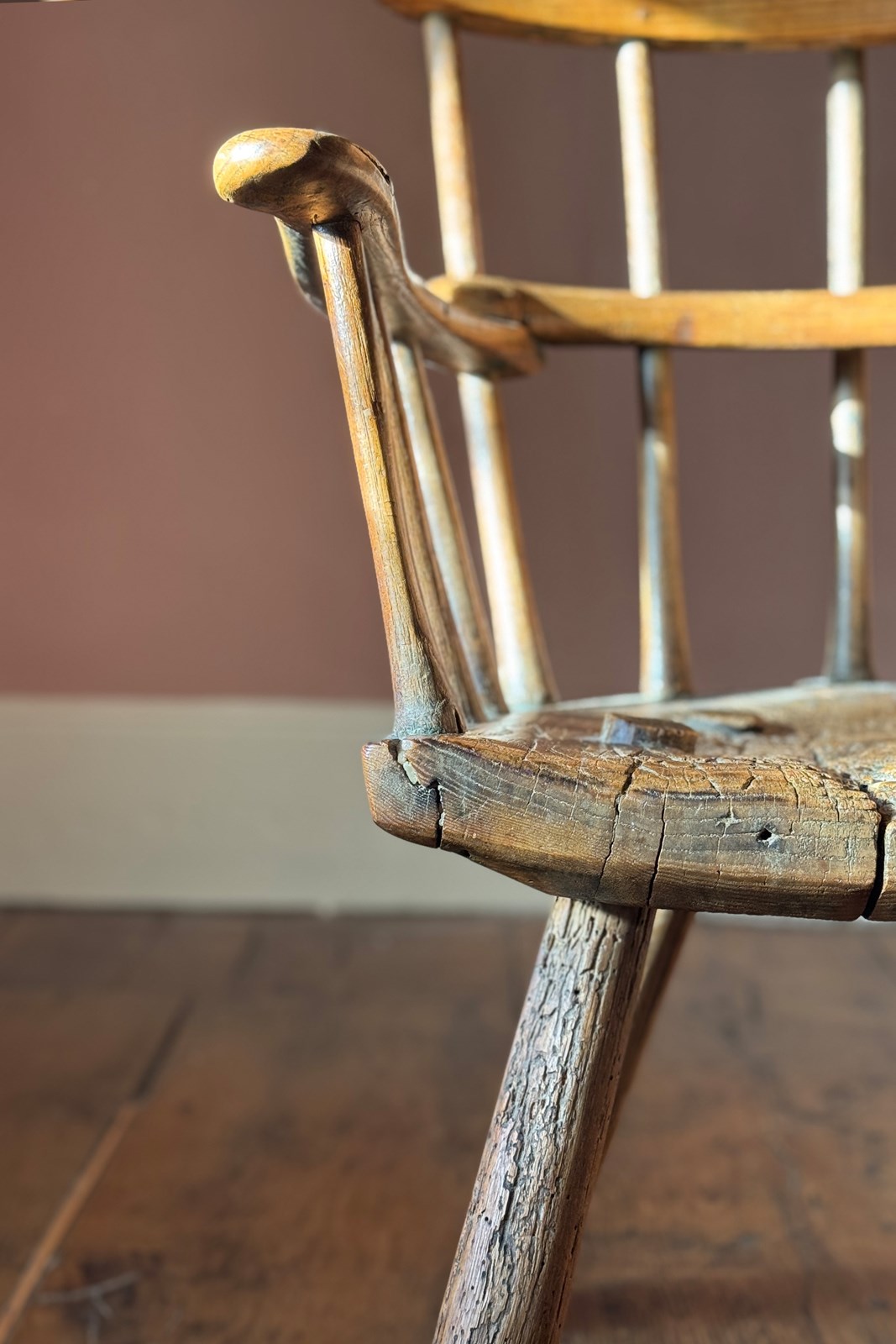 An extremely rare primitive late 18th or early 19th century Windsor chair. This extraordinary triple back chair likely came from the West Country although it’s difficult to be certain due to its rarity. It’s stunning shape and unusual triple back construction make it truly unique. We can find only one reference to a similar one in Michael Harding-Hills book Windsor Chairs where he states ‘I have only ever seen one English Windsor with an extension to the back row’, but sadly he doesn’t include an image. Constructed in Elm and Ash with some historic repairs that add more character and charm to a chair that is already full of personality this one is very special indeed. Our theory is that it was a one off commission or that it was a chair-maker enjoying a challenge by making a unique chair for their own use and pleasure.