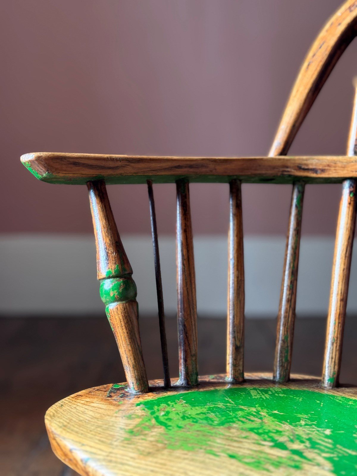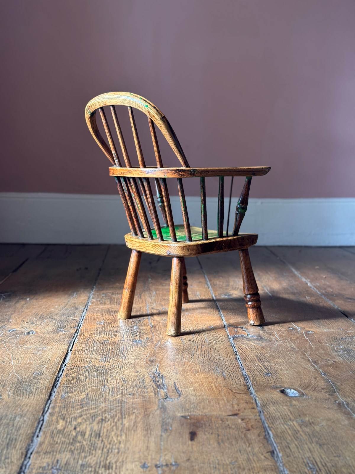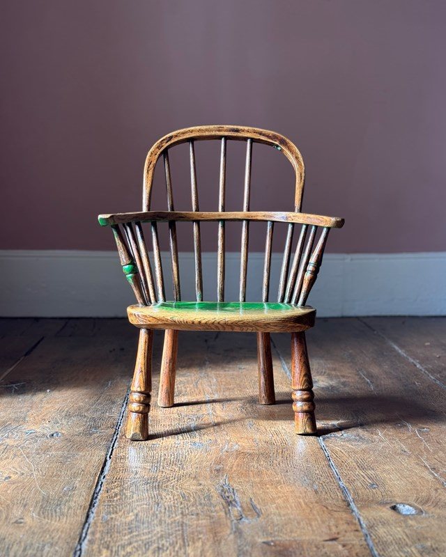 A really joyful little 19th Century child’s Windsor chair. Much loved with tons of character this chair has beautiful remnants of historic green paint, a replacement spindle in metal, and another spindle half missing, all of which add to its wonderful character. Solid and useable it’s a great chair.
