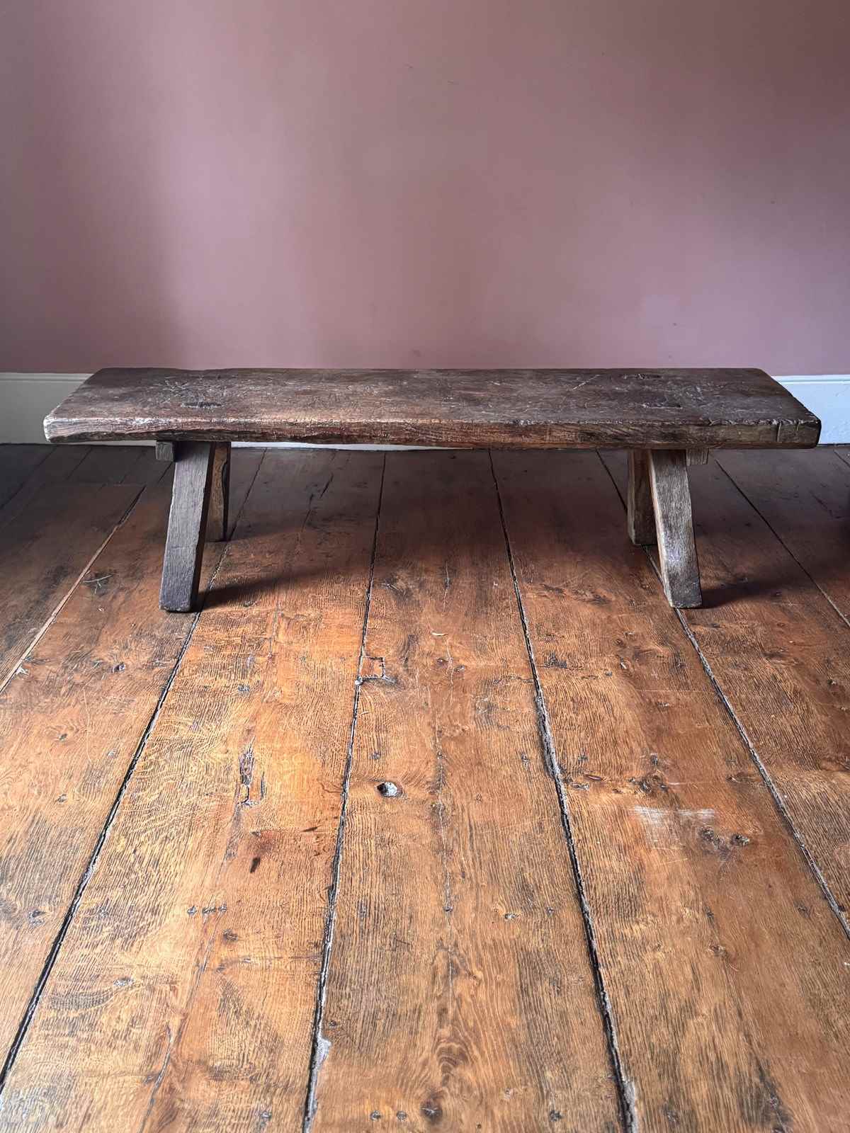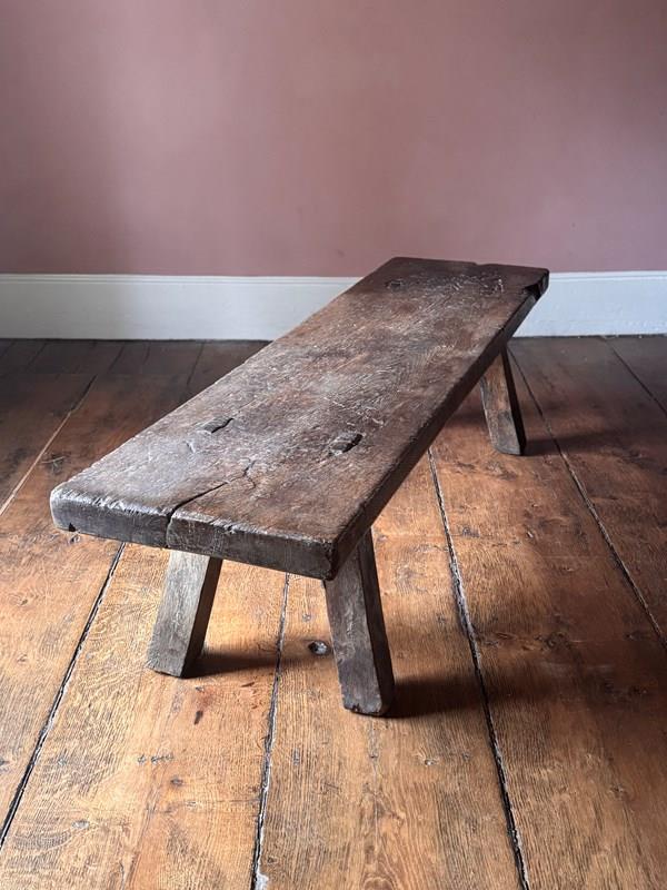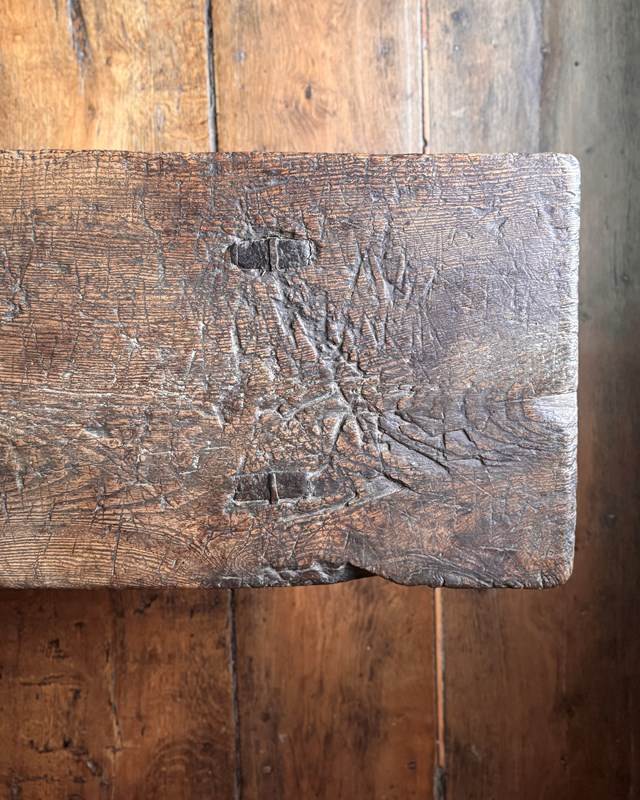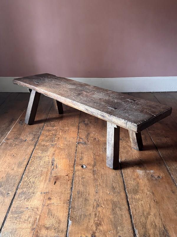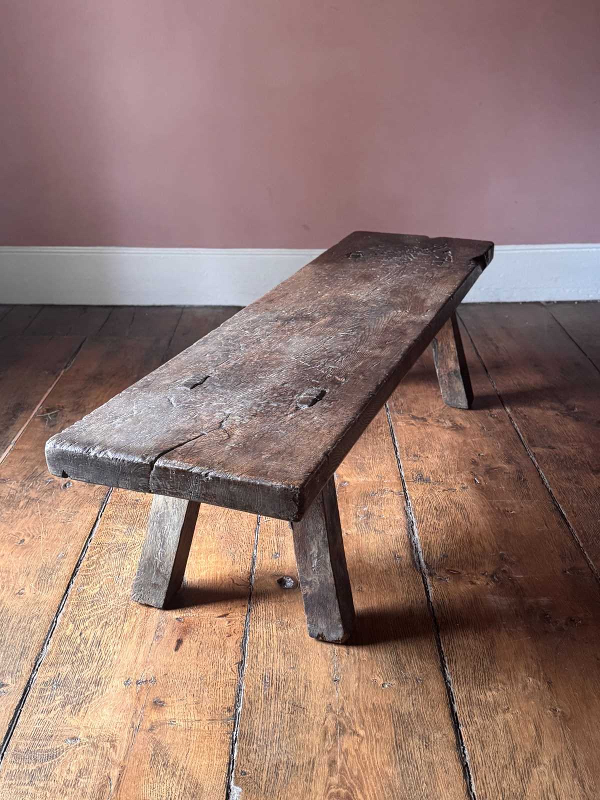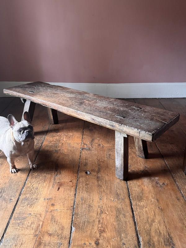 An excellent 19th century oak big bench. Heavy, with a beautifully worn top showing over a century of use, this solid oak pig bench is ideal as either a large bench or a coffee table. A really good primitive piece of vernacular furniture.