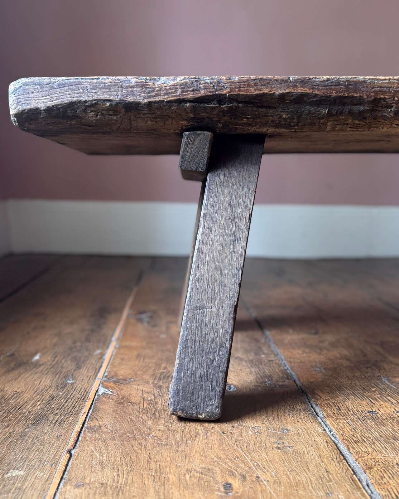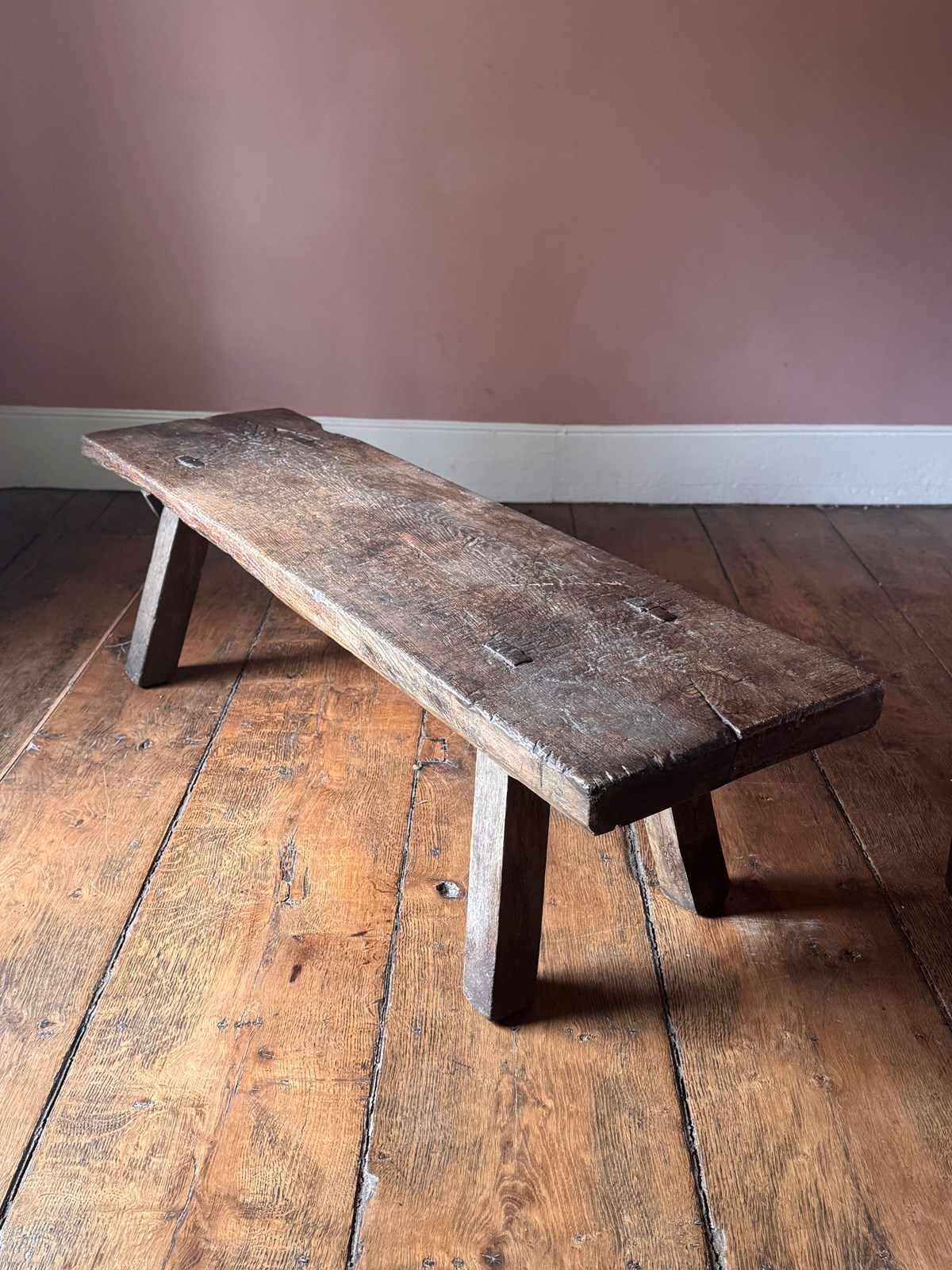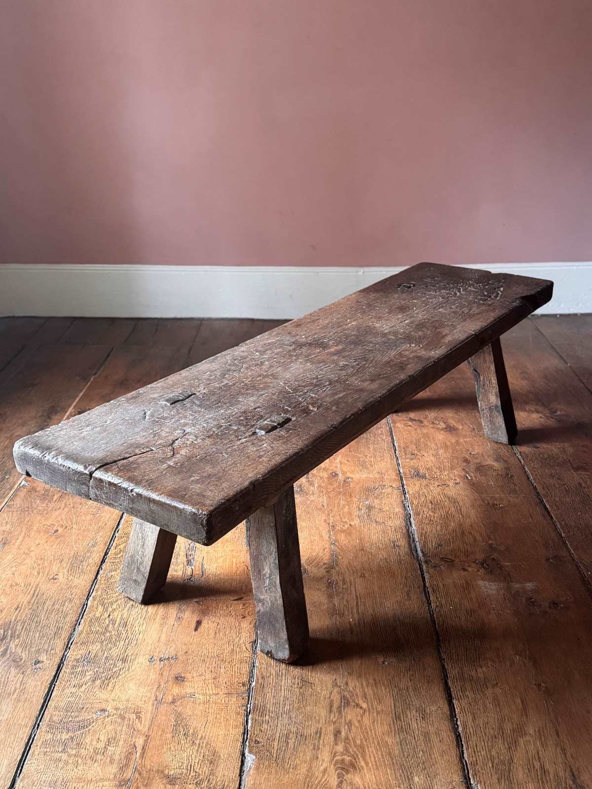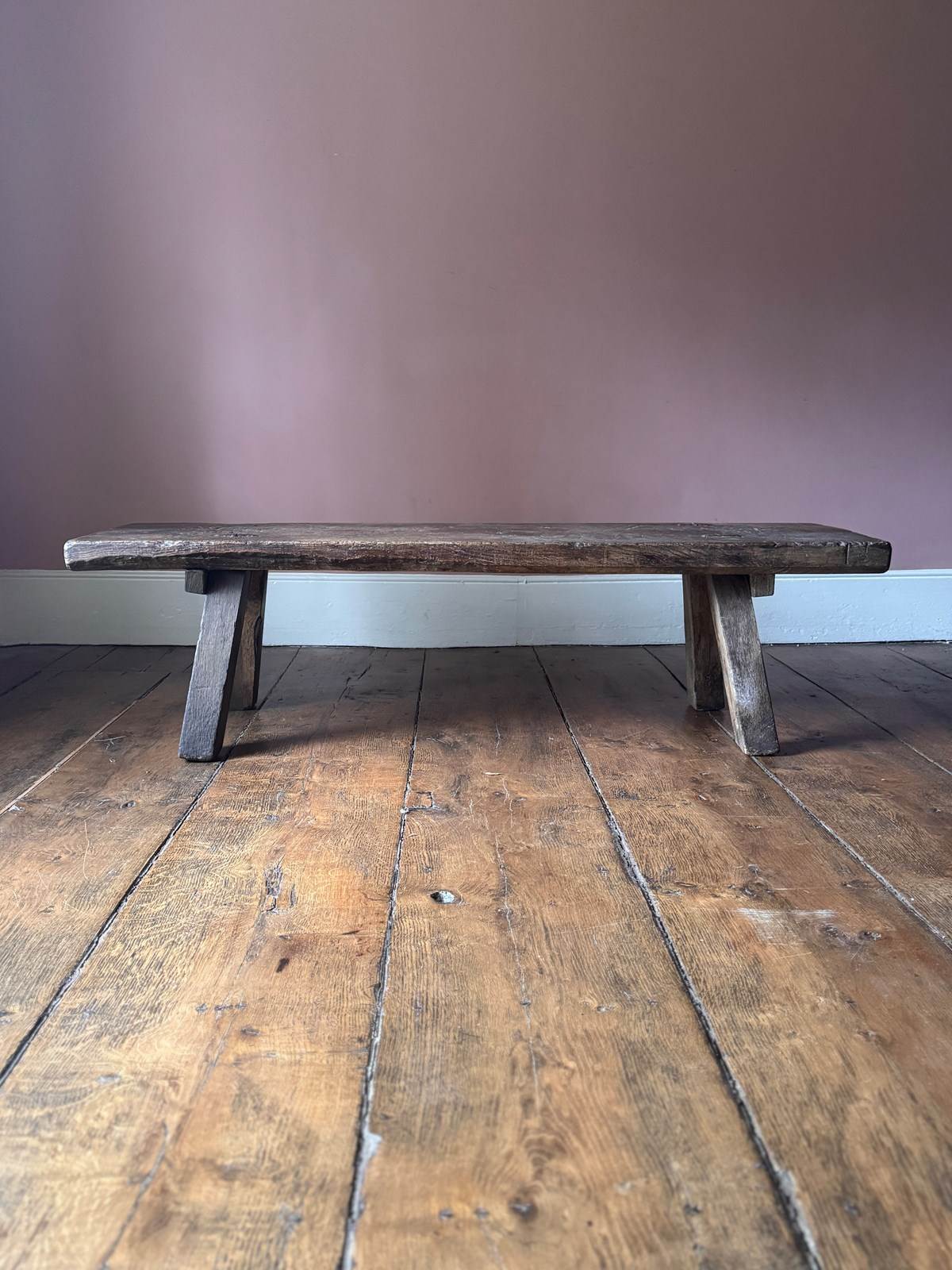 An excellent 19th century oak big bench. Heavy, with a beautifully worn top showing over a century of use, this solid oak pig bench is ideal as either a large bench or a coffee table. A really good primitive piece of vernacular furniture.