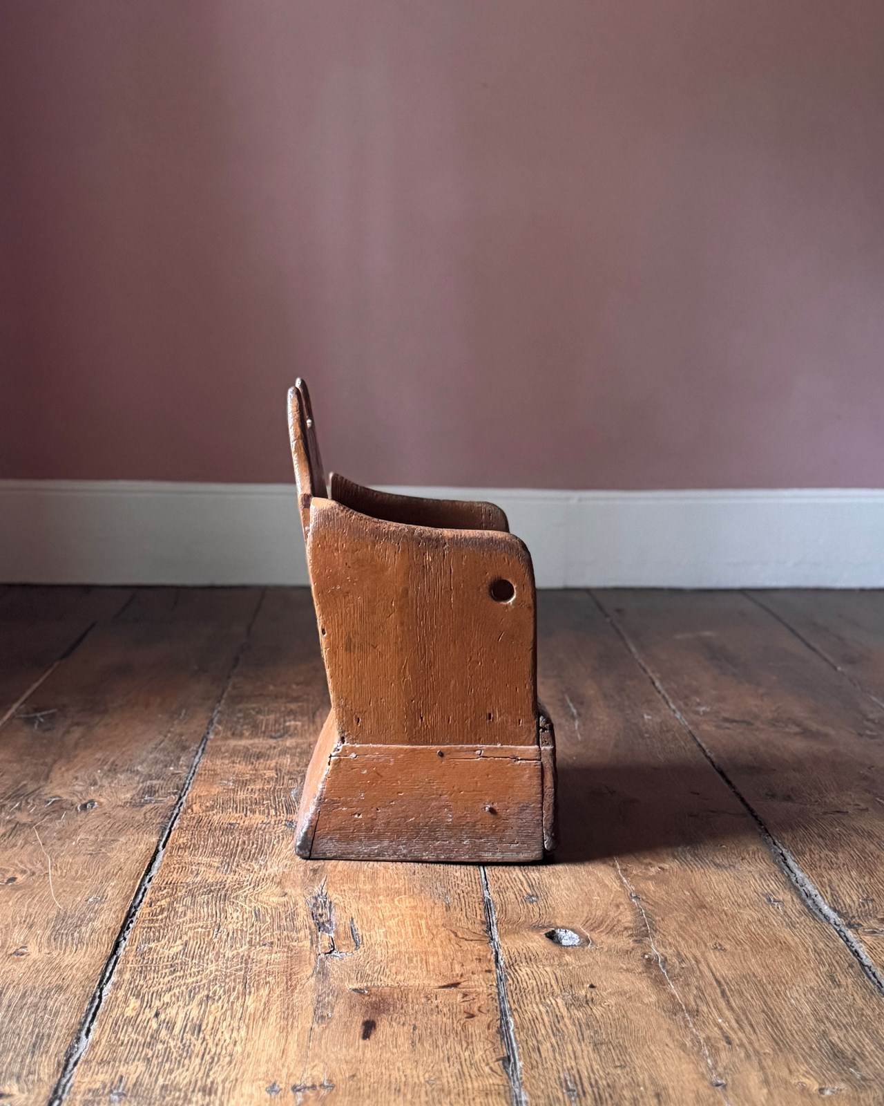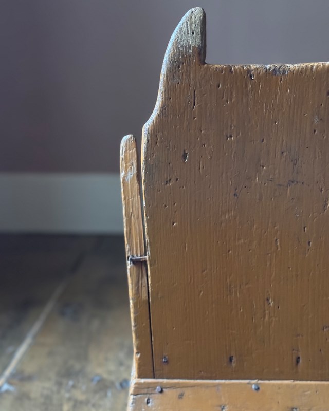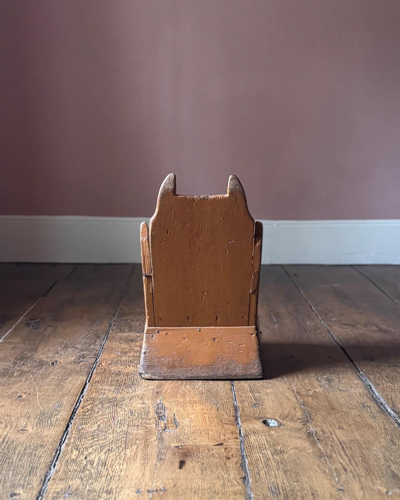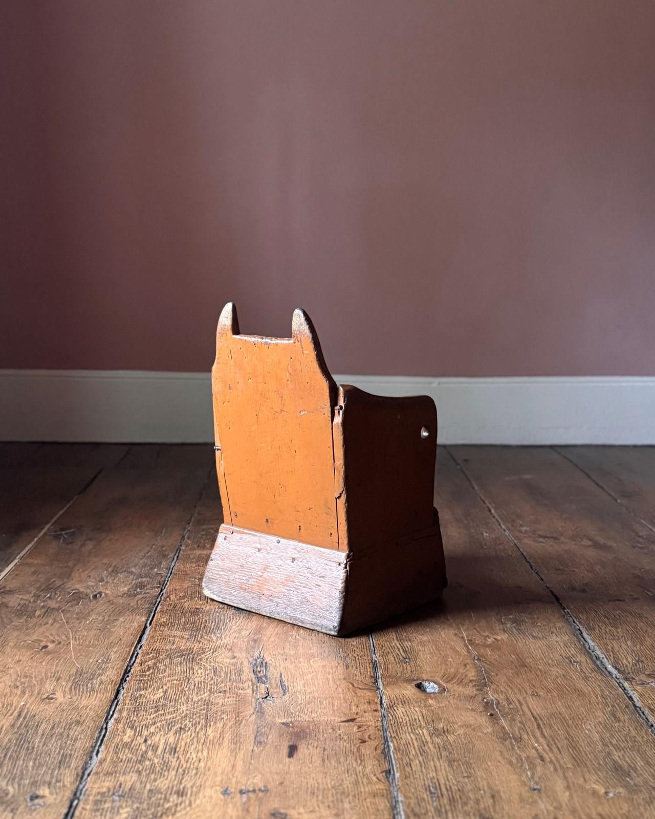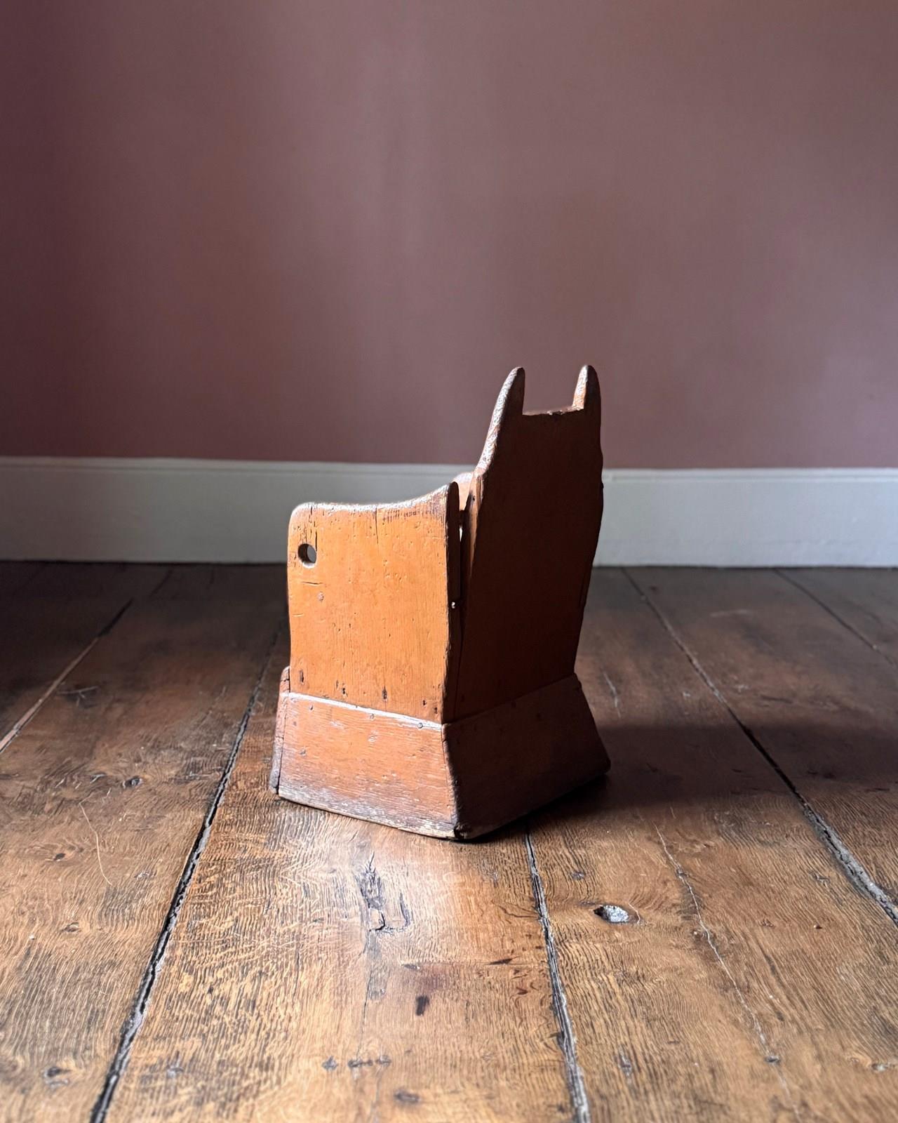 A beautifully primitive 19th Century Welsh lambing chair in original historic orange paint. Wonderfully simple construction and very evocative object. It looks like Batman.