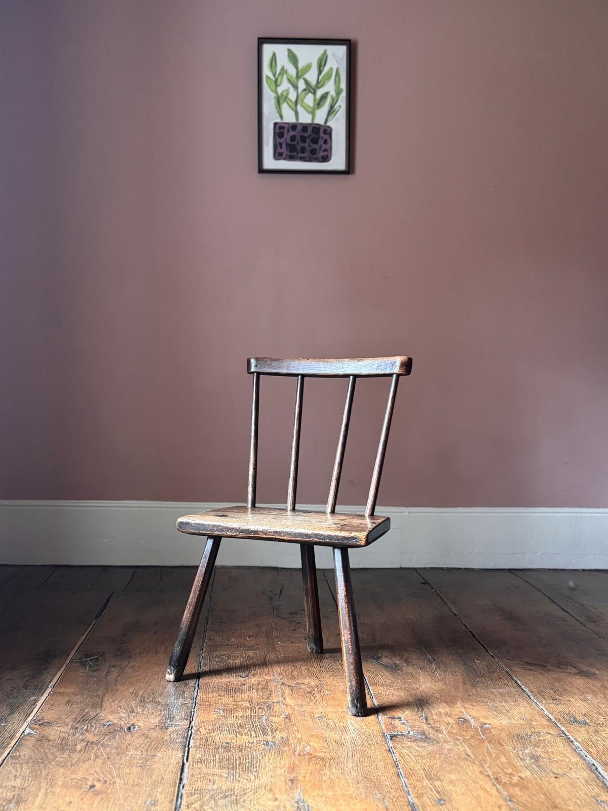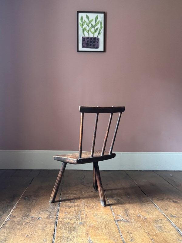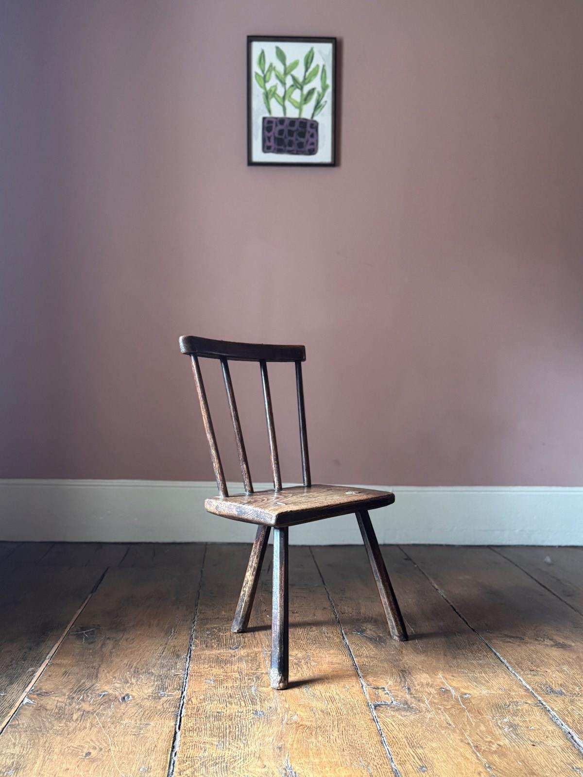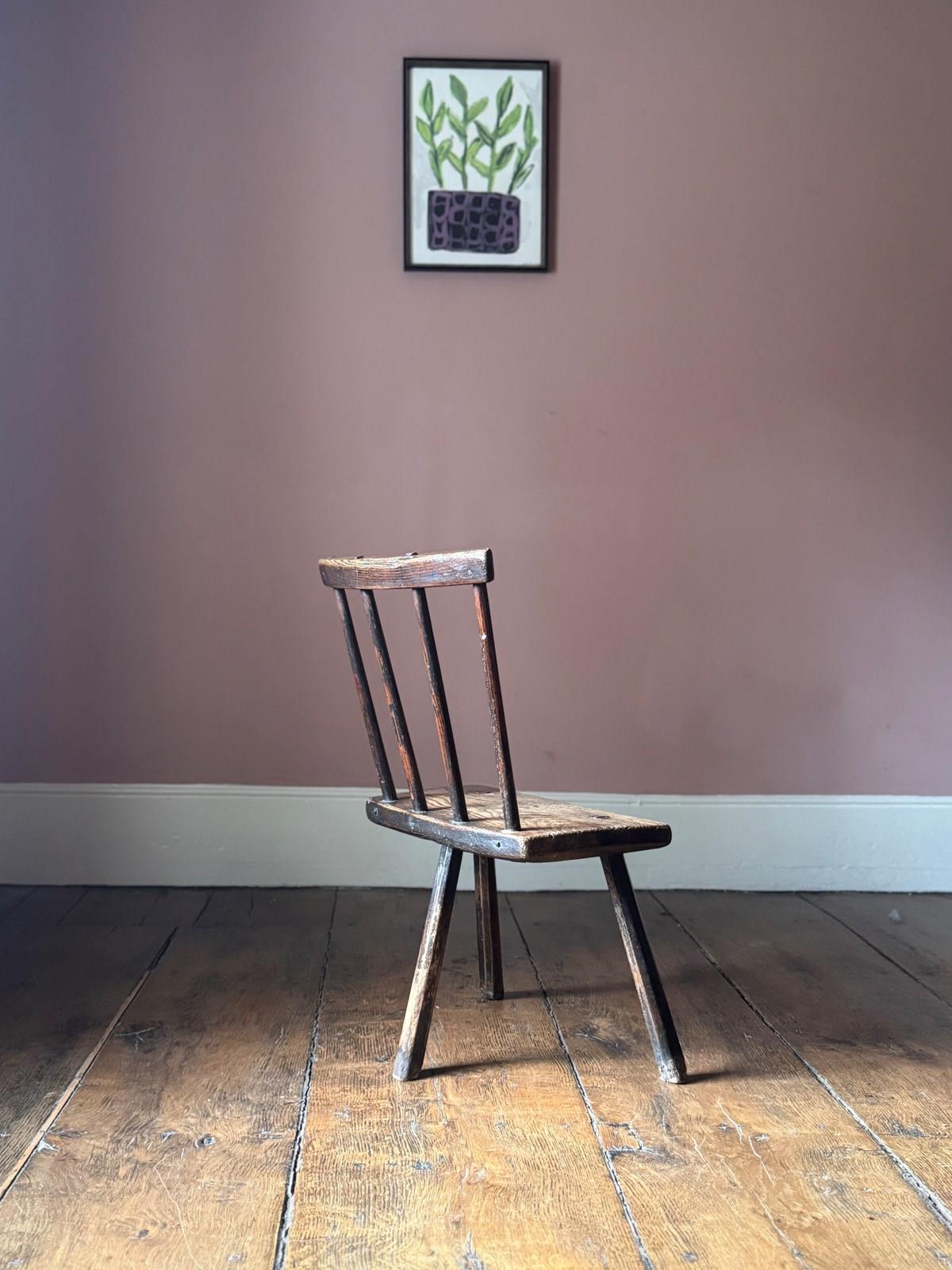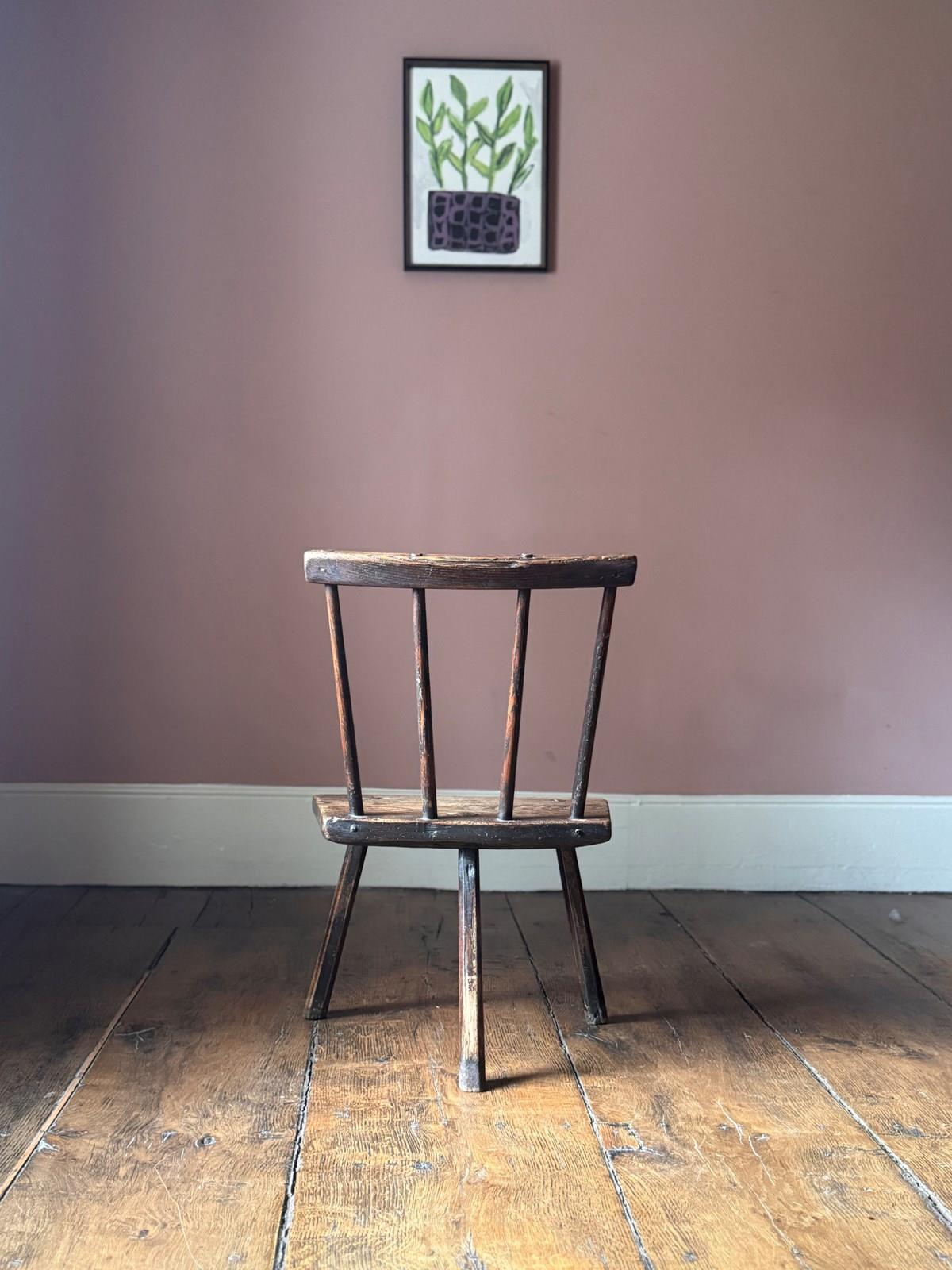 A rare 18th Century stick chair from West Wales. This is the simplest form of stick chair, also known as a back stool. In elm and ash, and on three legs, it’s a rare survivor of Welsh vernacular seating. Highly sculptural and totally original, it’s a wonderful chair.