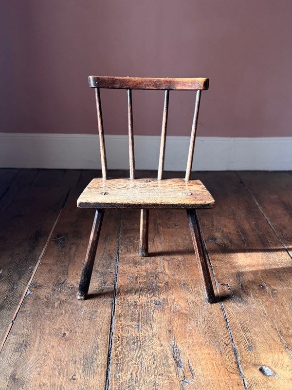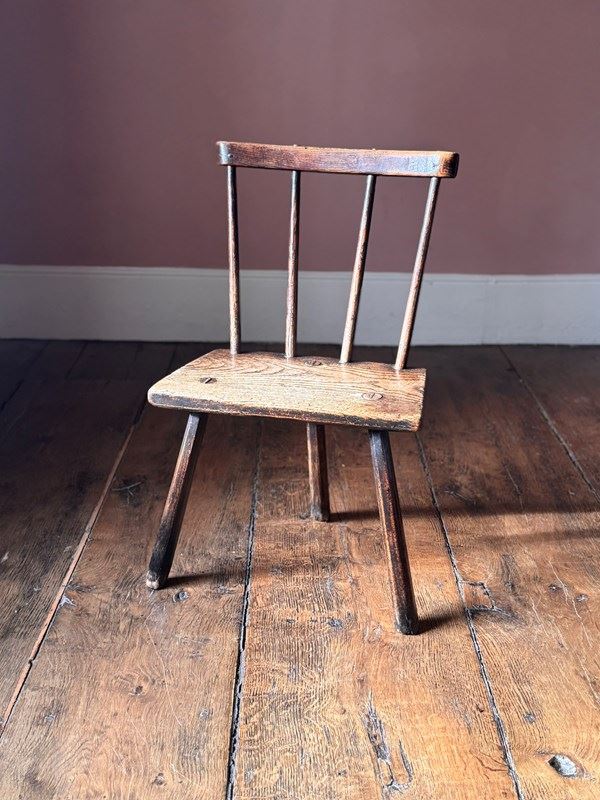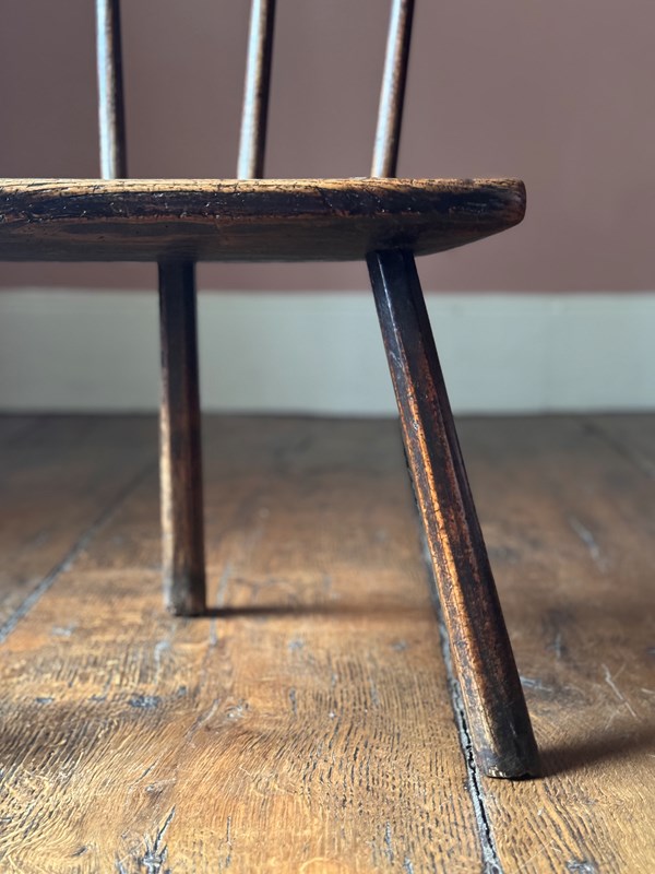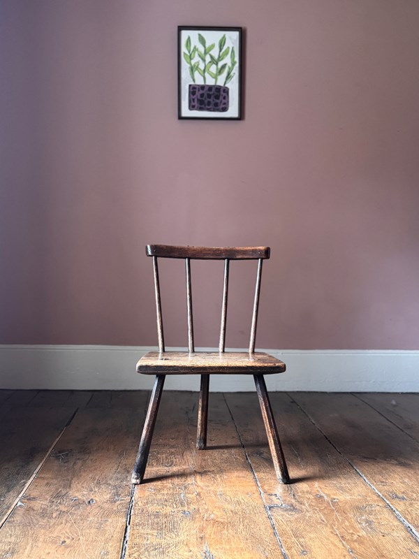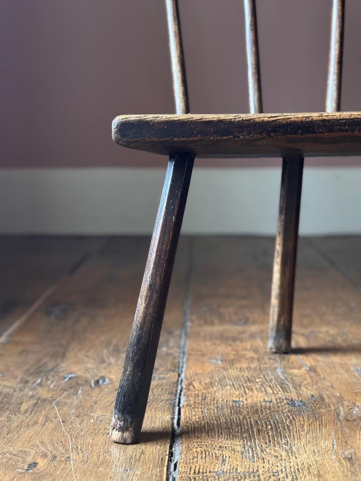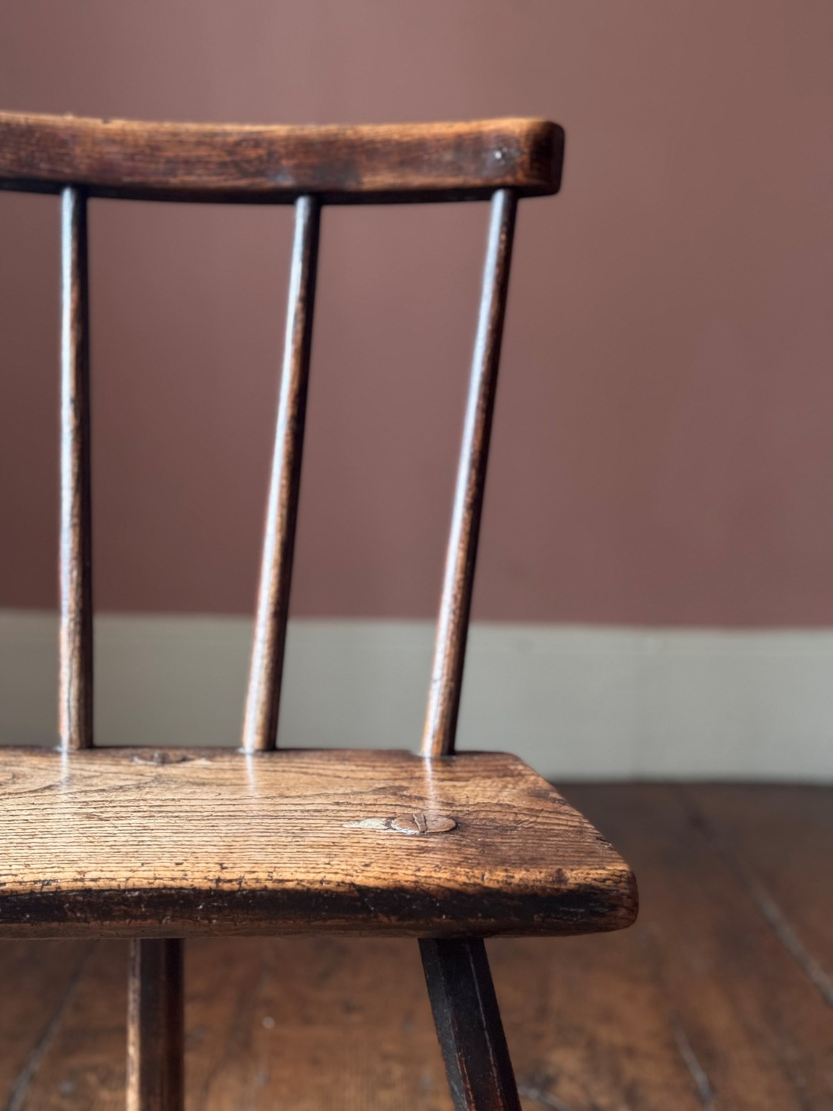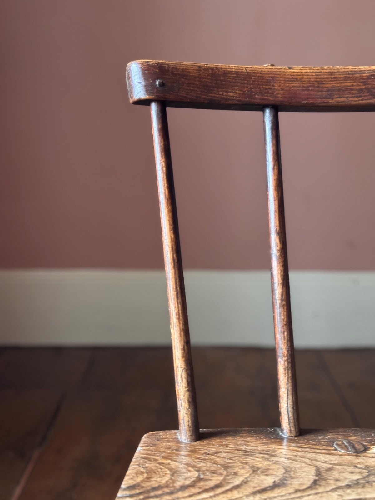 A rare 18th Century stick chair from West Wales. This is the simplest form of stick chair, also known as a back stool. In elm and ash, and on three legs, it’s a rare survivor of Welsh vernacular seating. Highly sculptural and totally original, it’s a wonderful chair.