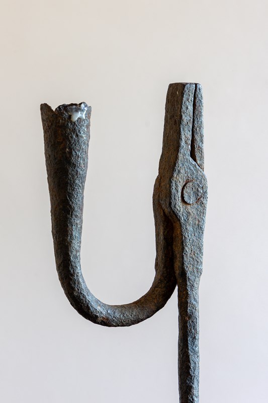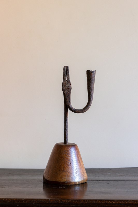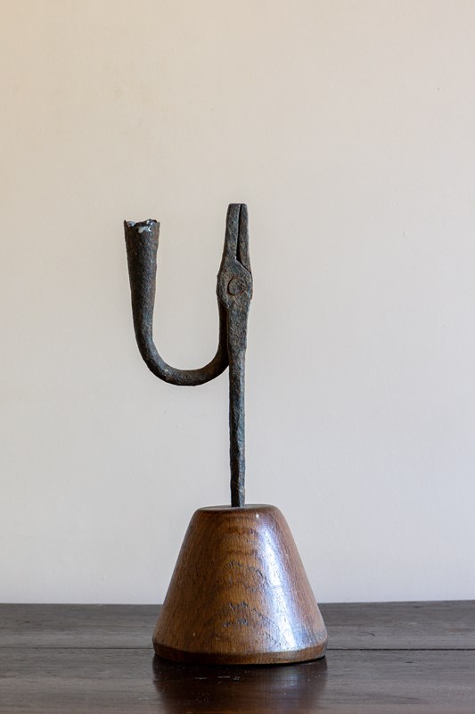 A rare and attractive 19th Century Irish iron rushlight mounted on it’s original wooden base.