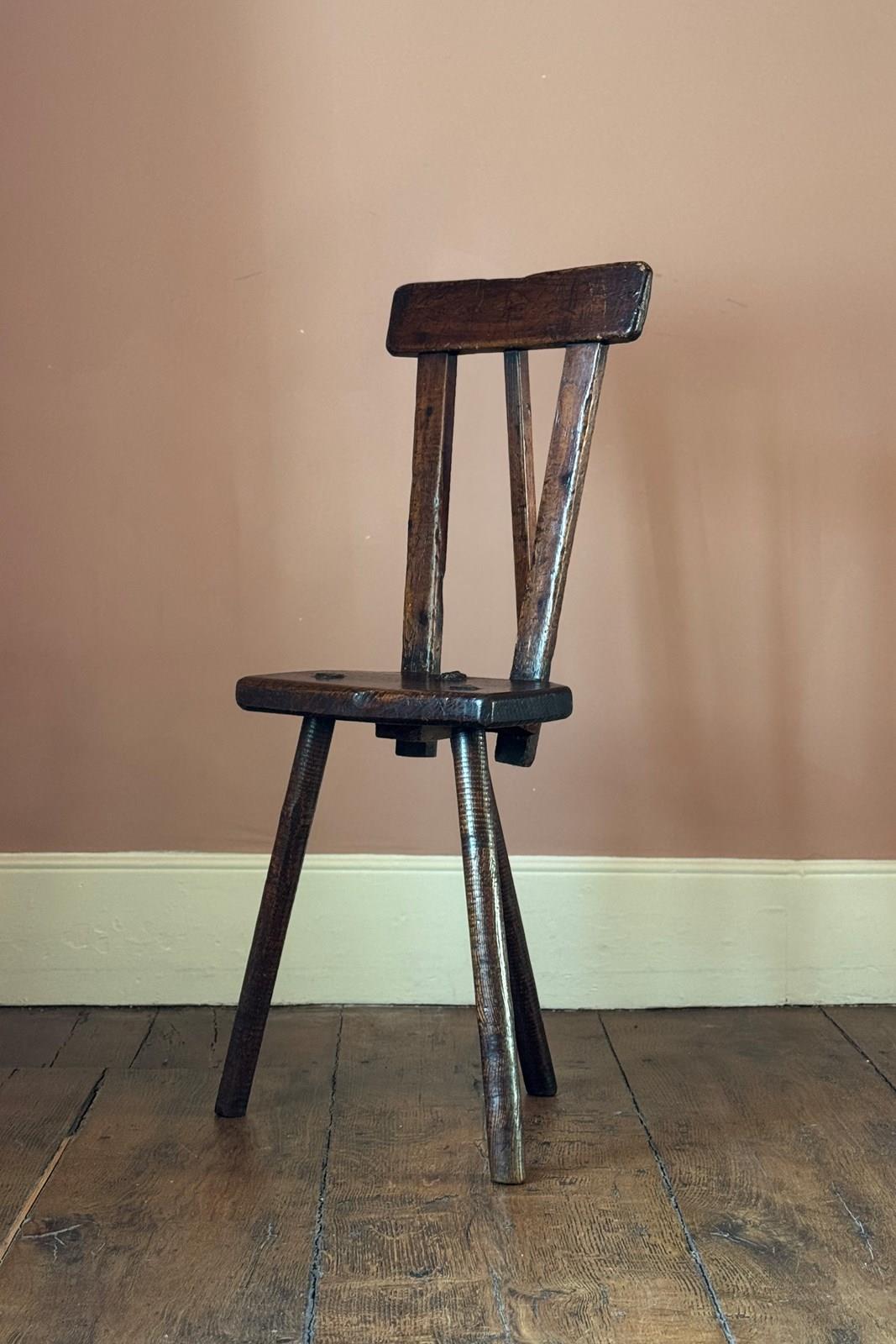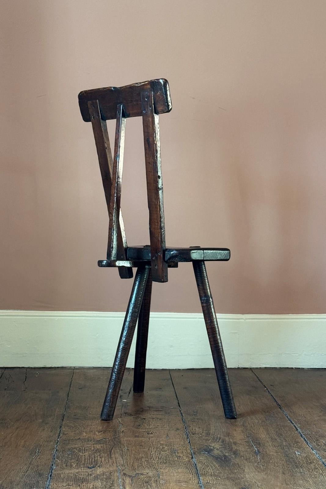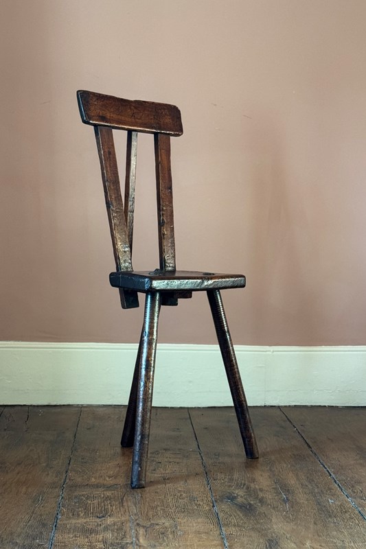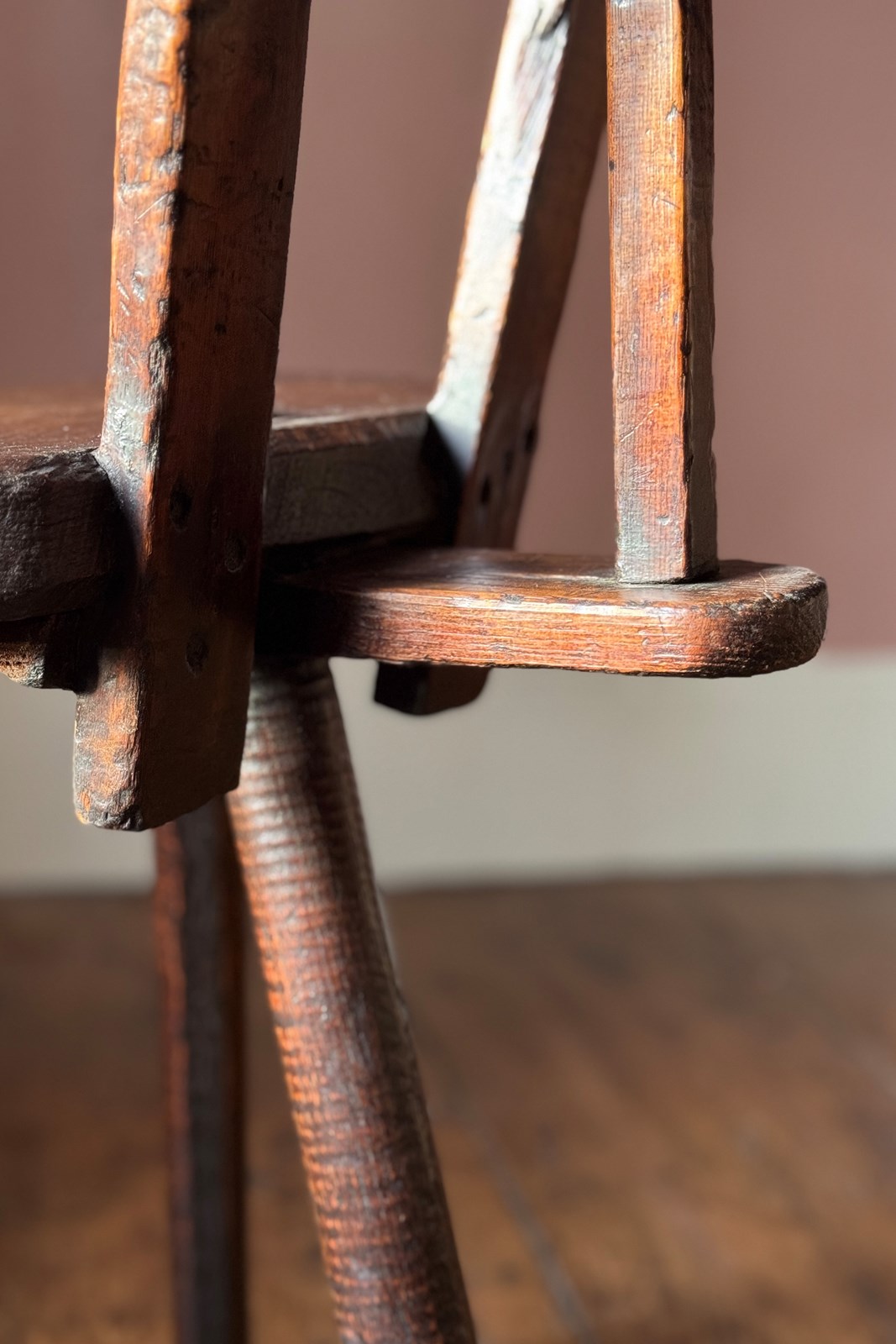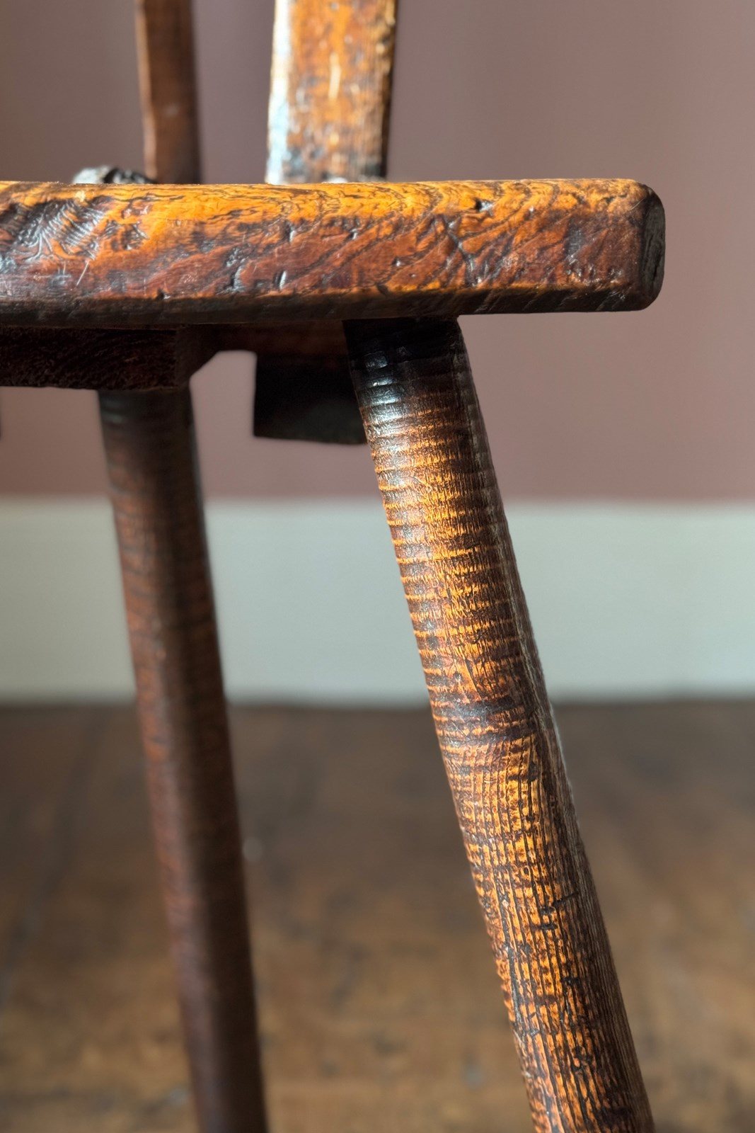 A beautiful and highly sculptural 19th Century elm and ash Cutlers stool with added backrest. This is a remarkable object with a unique story to tell. Originally a stool used in a cutlery factory in Sheffield, at some point during its early working life someone added a backrest for comfort. Not only does this give an insight into the life of this individual object but also illustrates an earlier history of the development of stools into chairs. The resulting chair is a striking object, with fantastic colour and patina, and a beautiful and unusual shape.
