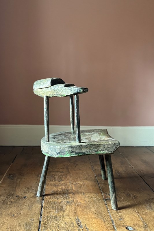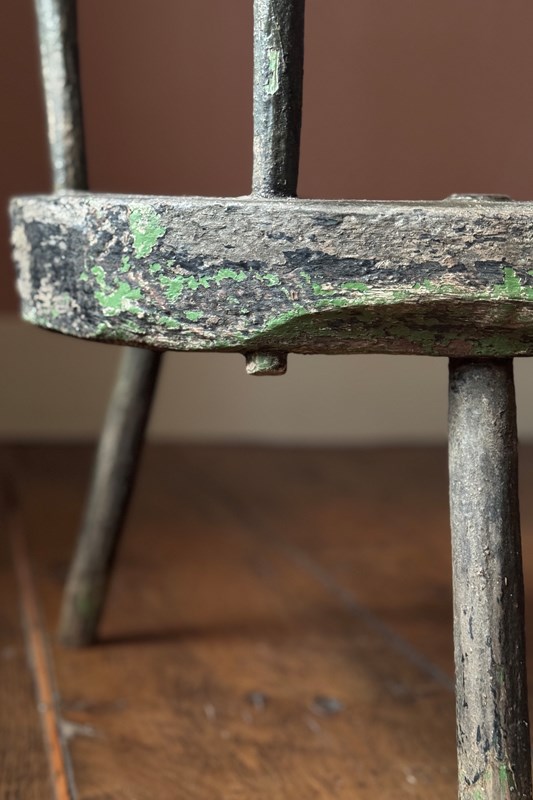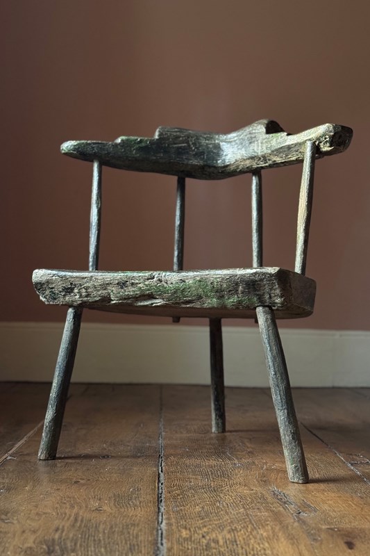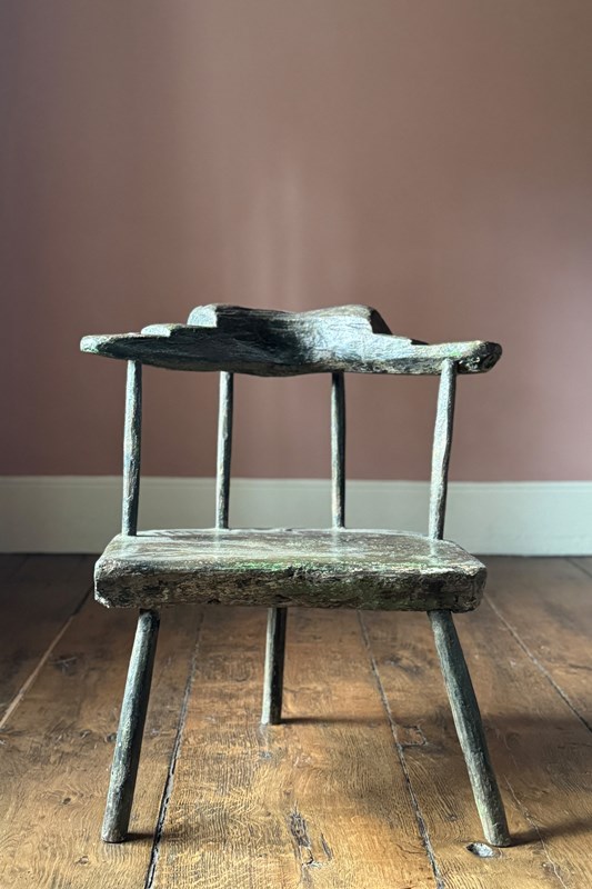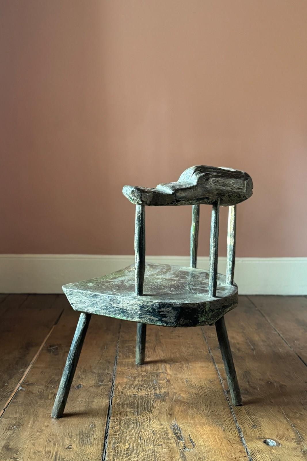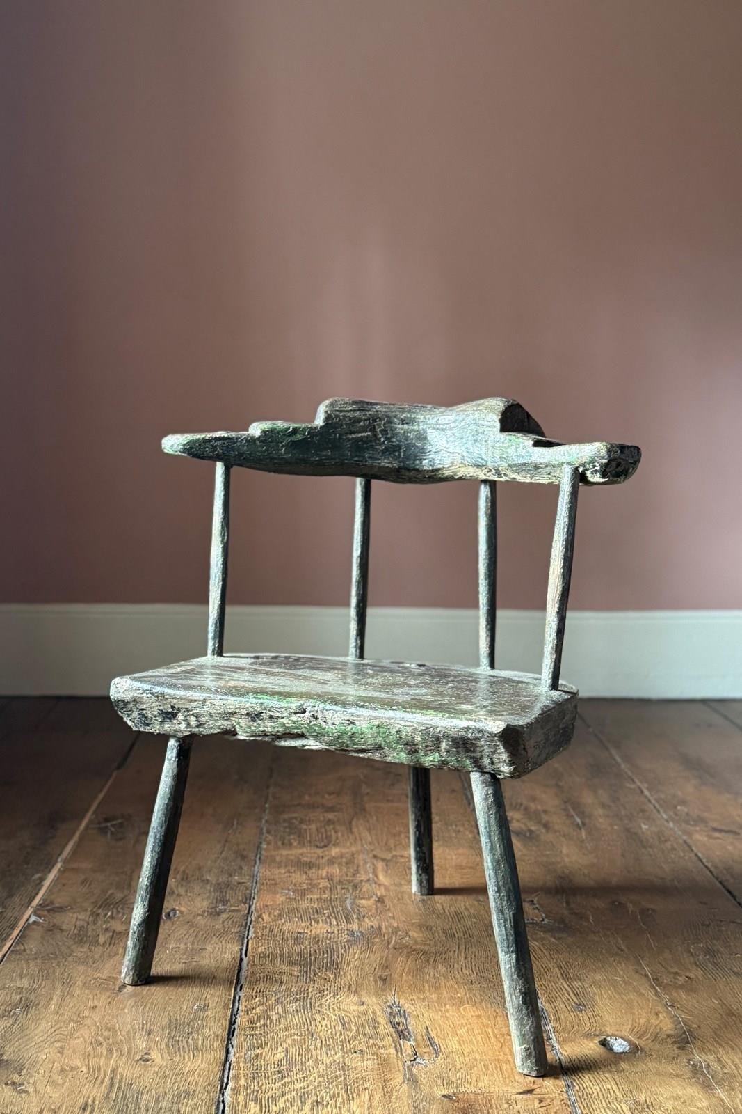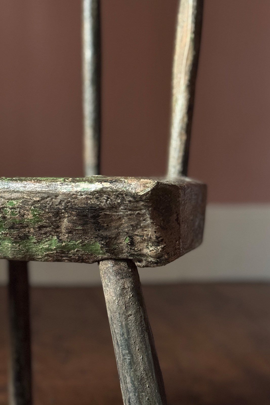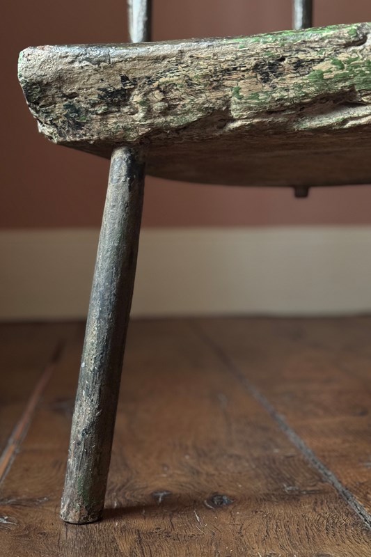 An outstanding three legged 18th Welsh stick chair. This has got everything we could want from a chair. It’s primitive, chunky, on three legs, has a real presence and sense of history, beautiful remnants of old green paint, it’s large, comfortable and sturdy, totally original, and very very beautiful. It’s as good as it gets in primitive furniture and it could be a long time before we find another of similar quality.
