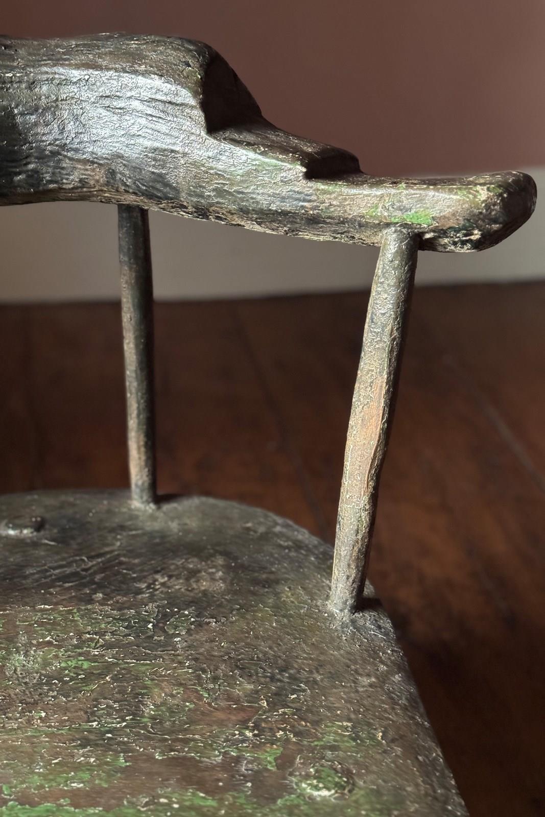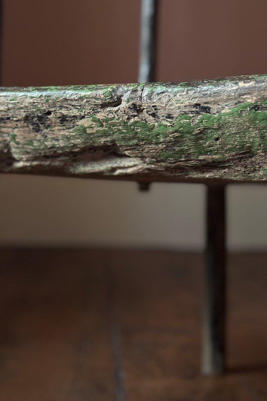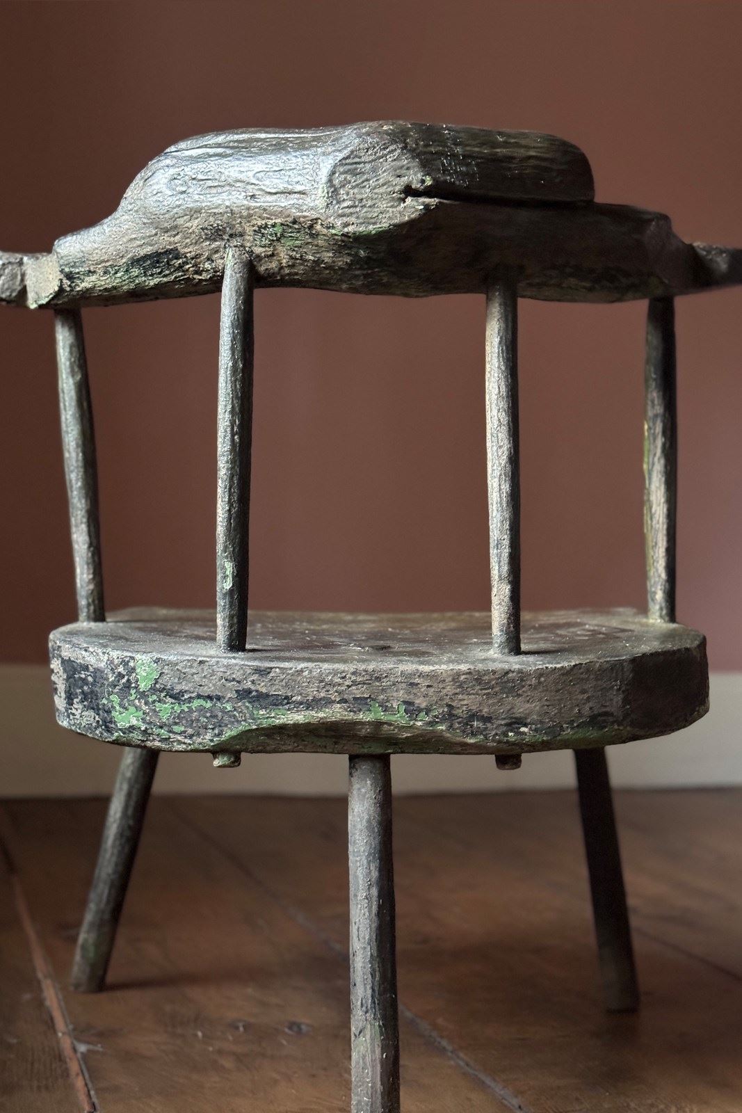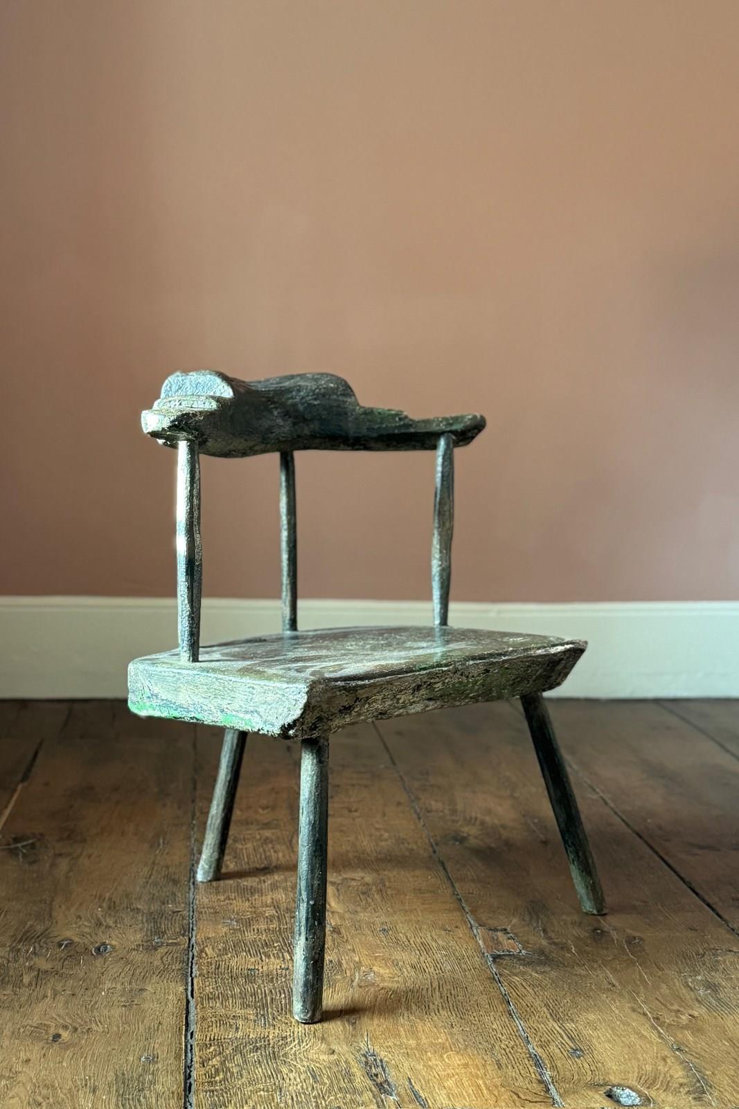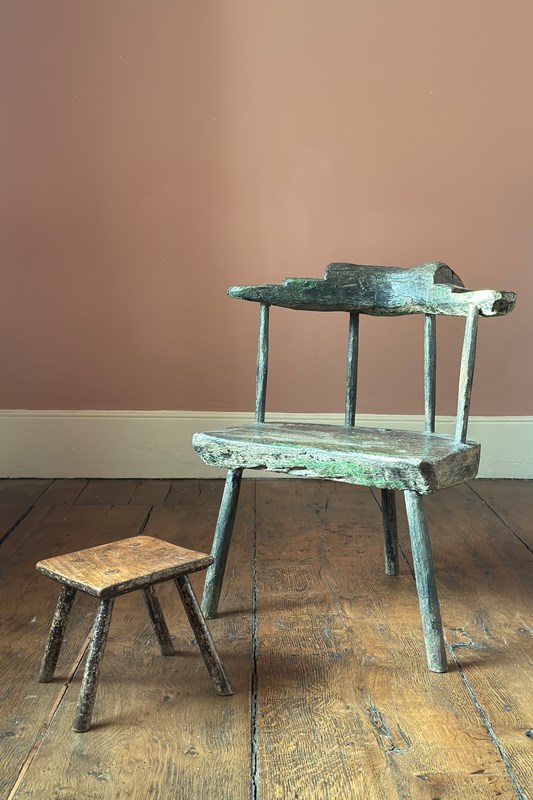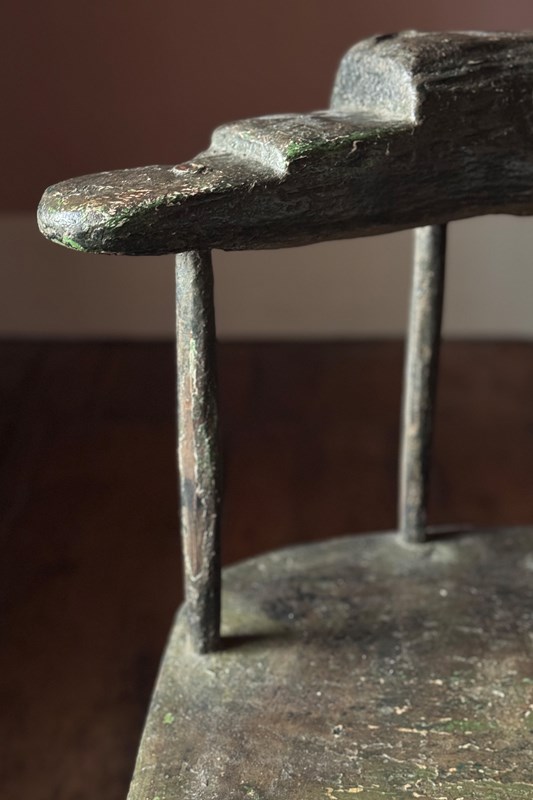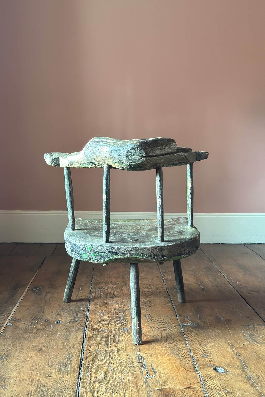 An outstanding three legged 18th Welsh stick chair. This has got everything we could want from a chair. It’s primitive, chunky, on three legs, has a real presence and sense of history, beautiful remnants of old green paint, it’s large, comfortable and sturdy, totally original, and very very beautiful. It’s as good as it gets in primitive furniture and it could be a long time before we find another of similar quality.
