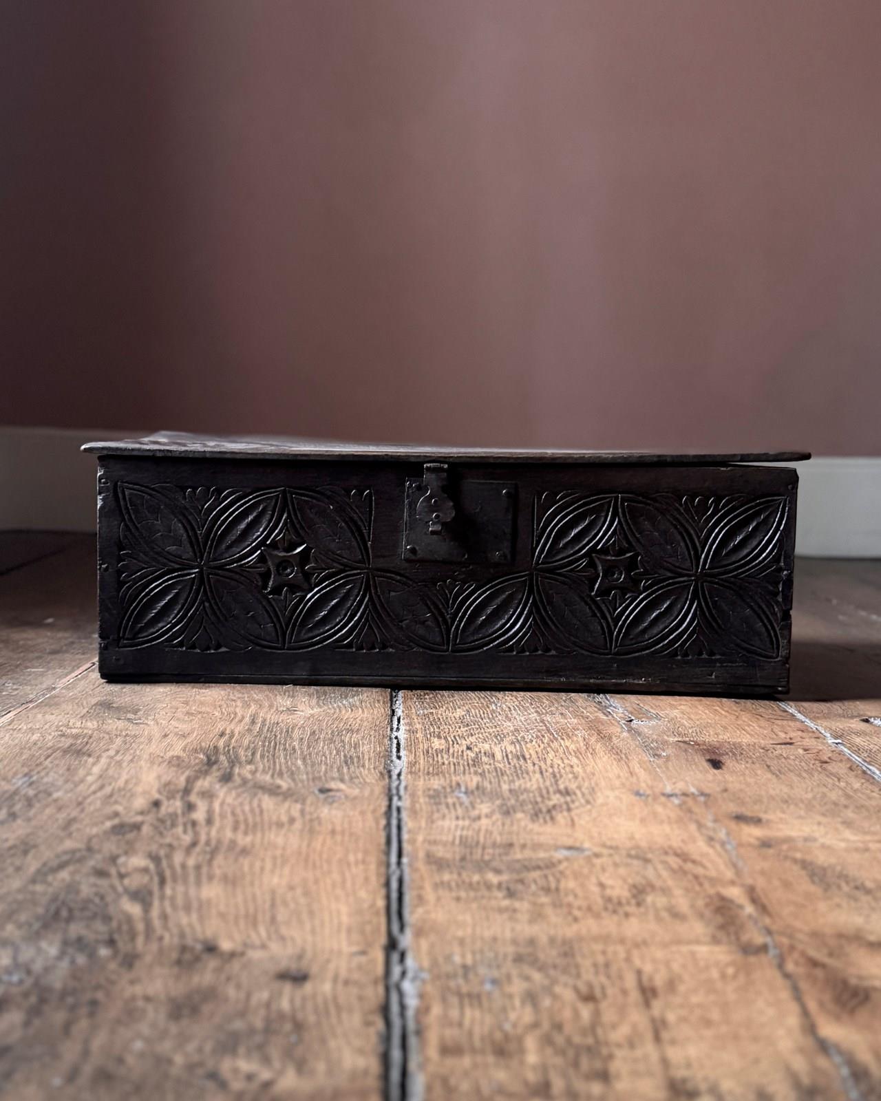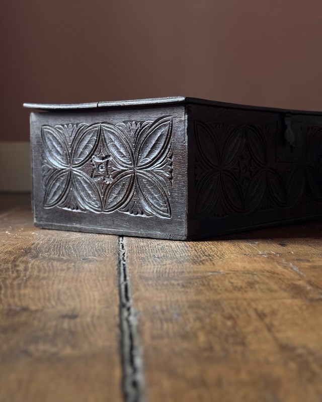 An attractive 17th Century oak coffer with carved decoration to three sides. A nice small size with fantastic rich colour from centuries of use. A lovely object.