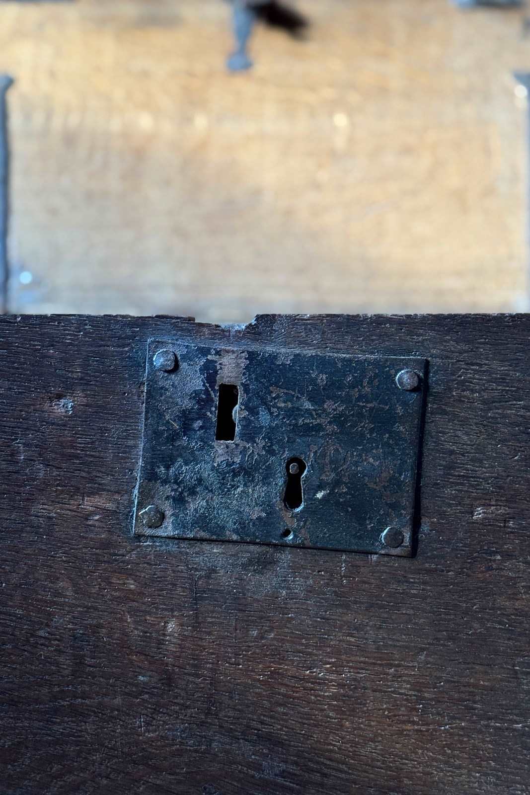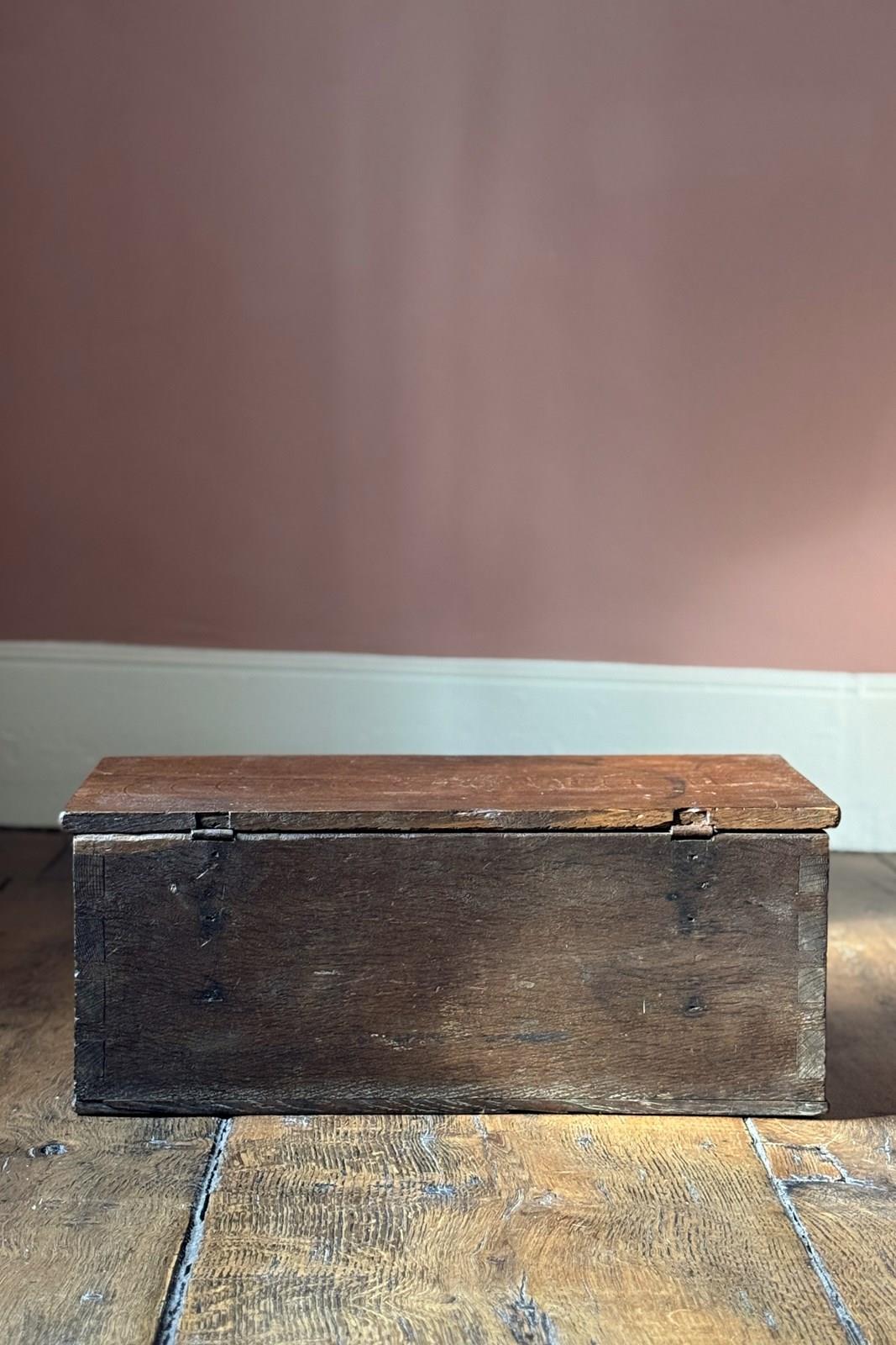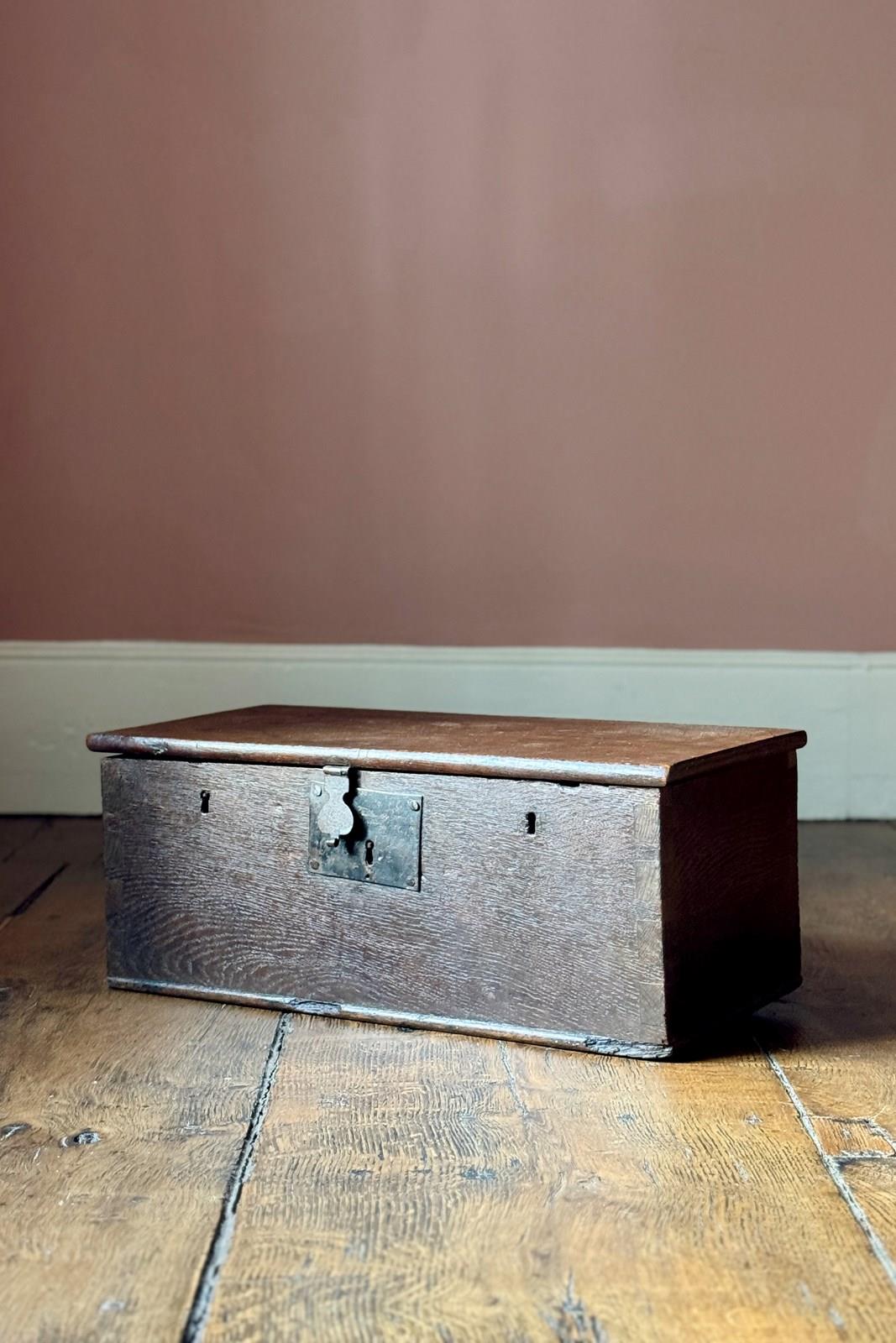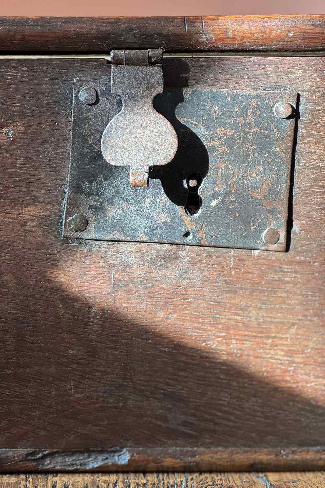 A small 18th Century oak church wardens chest made with thick planks. Sometimes it’s the simplicity of an object which appeals to us and makes it special. There is something beautifully honest and humble about this one which has had centuries of service.