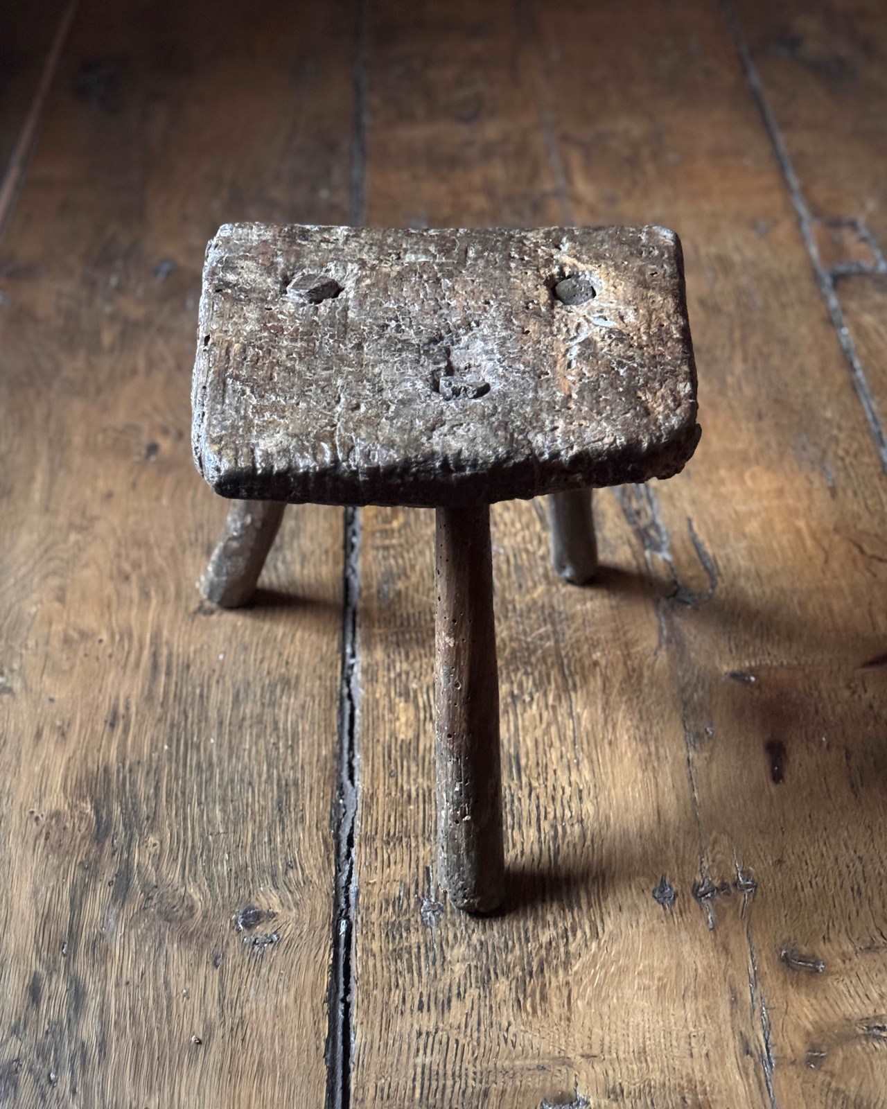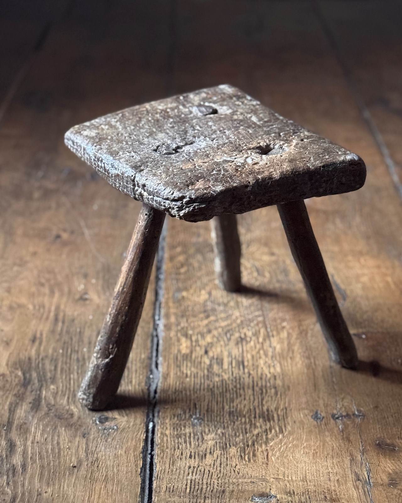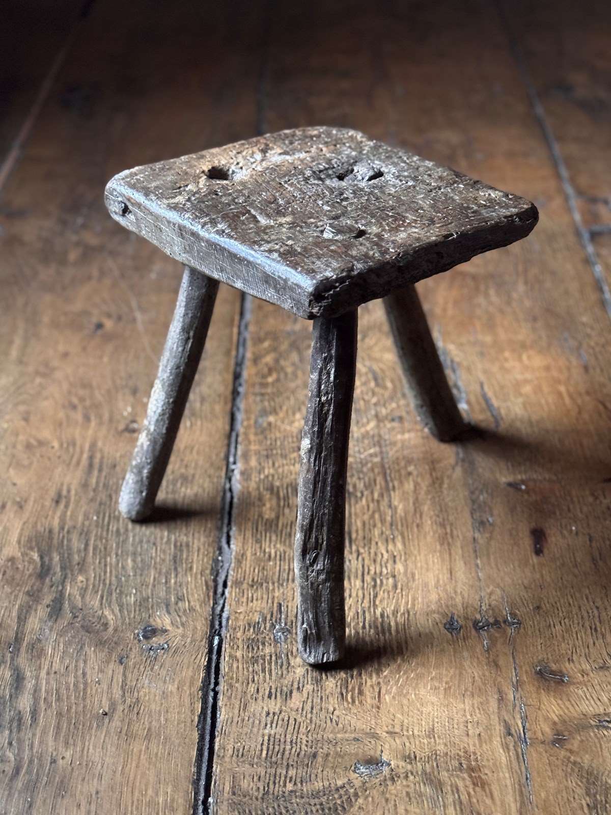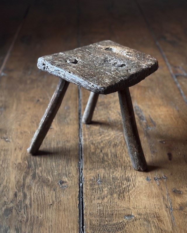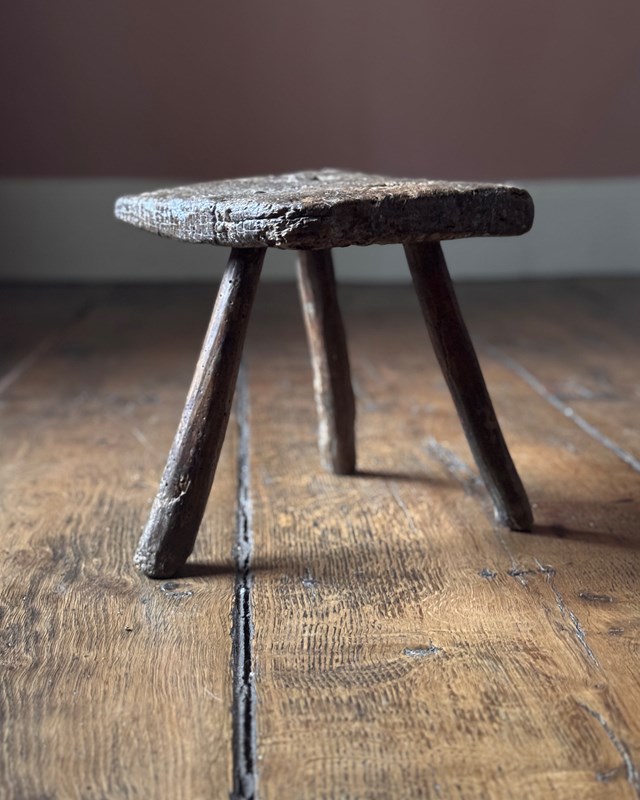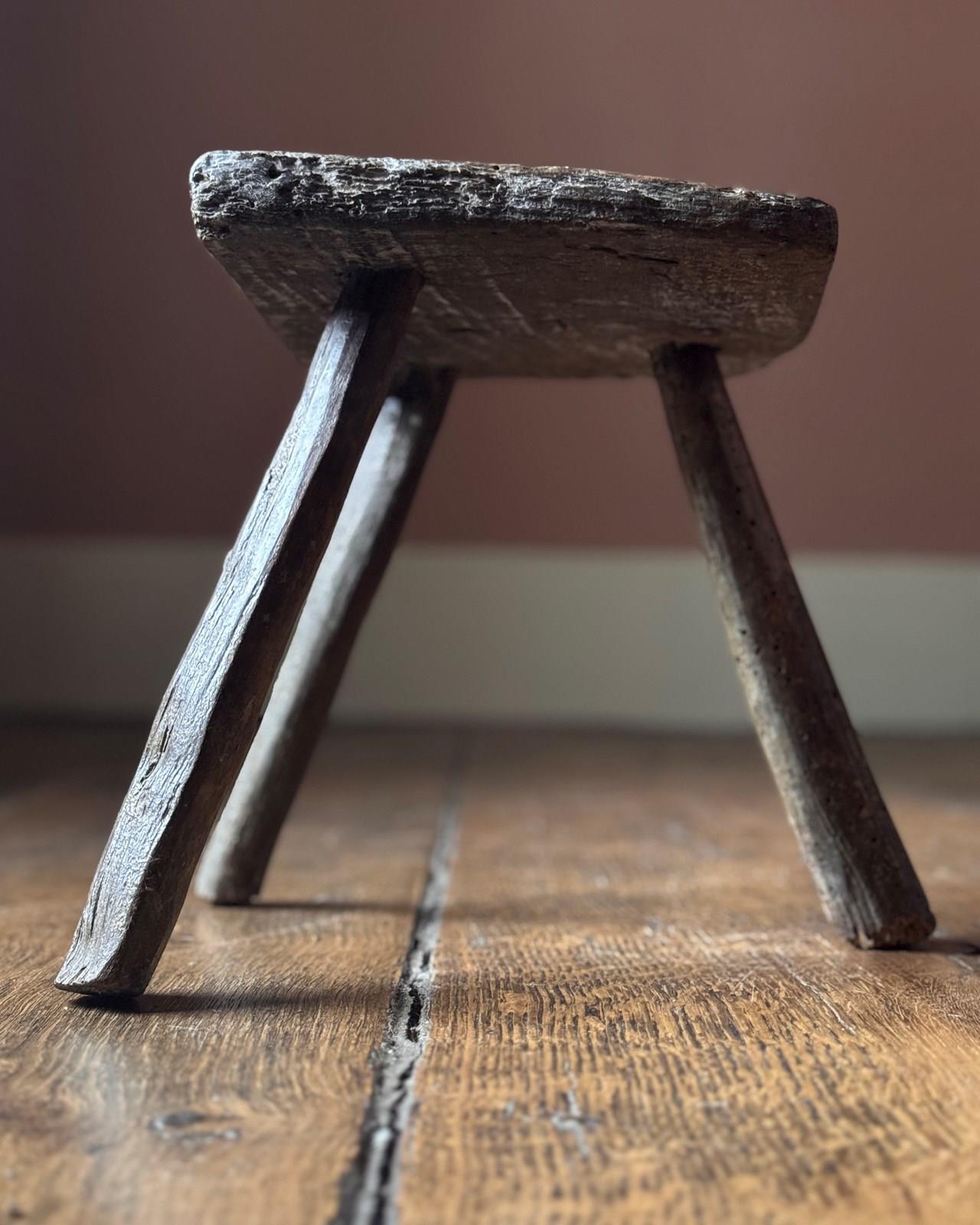 A very charming 18th Century Welsh milking stool with beautifully textured patina showing the history of use. With three splayed legs, it’s got a great shape to it.
