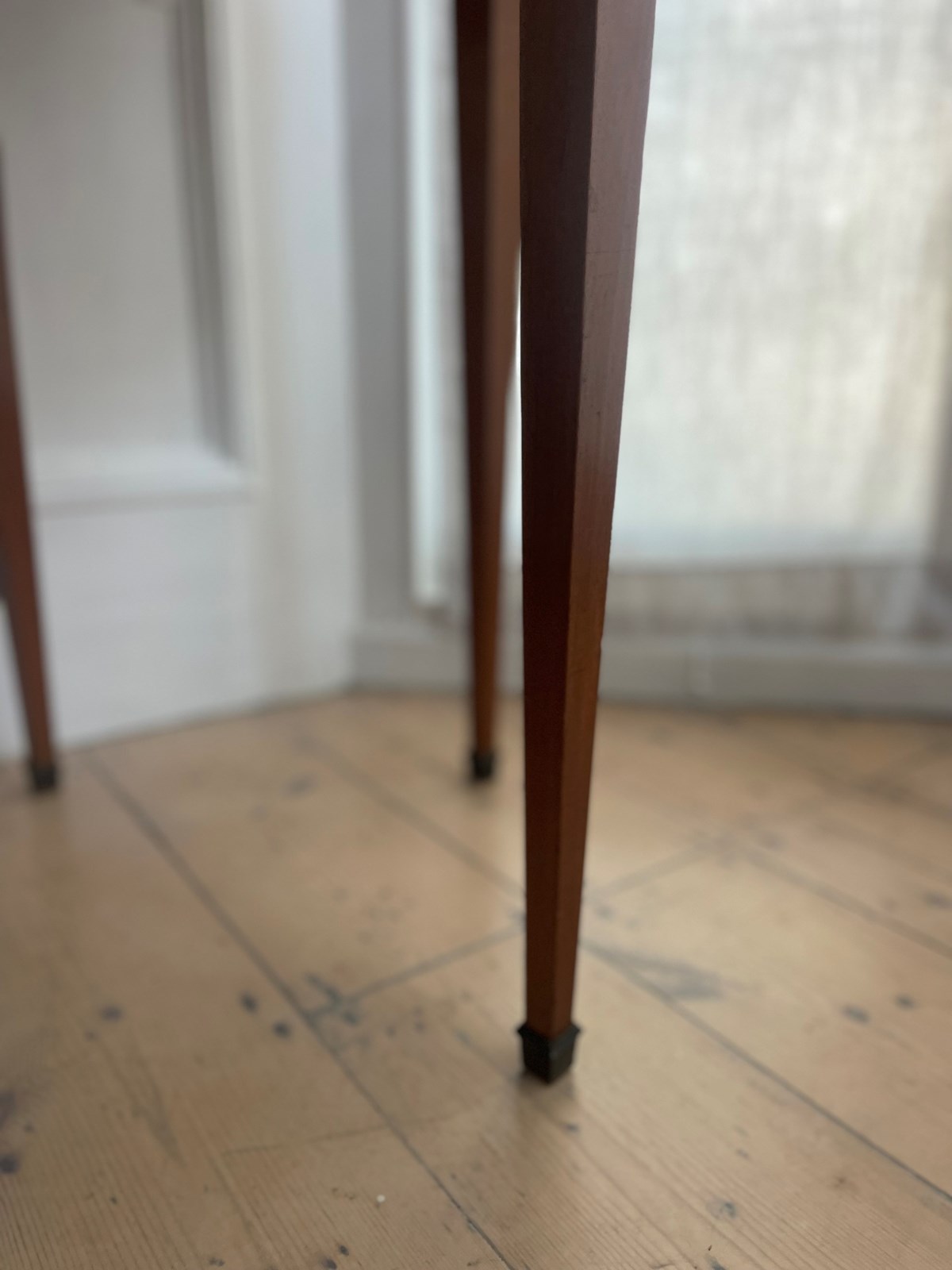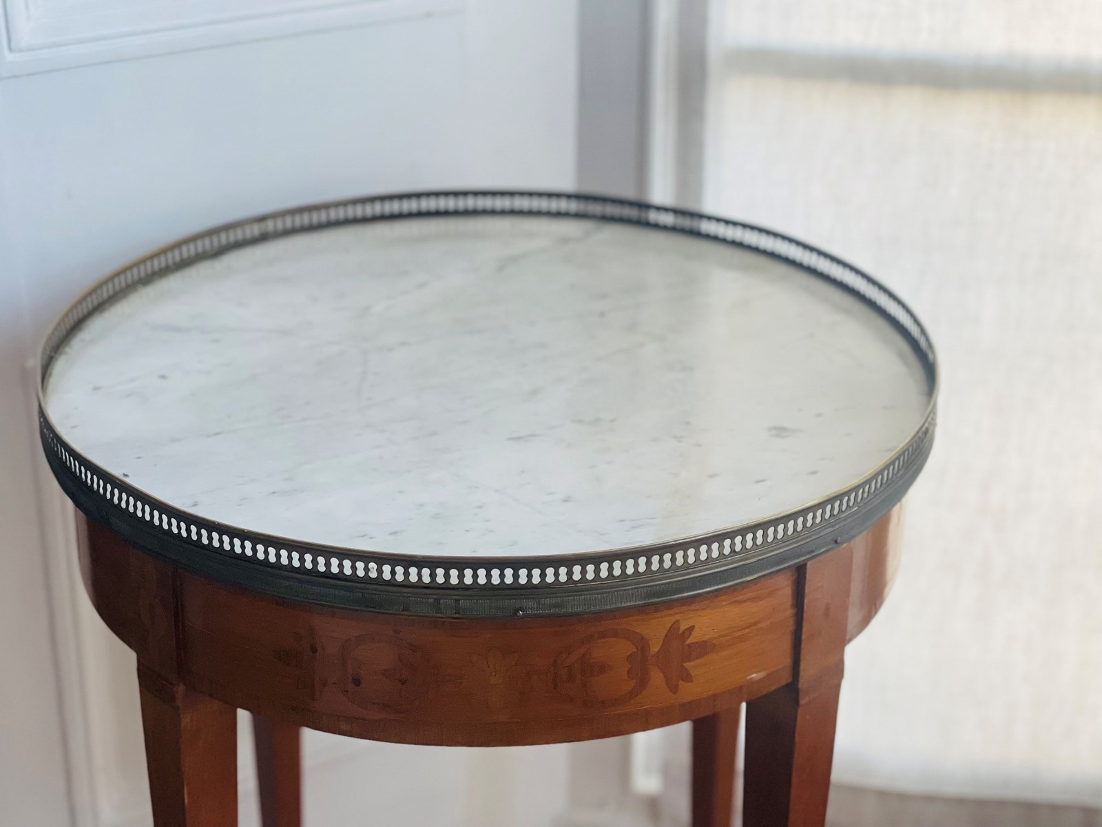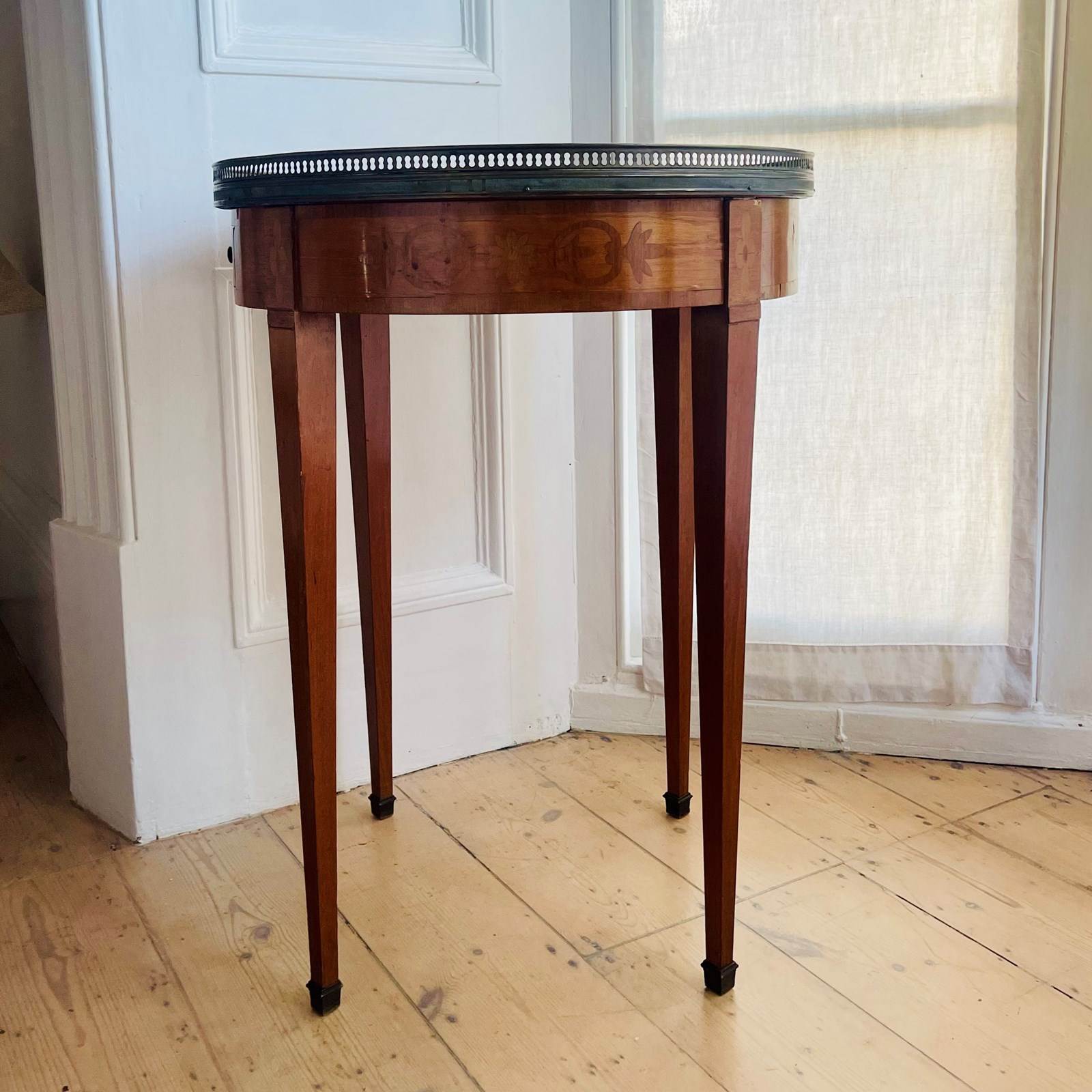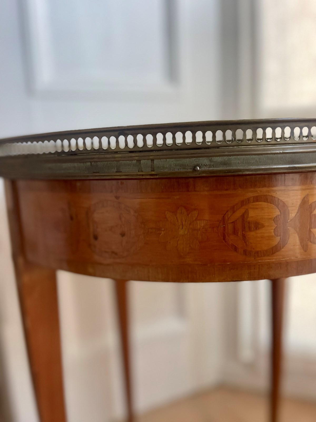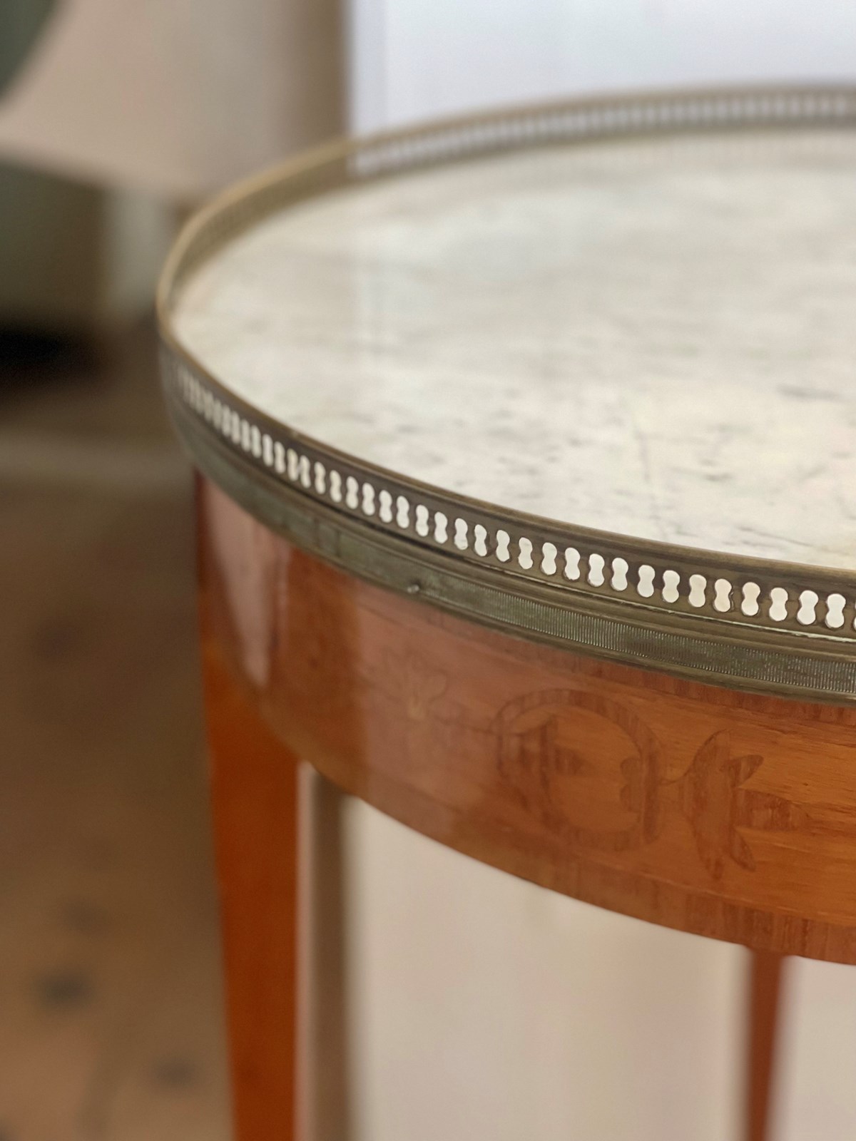 It has its lovely circular base with beautiful inlaid detail and a drawer.