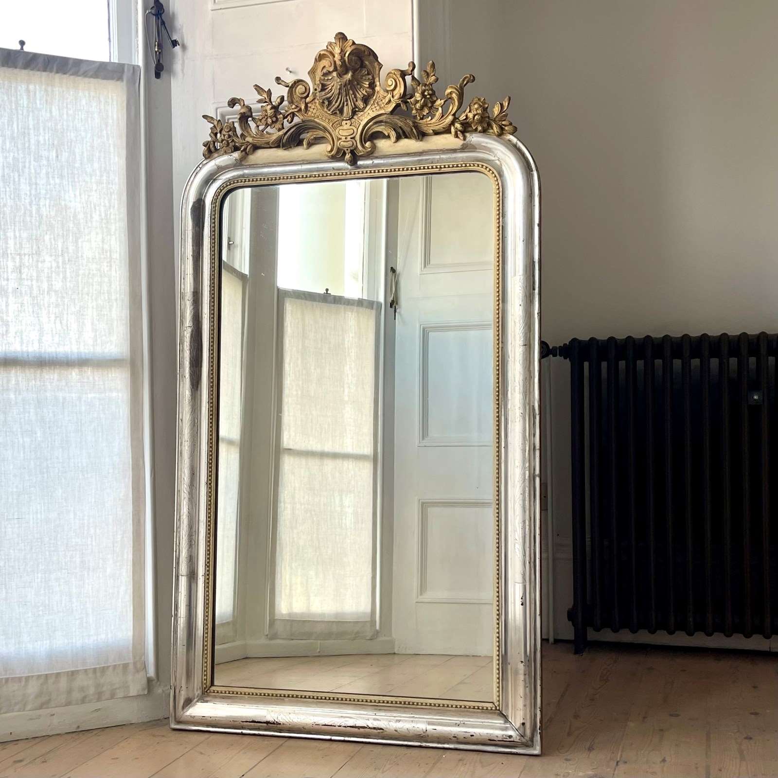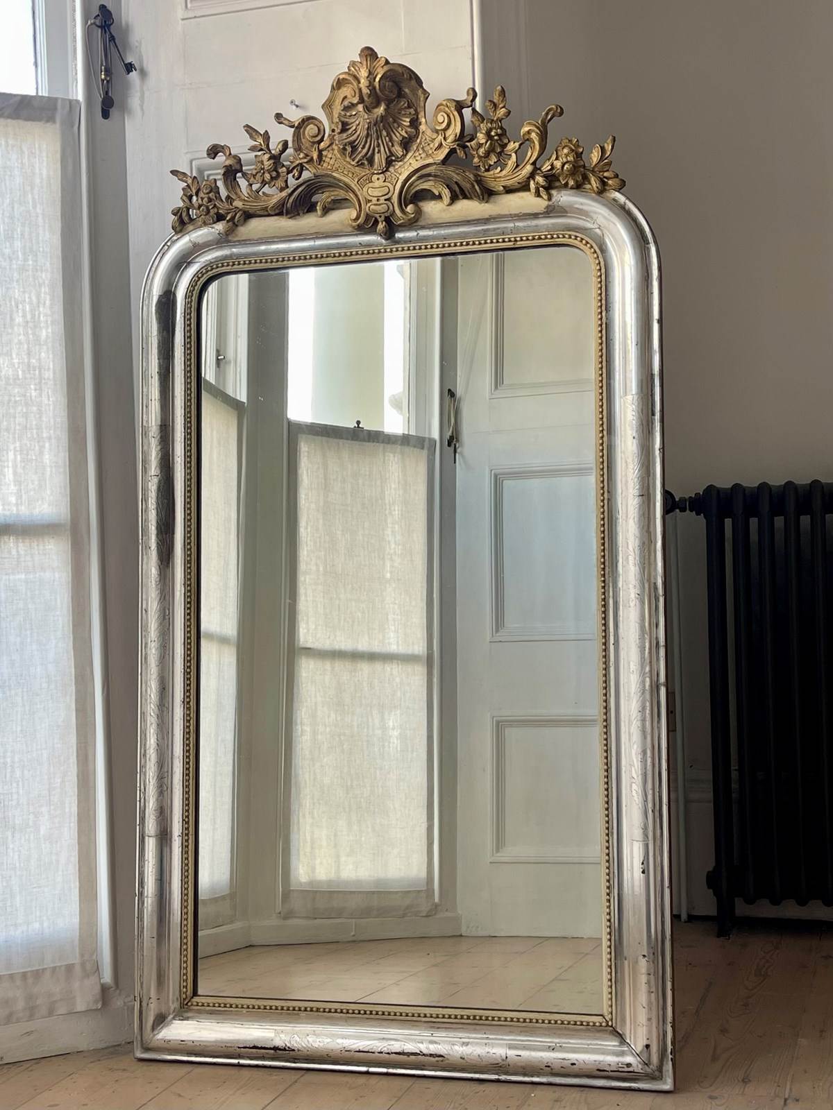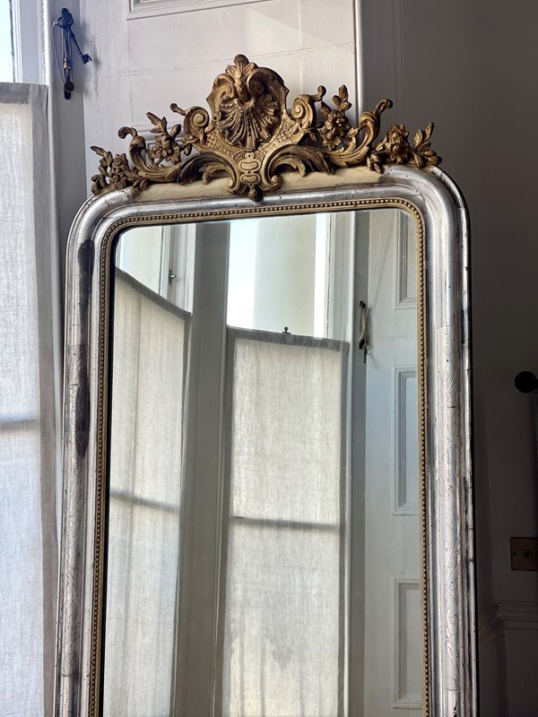 It has its orginal real silver gilt (silver leaf frame) and and an ornate gesso crest with lovely shell and floral detail. Silver gilt is more difficult to find.
