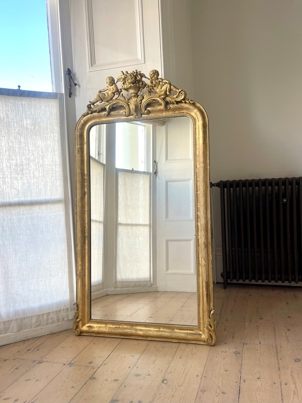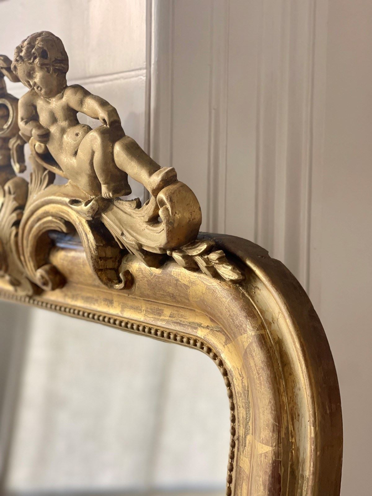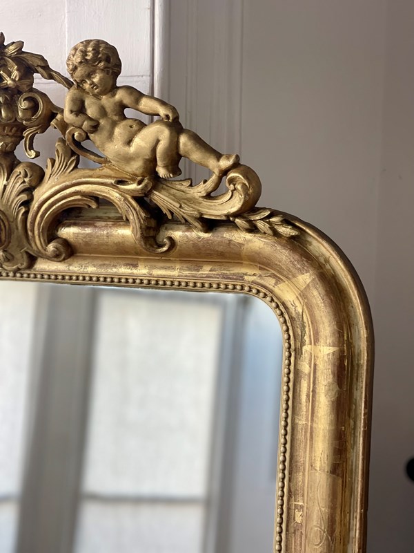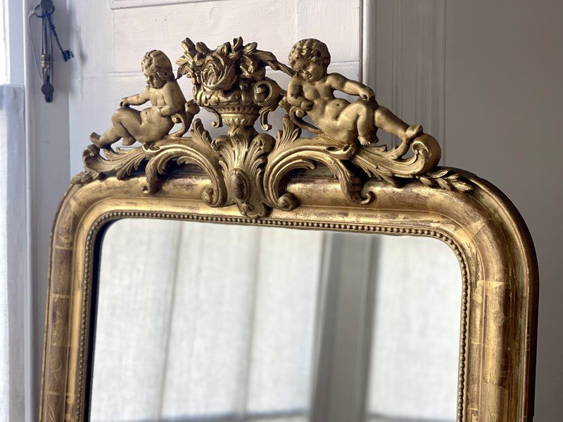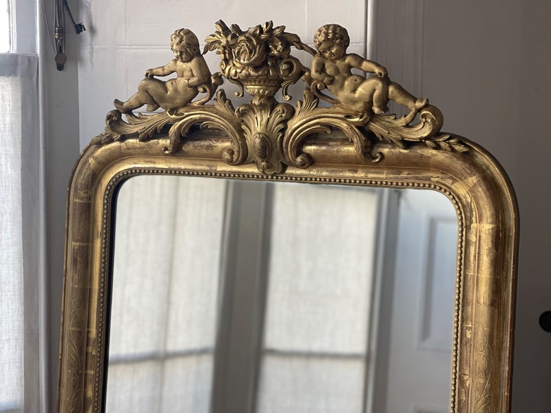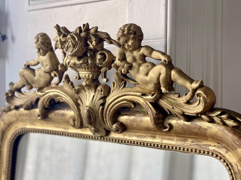 It has its beautiful real gilt (gold leaf) on gesso frame in a subtle etched floral design and a large crest with 2 gorgeous cherubs sitting either side of a floral basket. It also has 2 side scrolls. There are no chips to the frame.