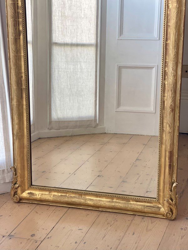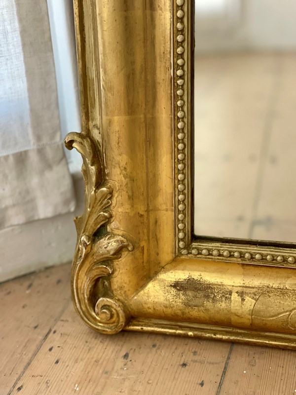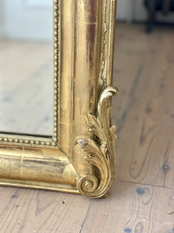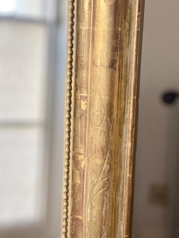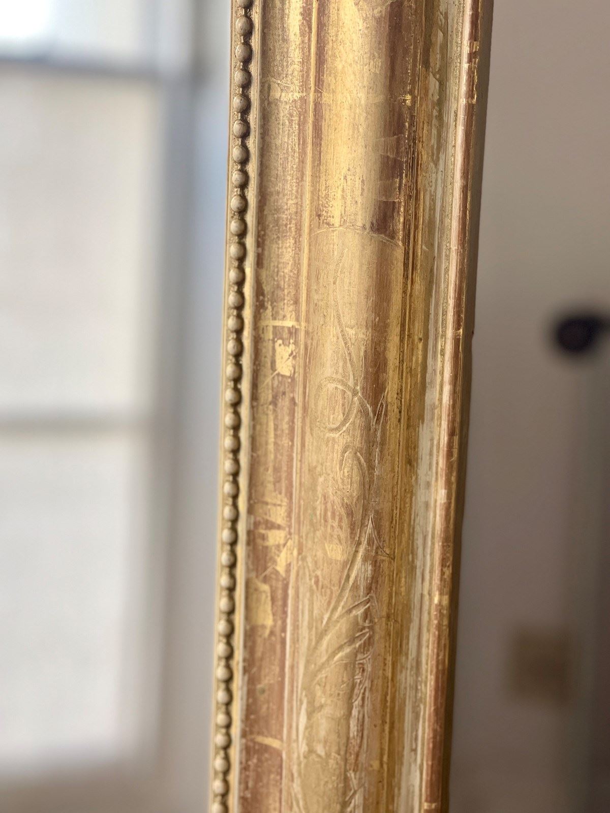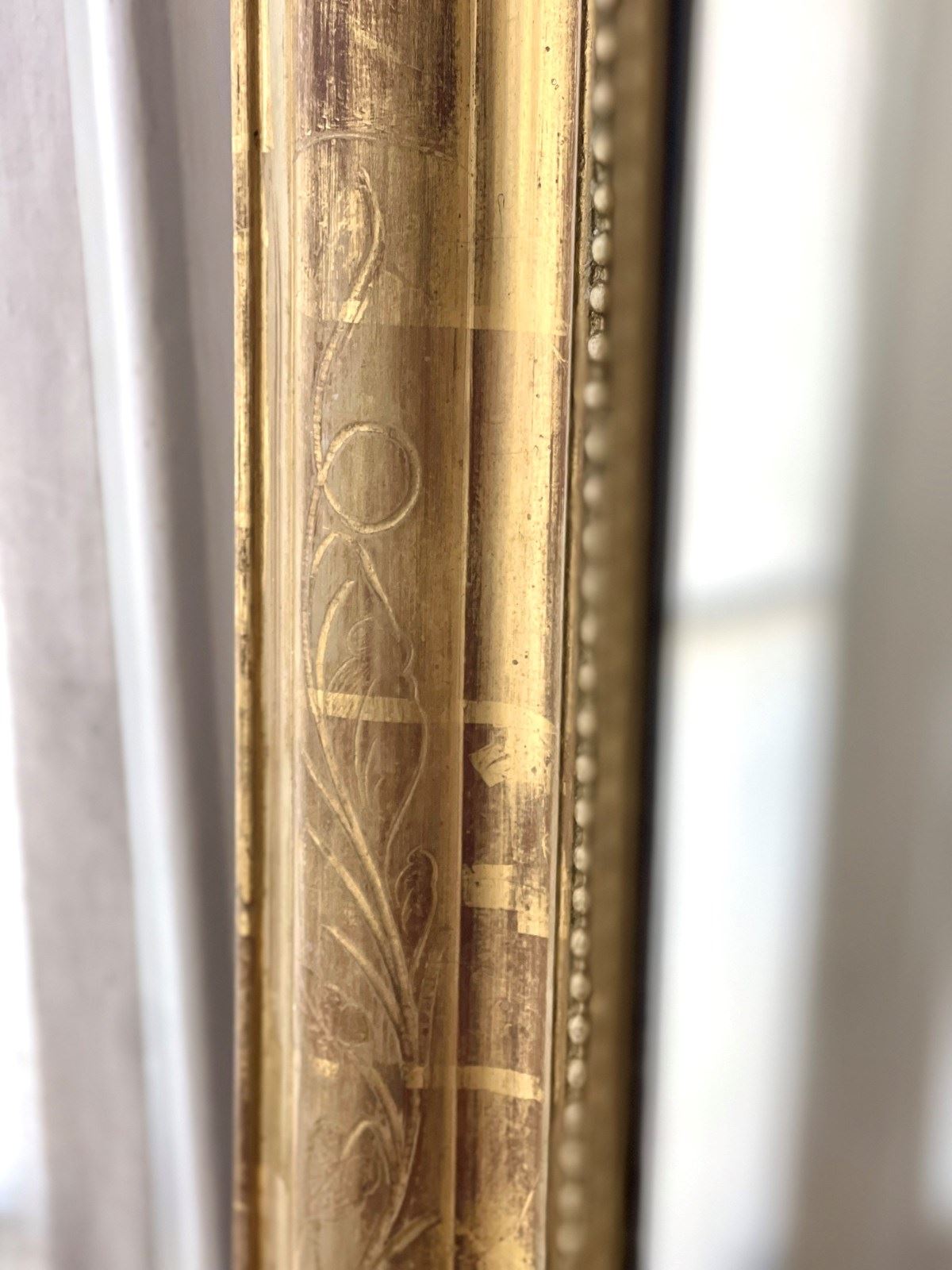 It has its beautiful real gilt (gold leaf) on gesso frame in a subtle etched floral design and a large crest with 2 gorgeous cherubs sitting either side of a floral basket. It also has 2 side scrolls. There are no chips to the frame.