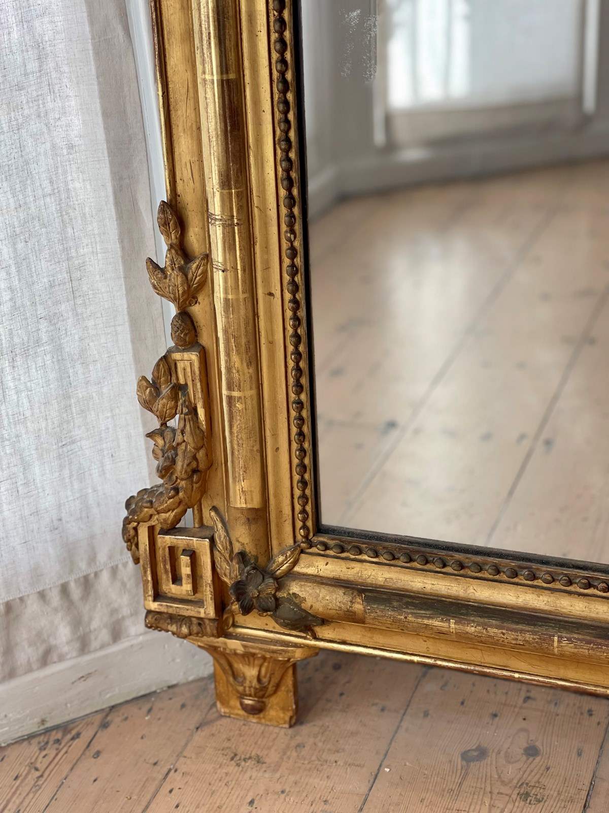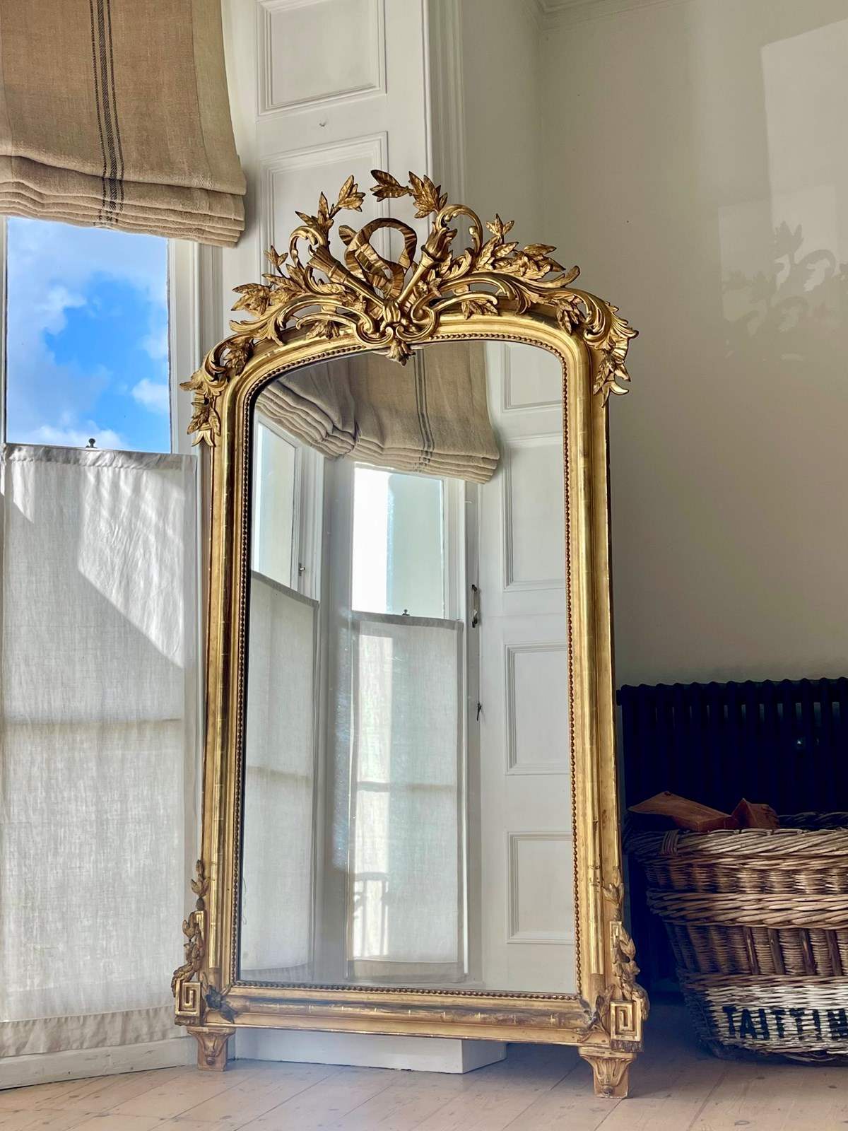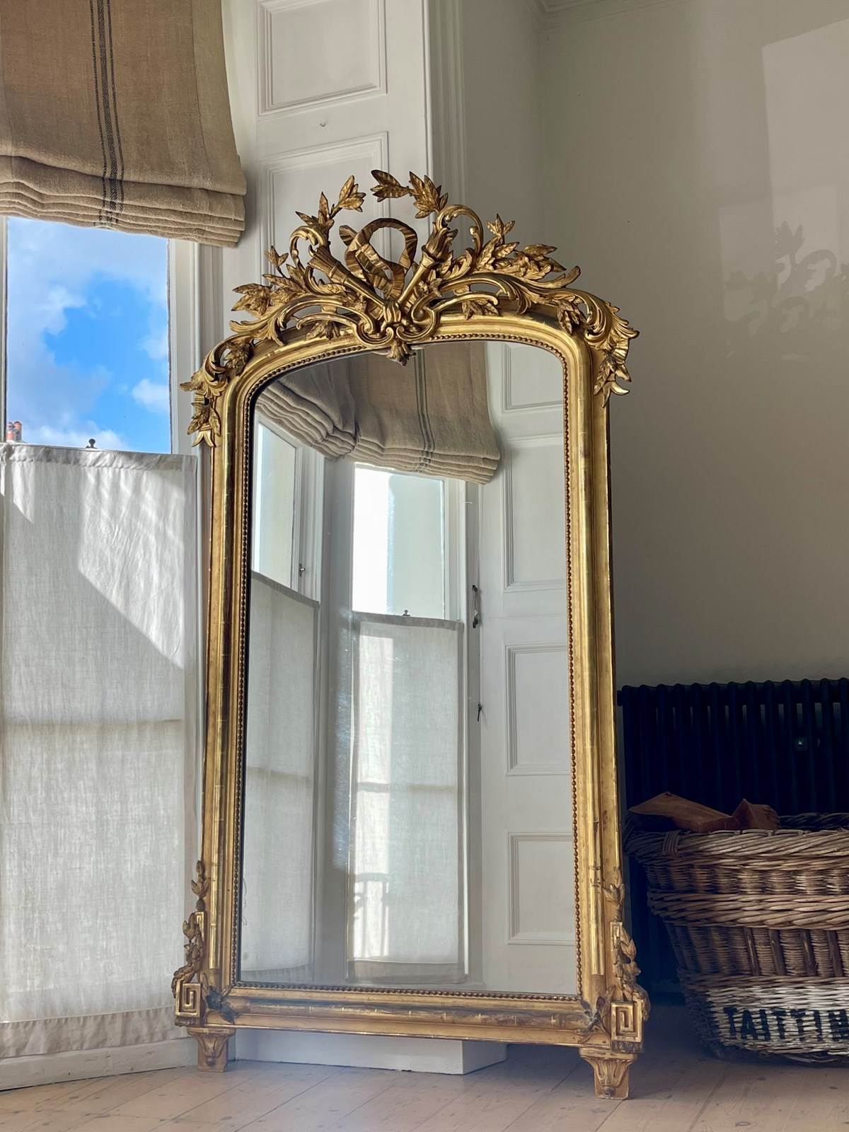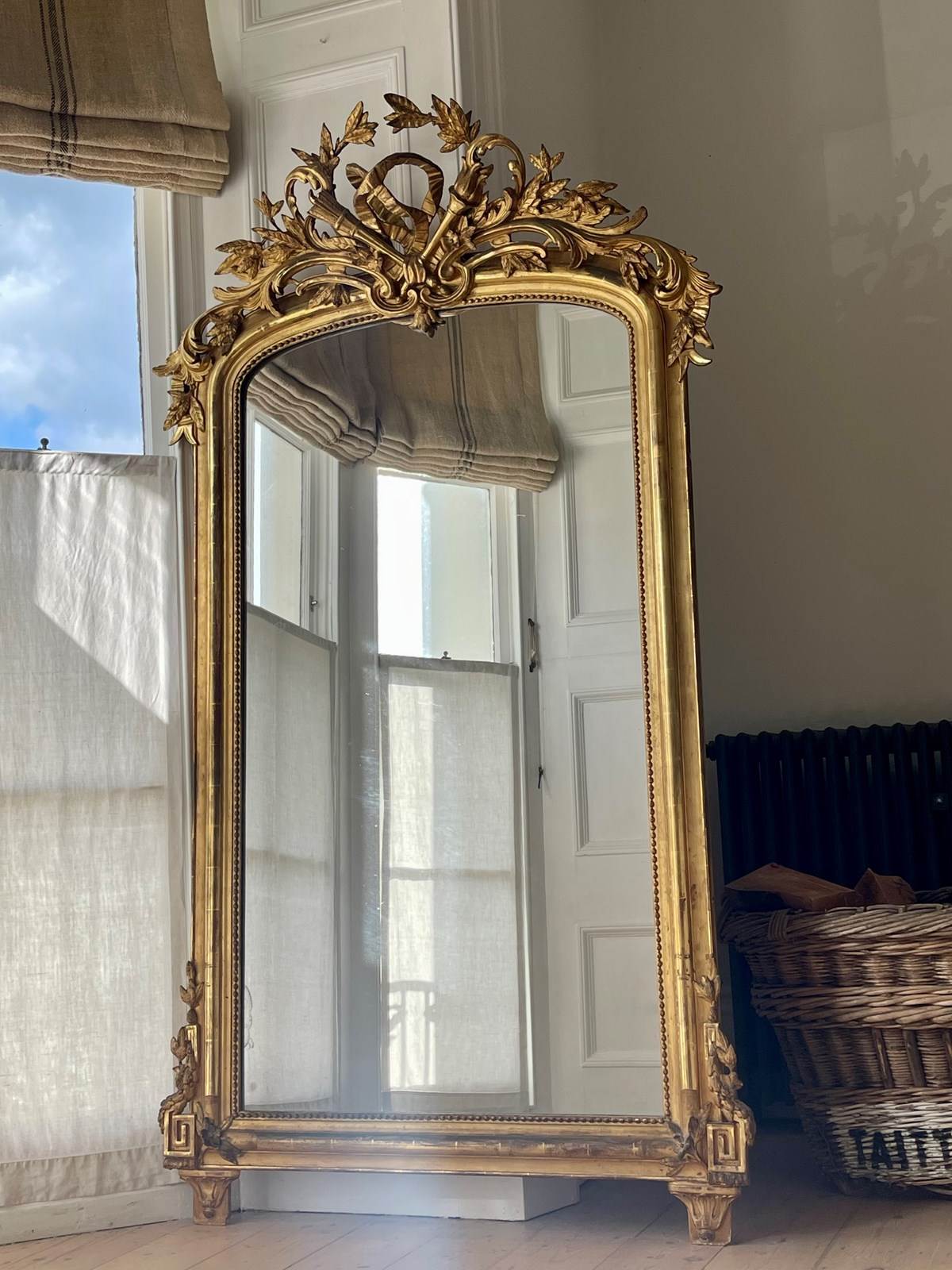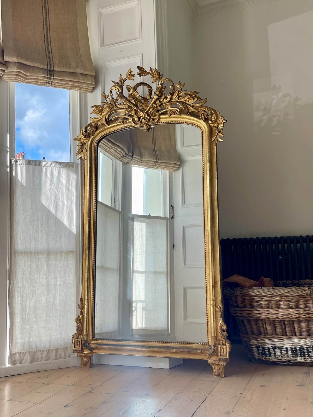 It would have been used as an overmantel in a grand, high ceilinged room but would look equally good as a freestanding leaner mirror as in the photo or hanging on a large wall.