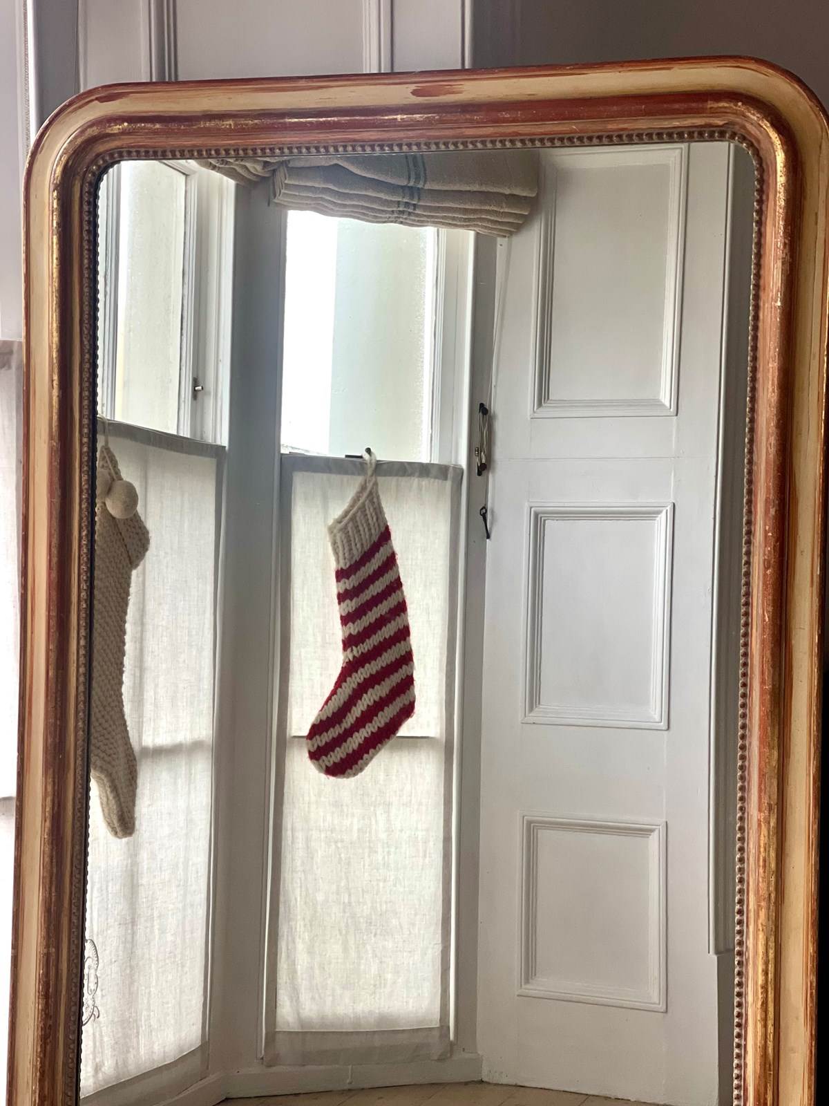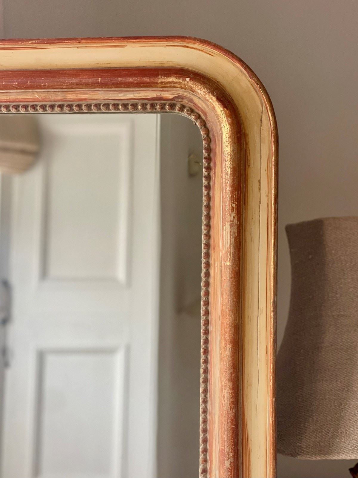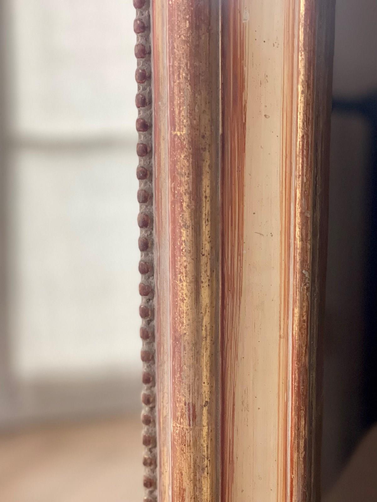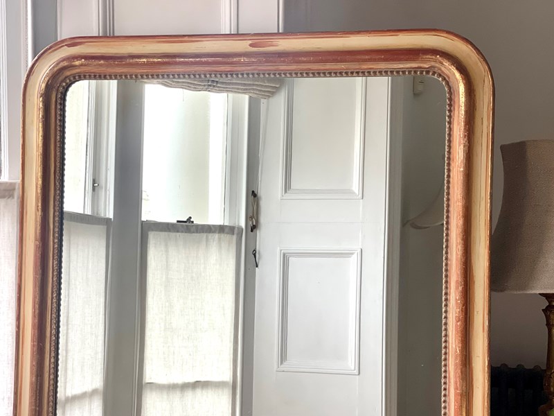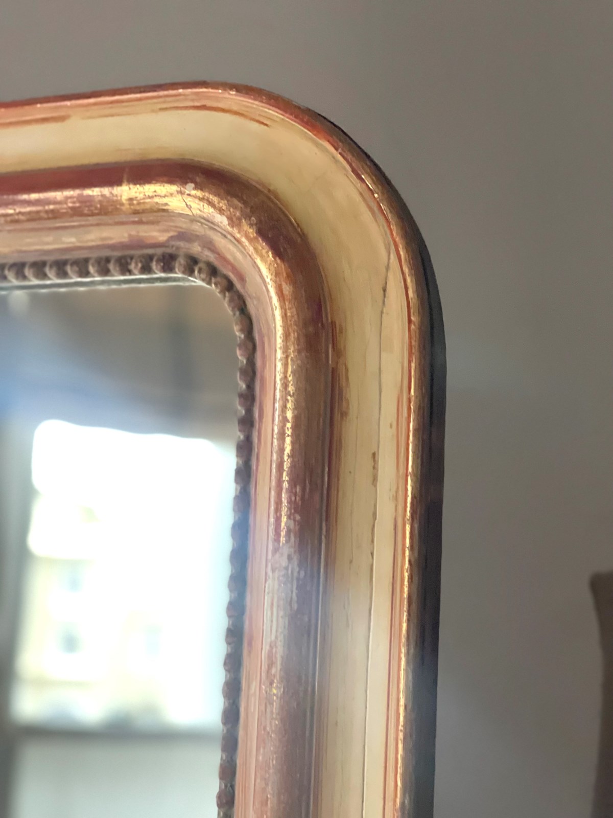 It has its beautiful worn real gilt on gesso frame with the reddish bole and bare gesso showing though. This is underneath all real gilt on gesso mirrors. This is a lovely more understated and relaxed look to a completely gilt mirror.