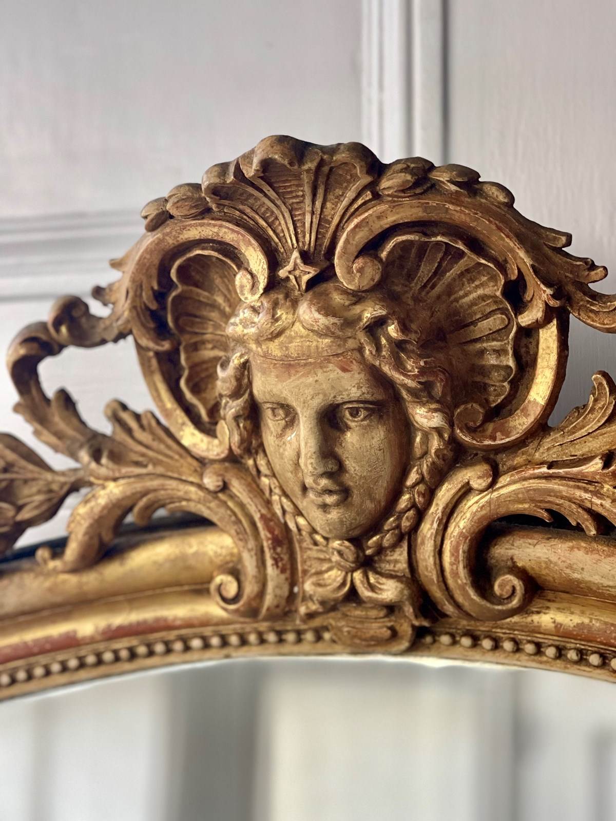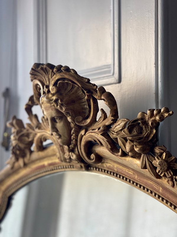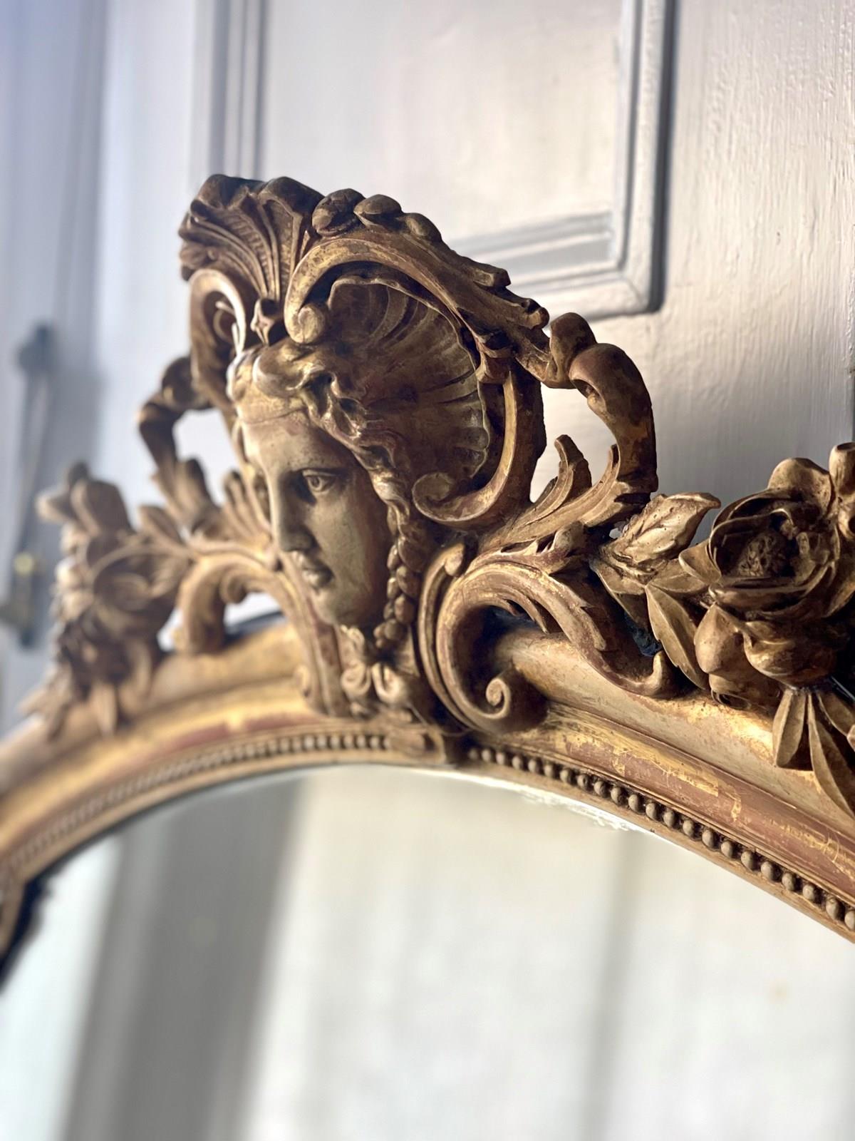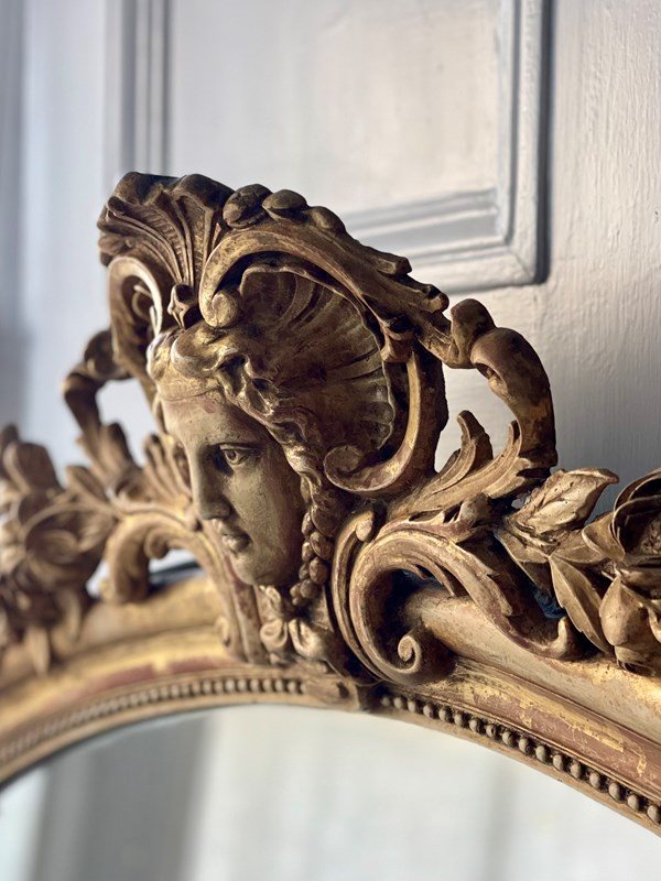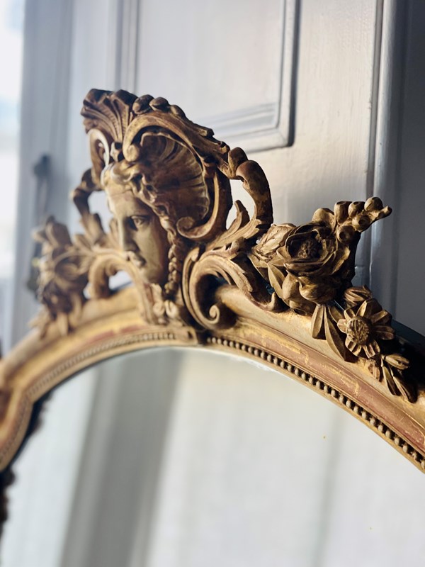 It dates from around 1880 and has its stunning real gilt ( gold leaf) on gesso frame with lovely ornate mask and floral crest and scrolls on either side at the top and bottom.